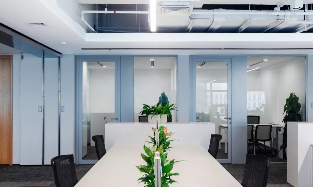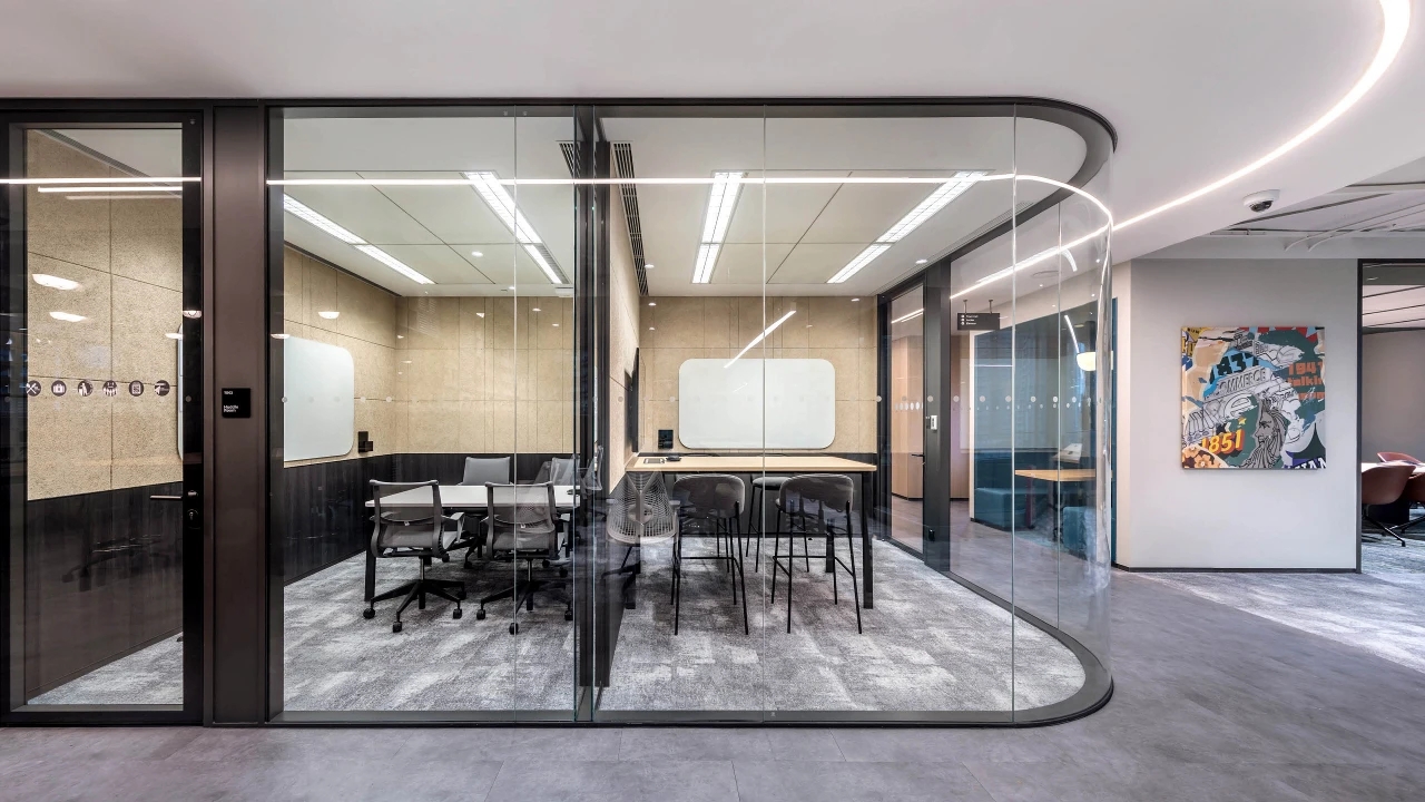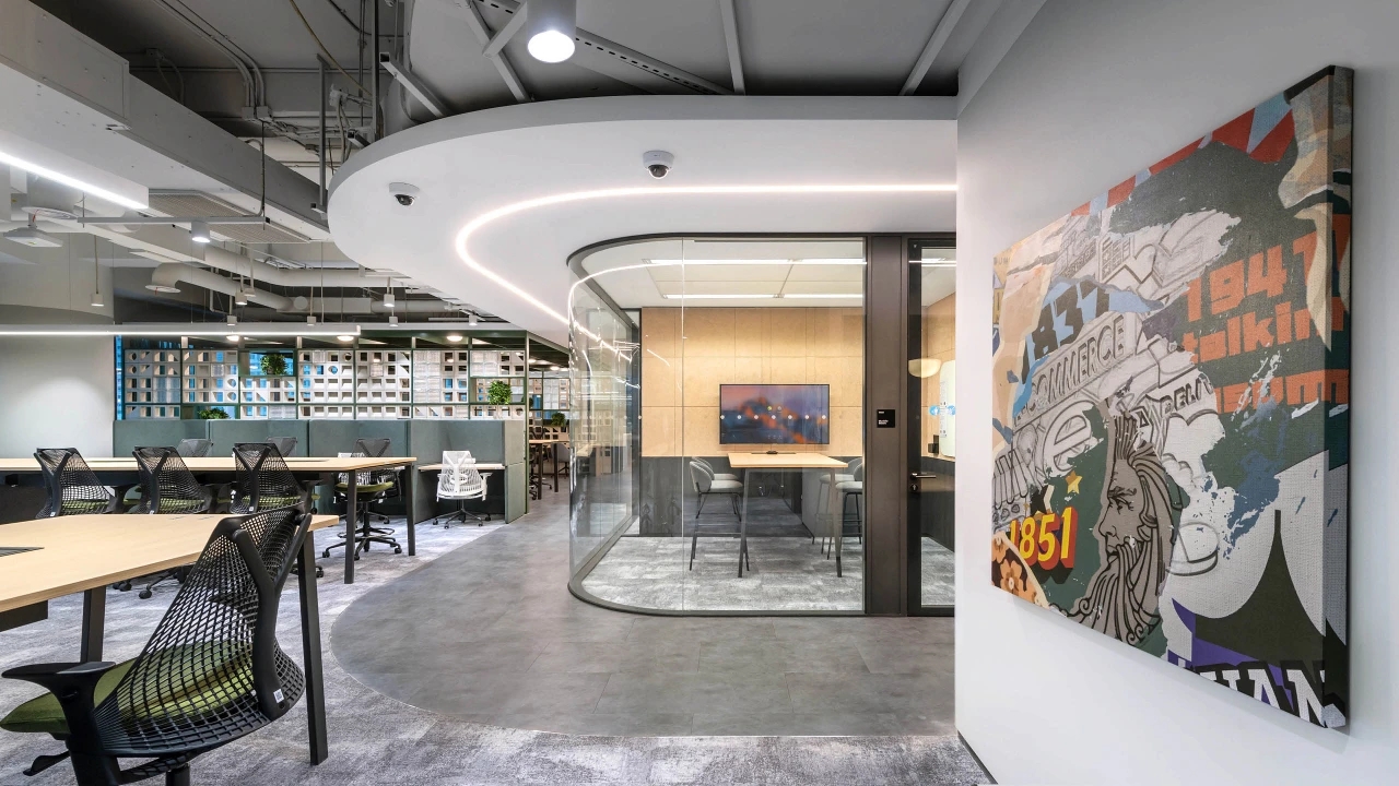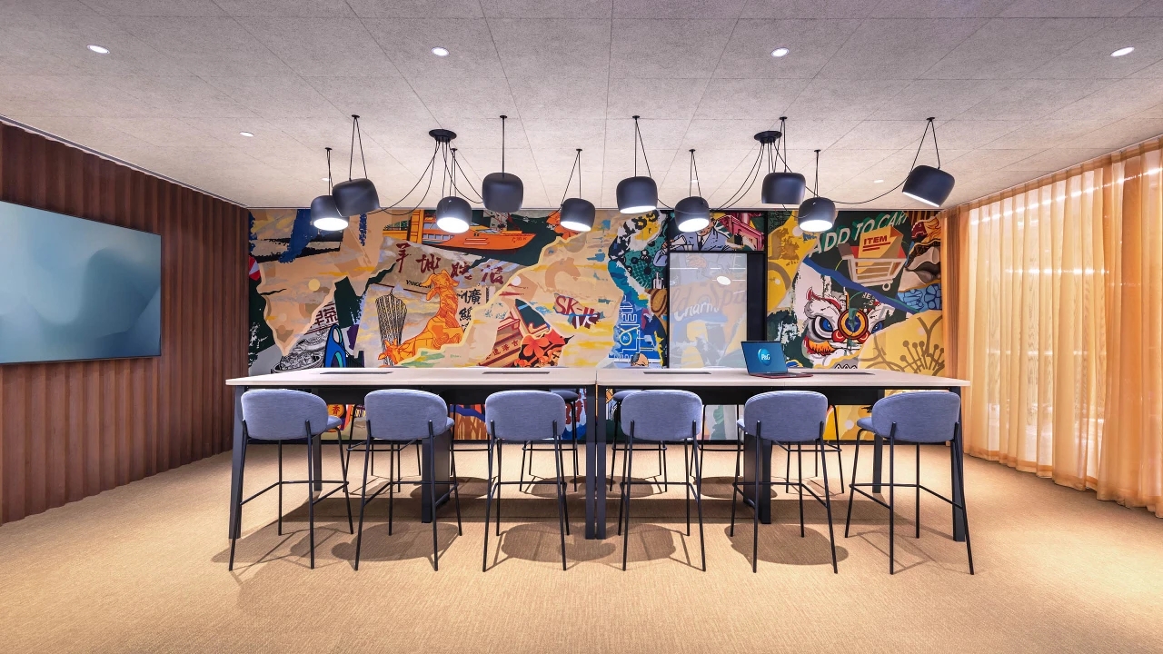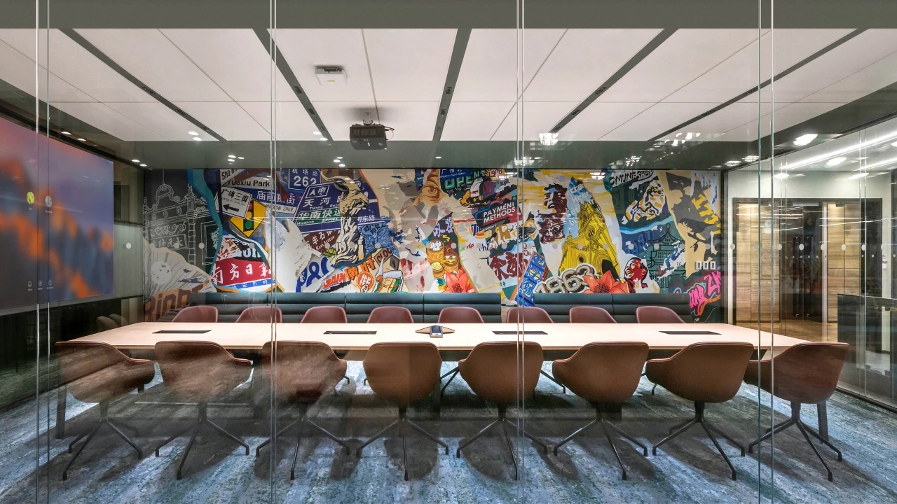 空间设计具有原始工业感,采用了铁锈处理的装饰板、玻璃块、水泥通风砖和木毛板等元素,与俏皮的霓虹灯图形形成对比。精心设计的图形和艺术为空间提供了最后一层色彩和能量。一幅大型的本地灵感手绘壁画是其中一个大型会议室的中心。从这幅壁画中选取的画廊印刷品则分散在整个楼层中。