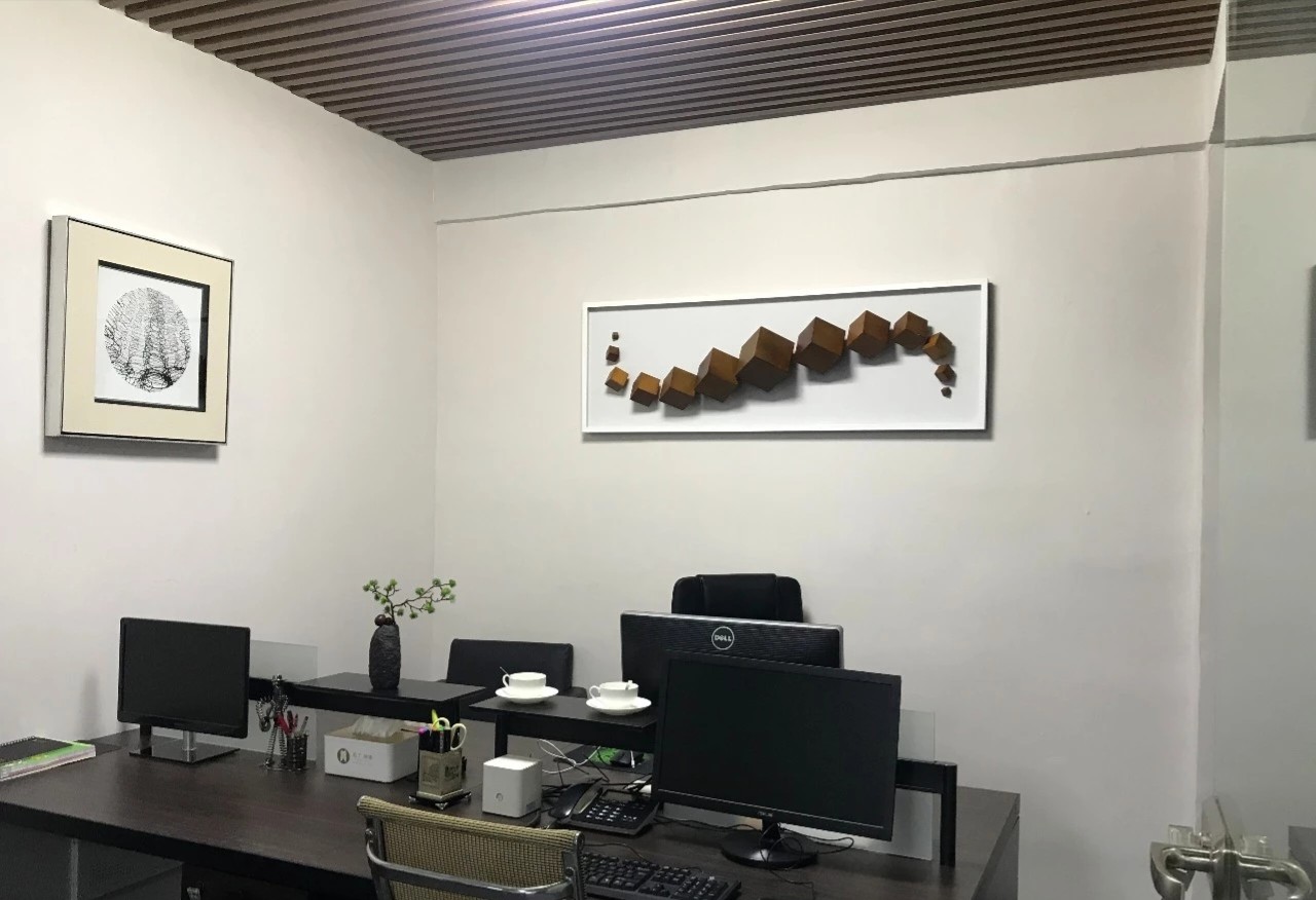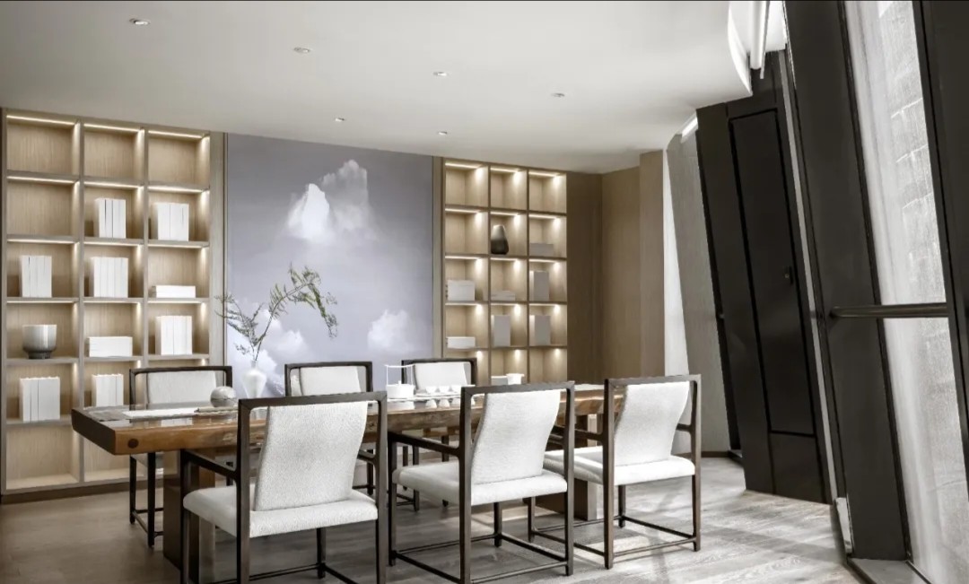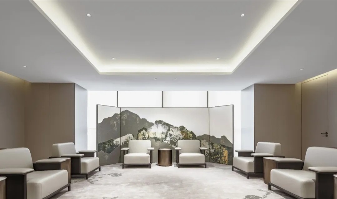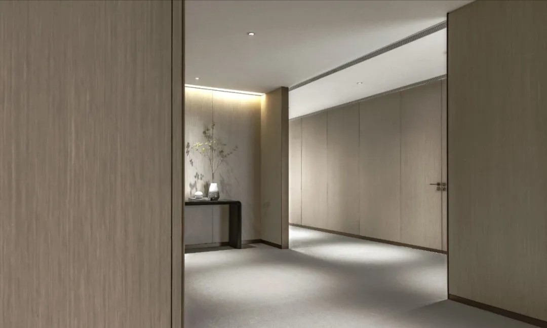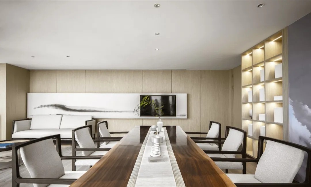 在塑造温馨感时,木色成为最好的媒介。空间选用木色作为主要色调,黑白色和金属色描画出轮廓,温馨亲和并且体现出作为办公空间的大气感。转角宽幅山水装饰画给空间以宁静、舒适的东方质感,跳脱出木饰面打造的统一与严肃。