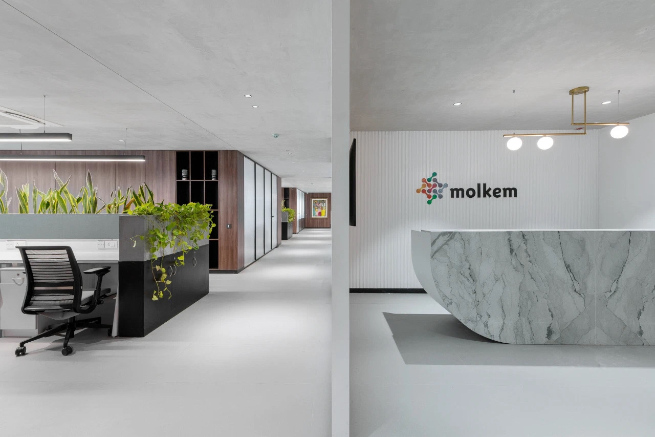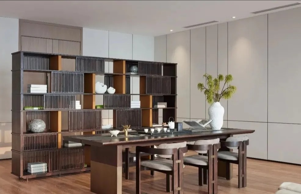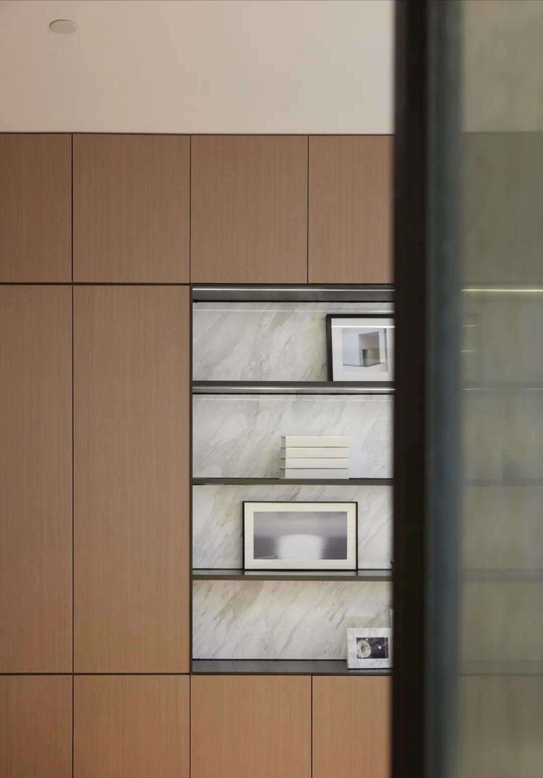 在塑造温馨感时,木色成为最好的媒介。空间选用木色作为主要色调,黑白色和金属色描画出轮廓,温馨亲和并且体现出作为办公空间的大气感。转角宽幅山水装饰画给空间以宁静、舒适的东方质感,跳脱出木饰面打造的统一与严肃。
