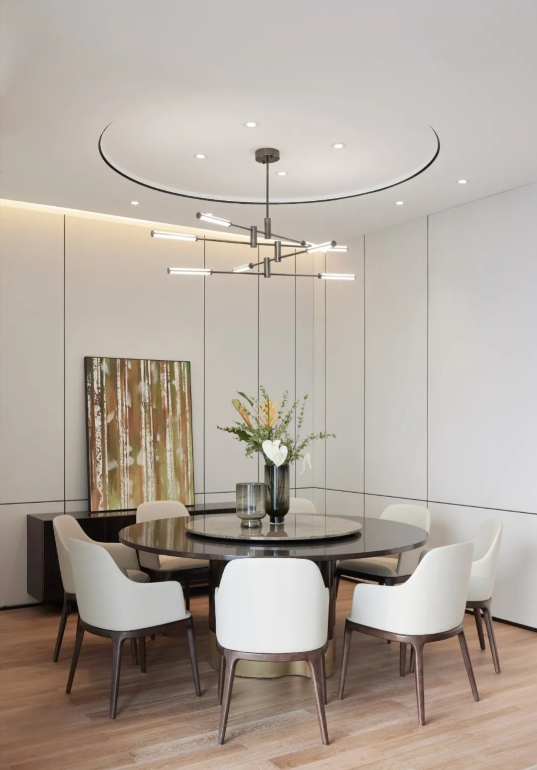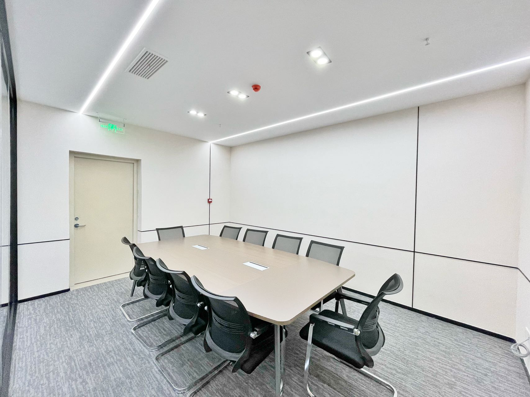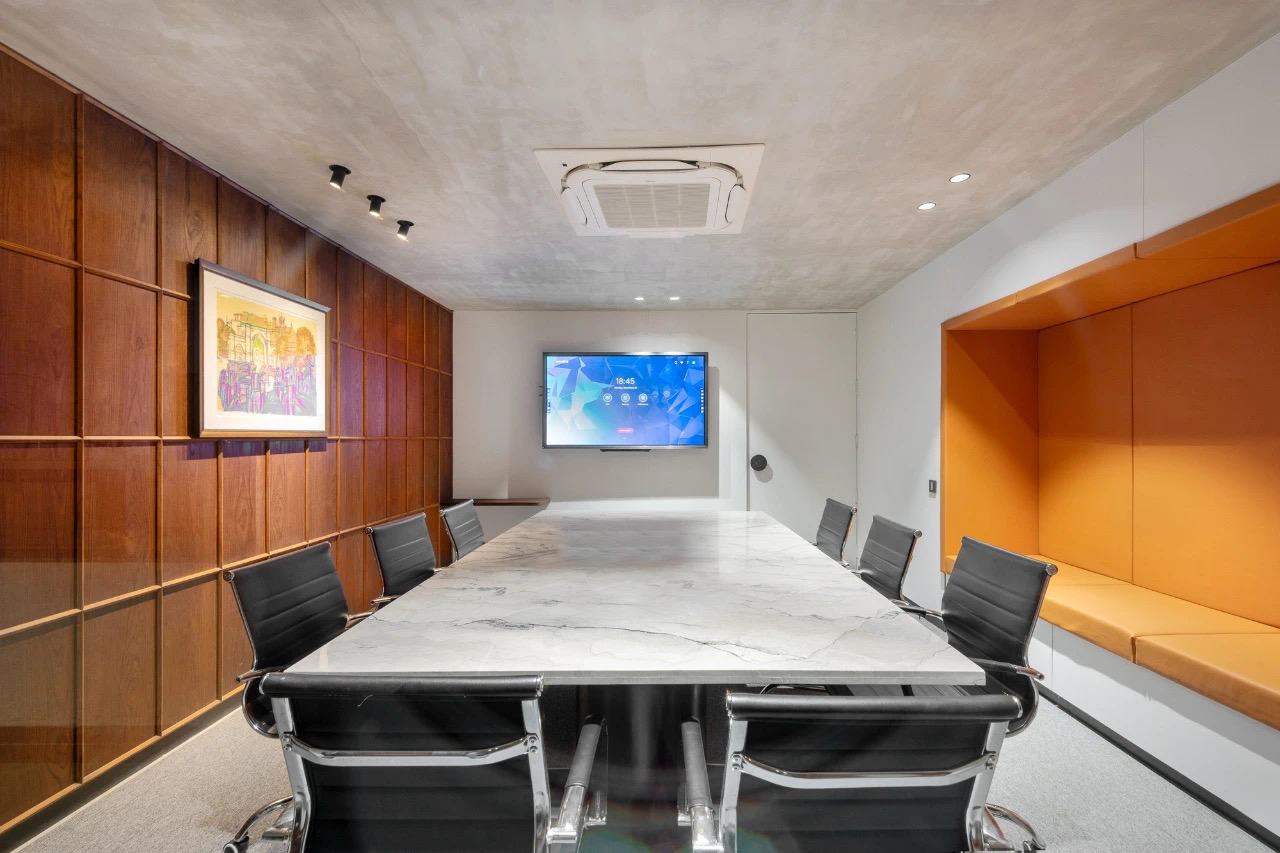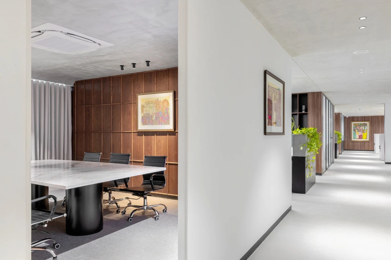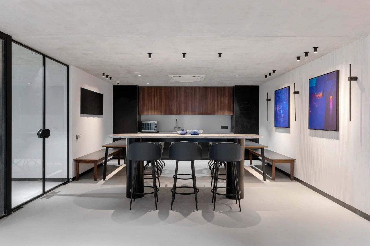 追寻更大的未来也不会忘记最初的美好。在倡导效率为先的办公职场中,以此张弛有度、轻松愉悦的空间致敬蔷薇控股的每一位伙伴。大会议室采用大面积发光灯膜来营造均匀天光的感受,Poltrona Frau的办公椅以阵列形式排开,皮革的质感在木饰面的衬托下,更能提升空间品质层次。