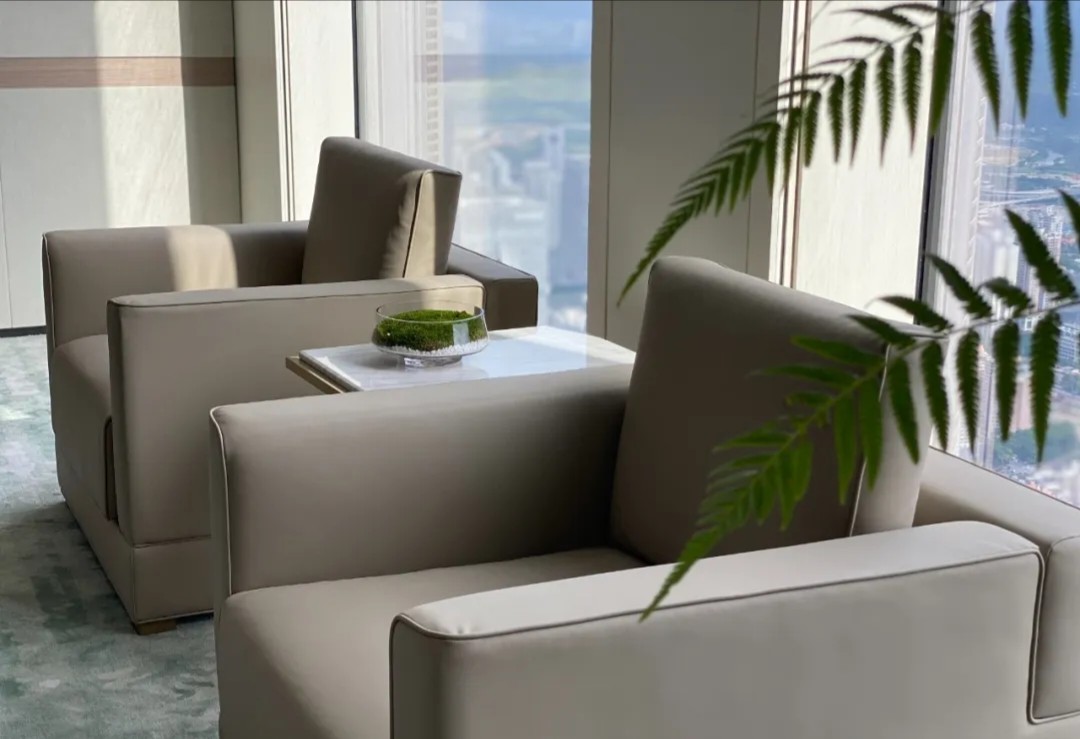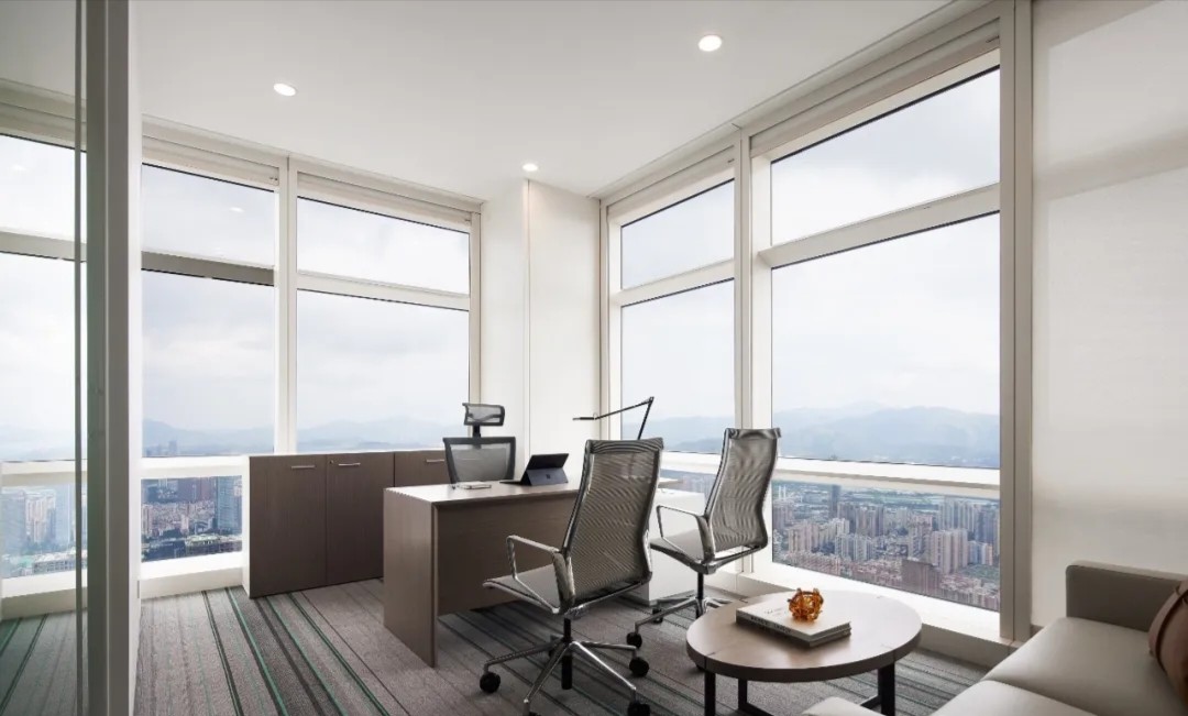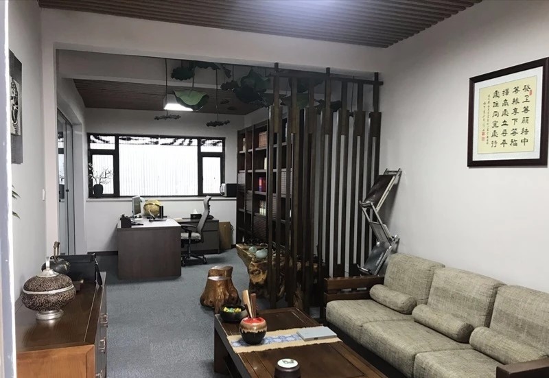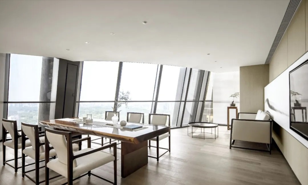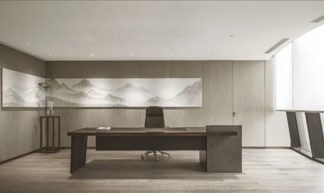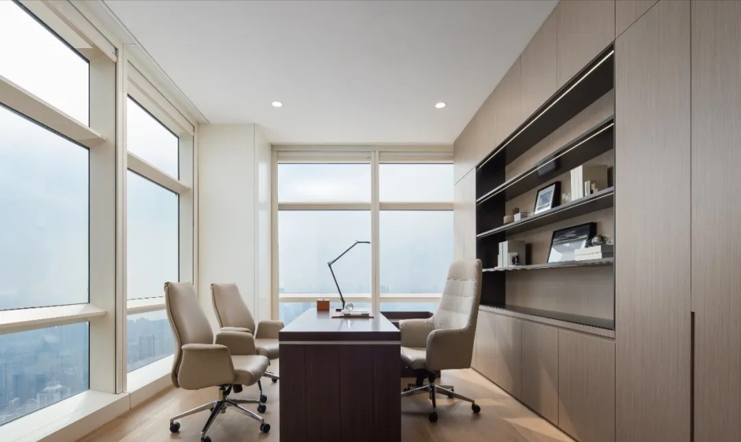 总裁办公室宽敞的格局搭配以一致的木色调,一股属于东方的文雅气场映入眼帘,临窗而坐静享那份与自然风景对饮的惬意。理性的线条拼接现代艺术轨迹,搭配低饱合的淡雅配色,都被包裹进低调的奢华中。