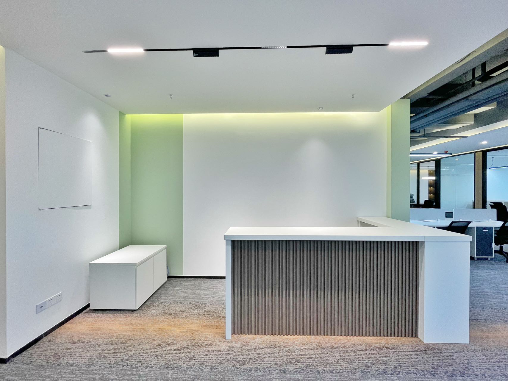 小会议室延续了大会议室的整体风格,简化了装饰面,弱化家具的造型,更把注意力放在提升工作节奏方面,空间有密有疏,节奏有快有慢,更具有整体办公职场的审美内涵。