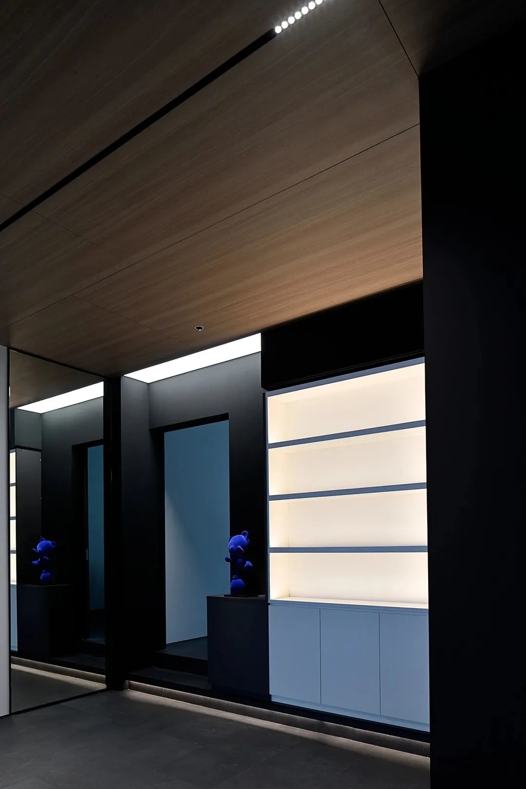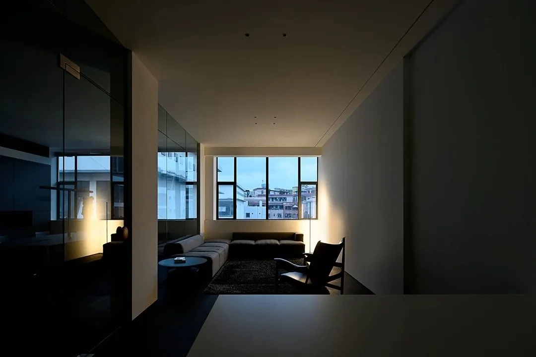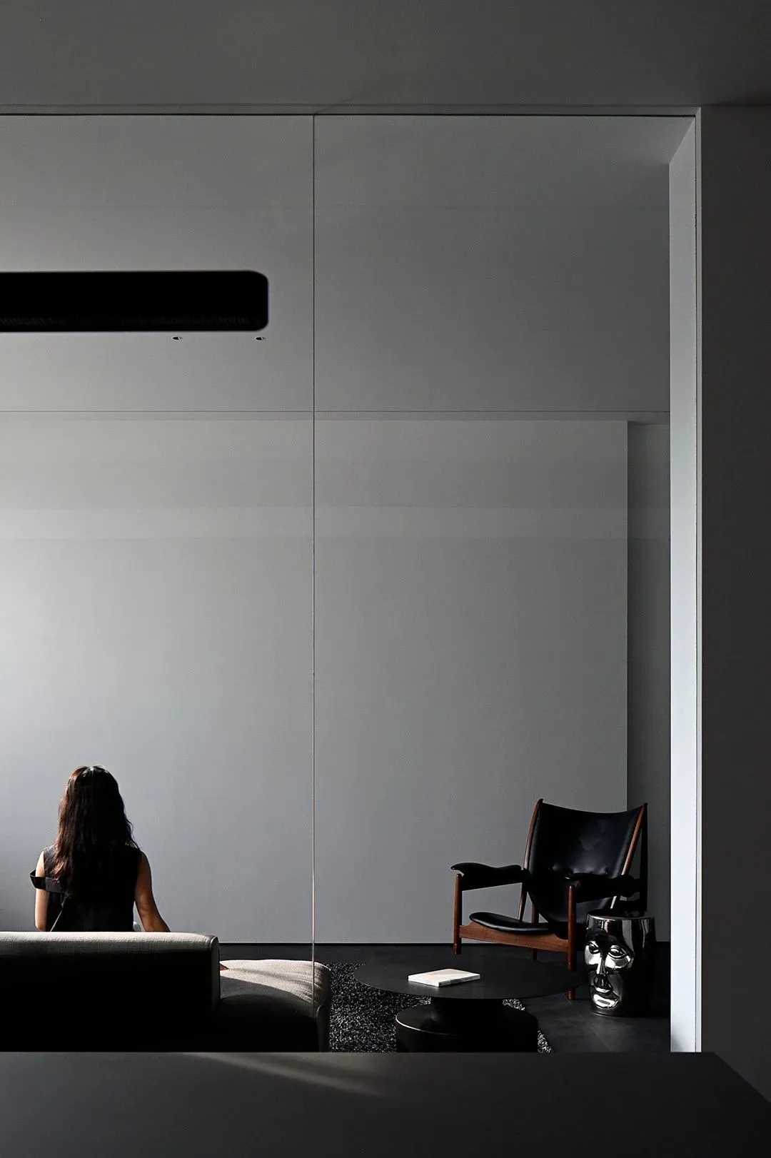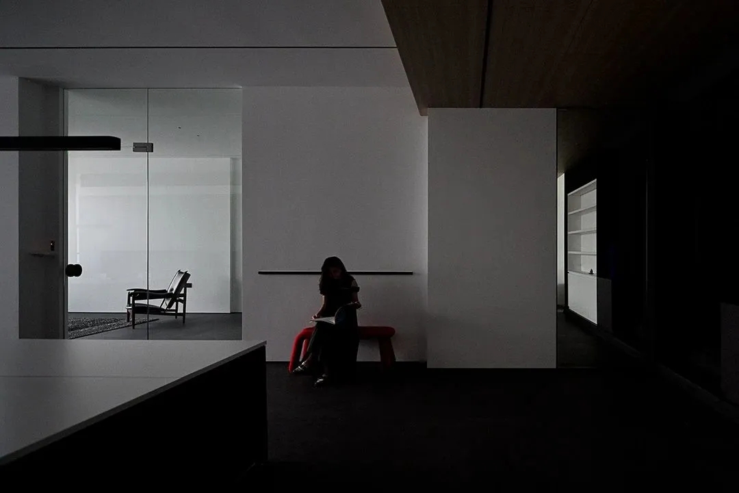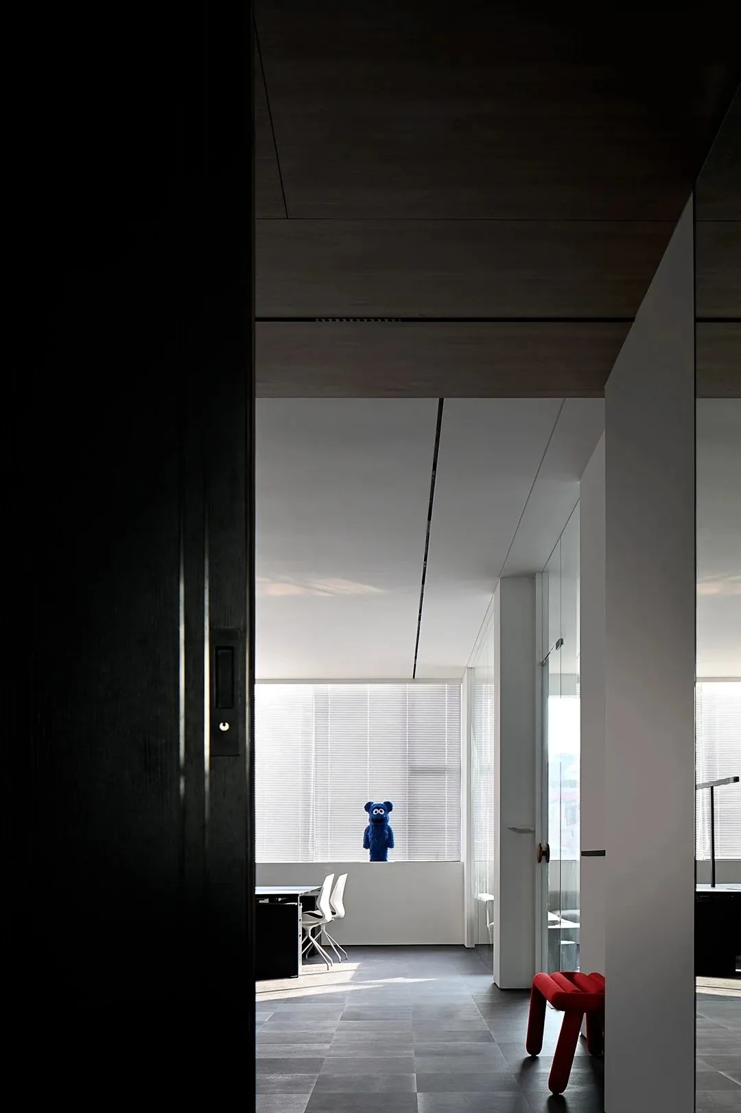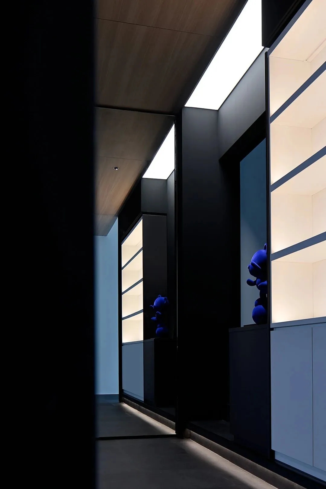 无论是转角处的一面镜子,还是半开放式玻璃空间,空间结构的块面,被折射的光勾勒出层次分明的旋律。