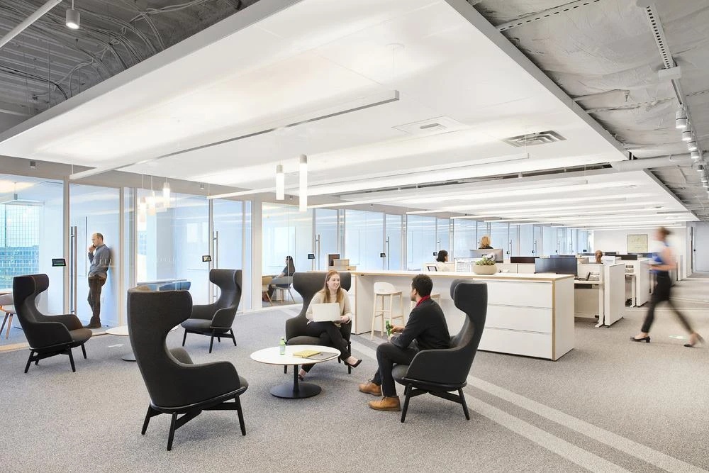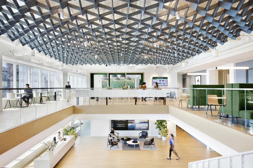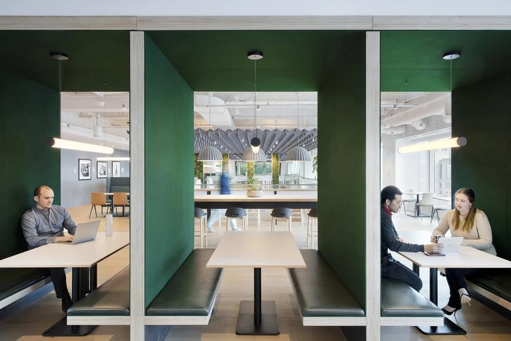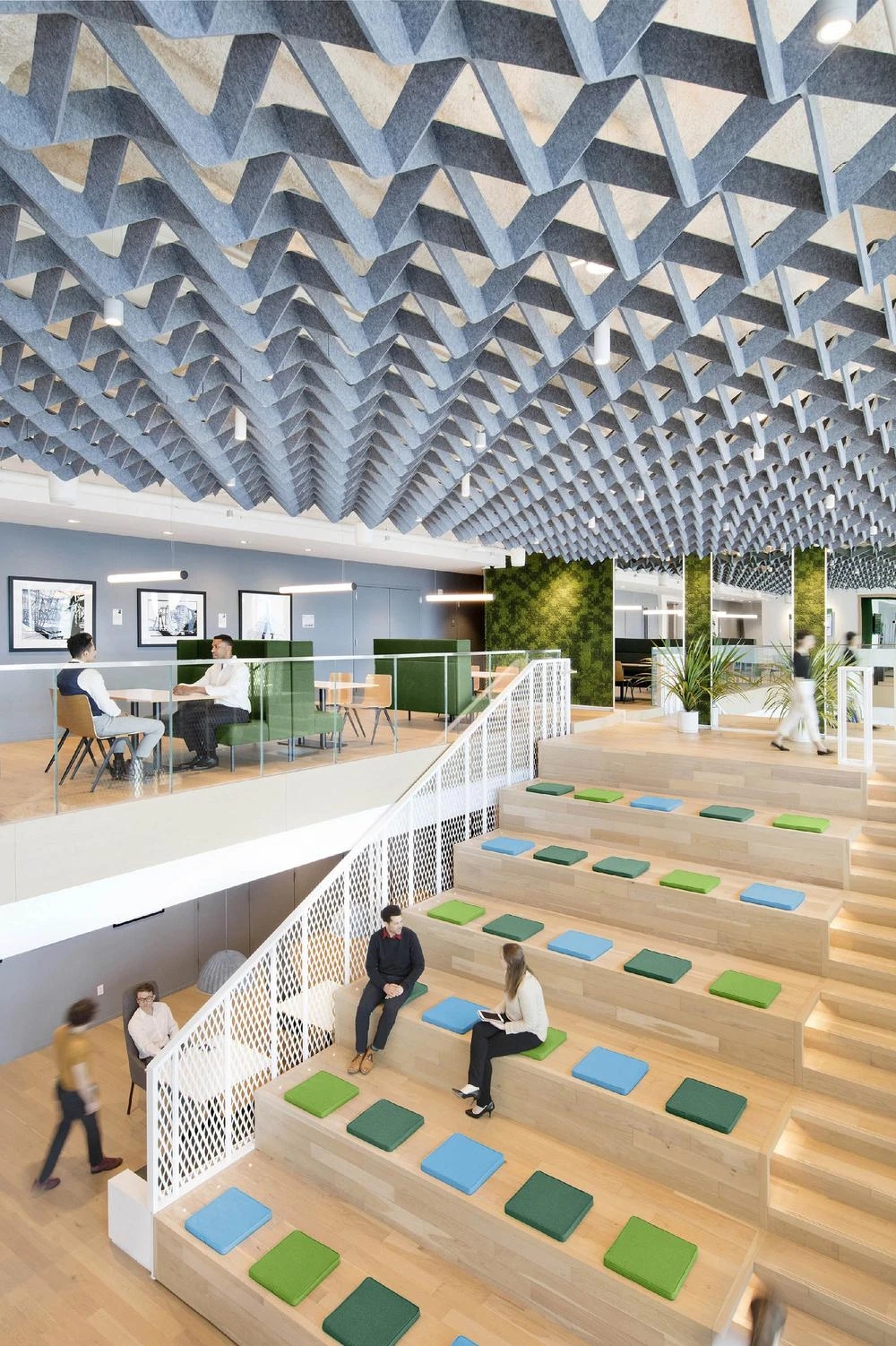 围绕着核心阶梯座和Rise Café,配置了形式多样的桌椅以及车厢座,为个人工作或团队协作提供了丰富的选择。绿色加蓝色的配色创建了一个令人舒适且静谧的工作氛围,也是对CBRE全球品牌形象的诠释和应用。整个空间以橡木为主要用材,展现出自然、永恒、耐用的时尚空间格调。