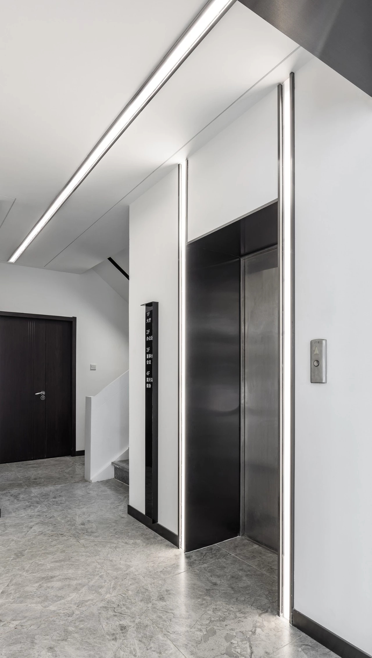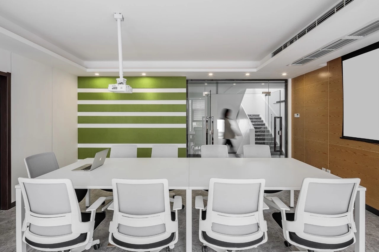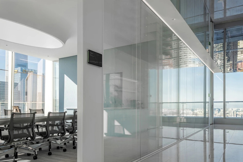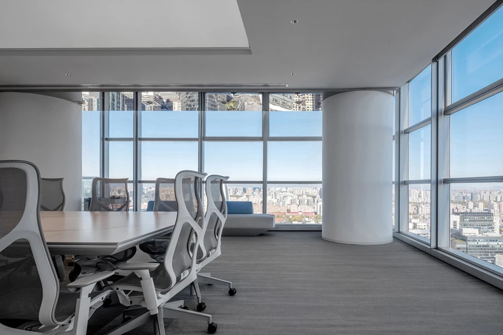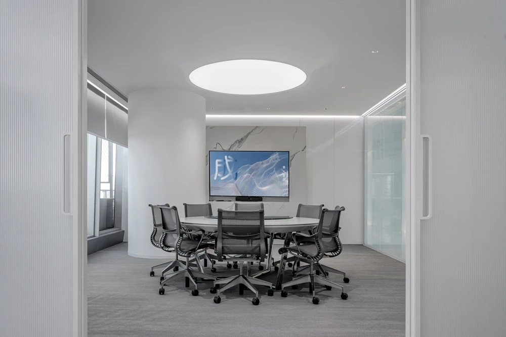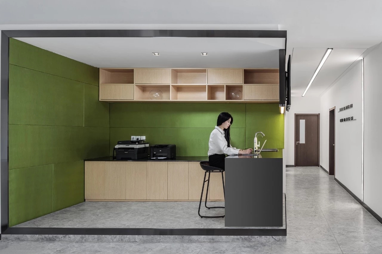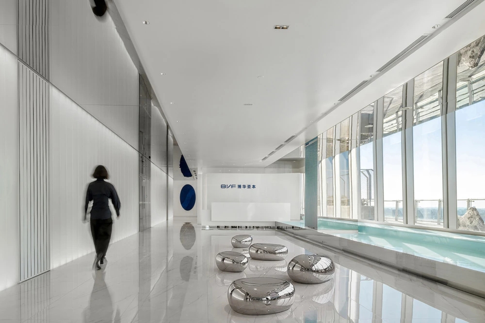 在材料运用上,接待区地面与墙面全部采用岩板,靠近核心筒的墙面使用U型玻璃,让实体的结构墙显得轻盈透亮。办公区的地面全部采用编织地毯代替传统的尼龙地毯。镜面不锈钢在天花板上的应用是整个空间的亮点,所有的过道均形成倒影,游走其中便能感受到空间的延伸与变化。