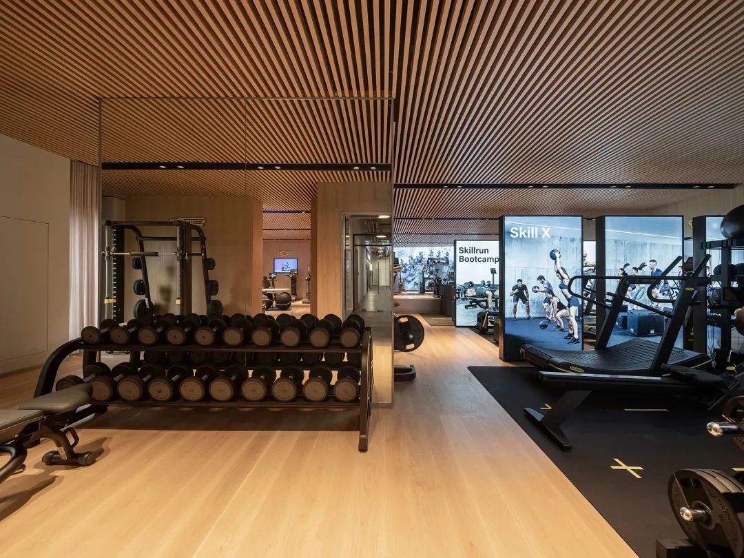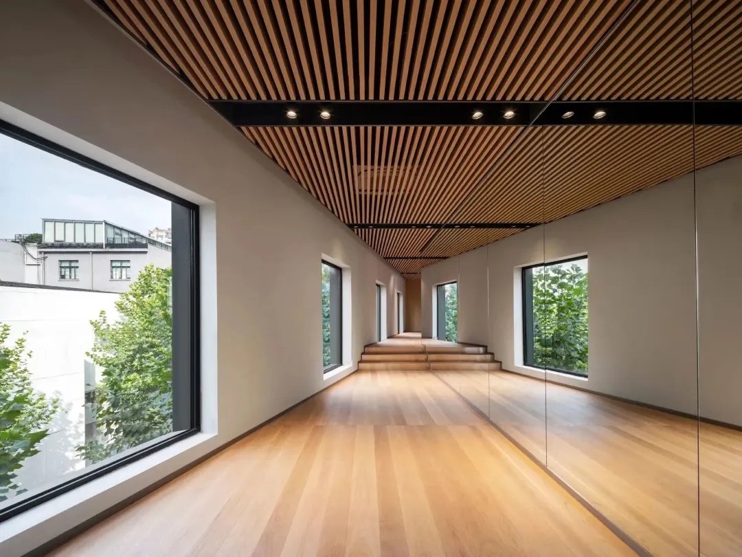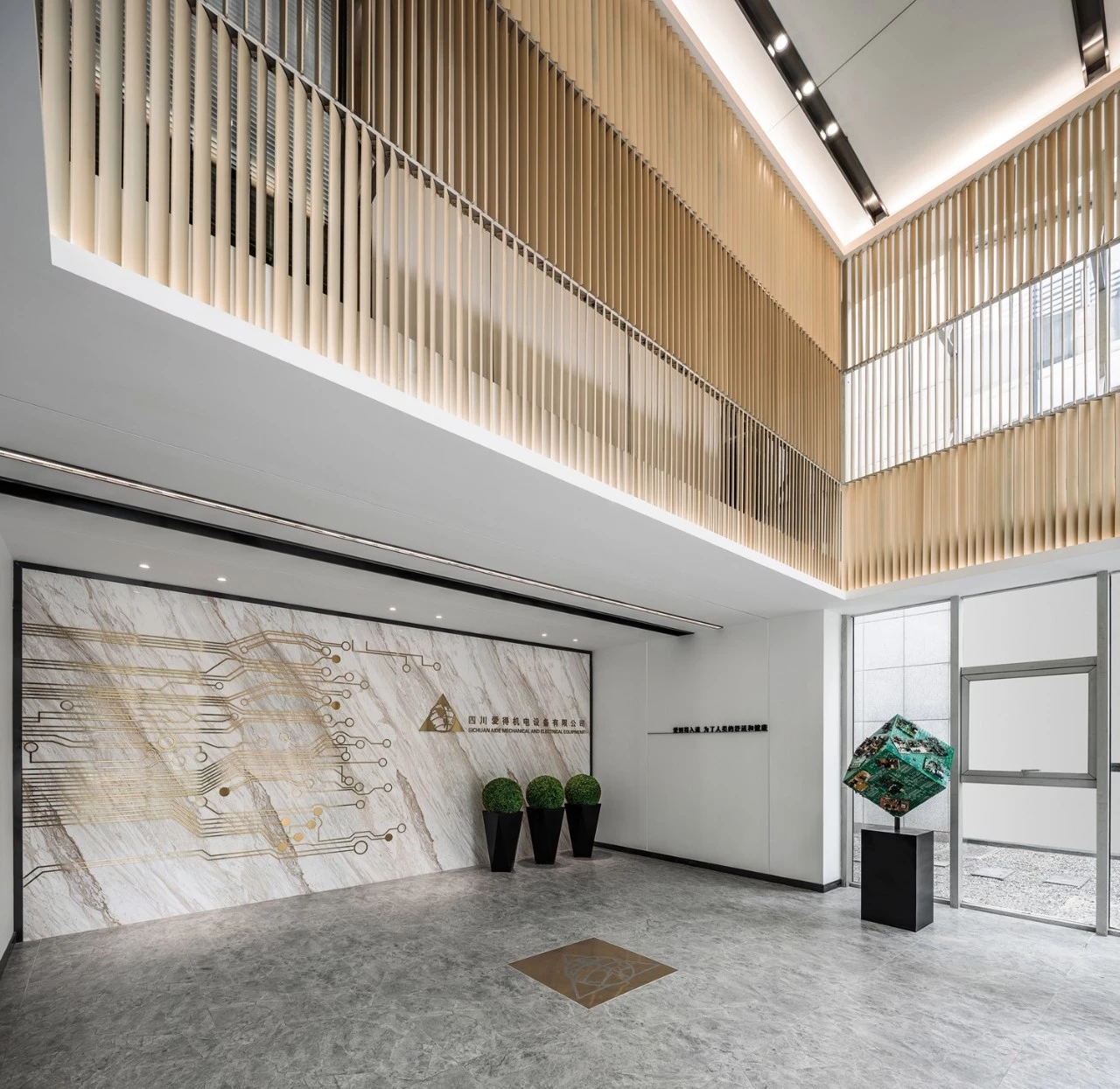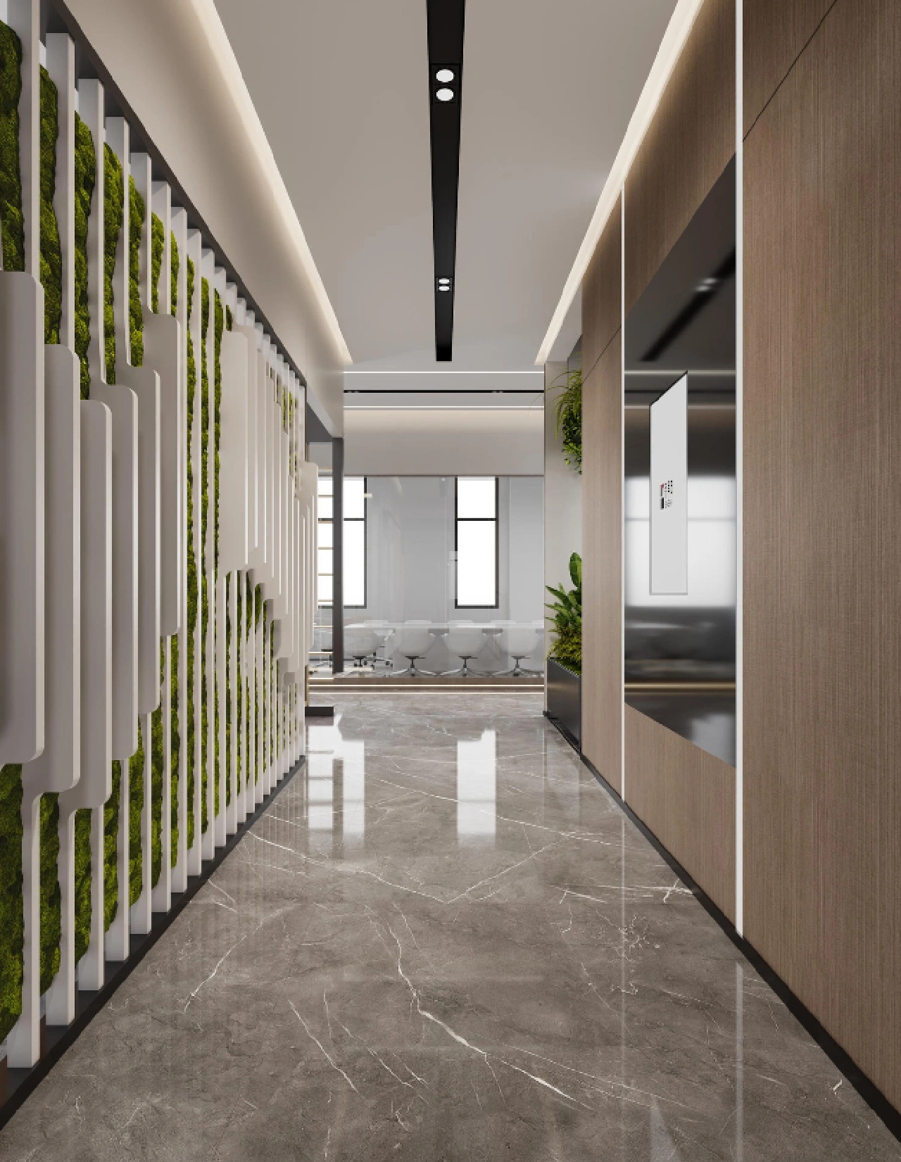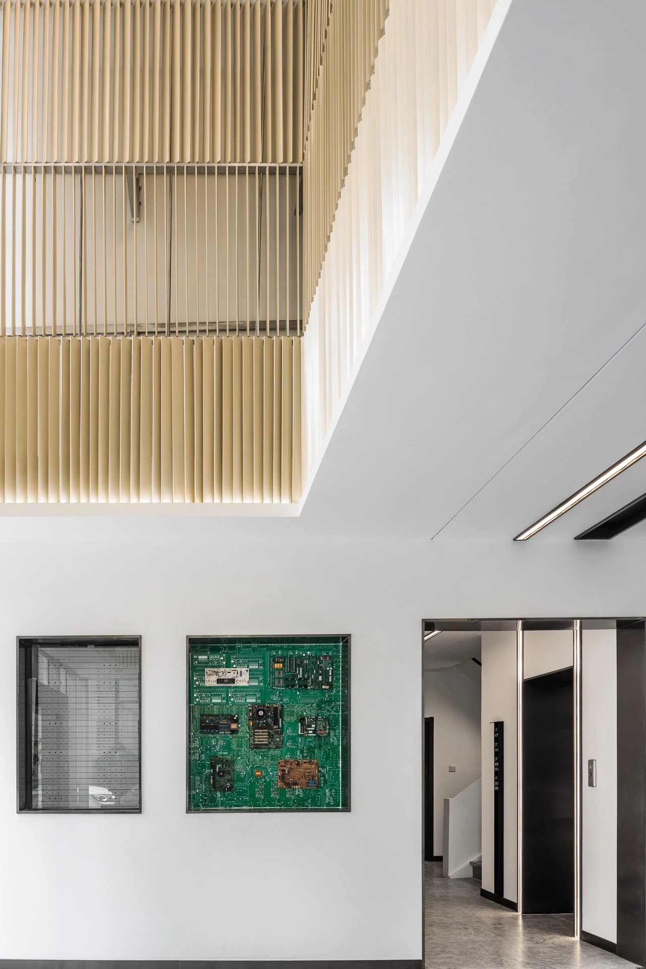 在材料运用上,接待区地面与墙面全部采用岩板,靠近核心筒的墙面使用U型玻璃,让实体的结构墙显得轻盈透亮。办公区的地面全部采用编织地毯代替传统的尼龙地毯。镜面不锈钢在天花板上的应用是整个空间的亮点,所有的过道均形成倒影,游走其中便能感受到空间的延伸与变化。