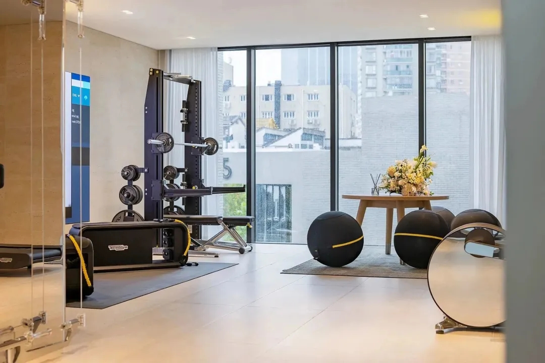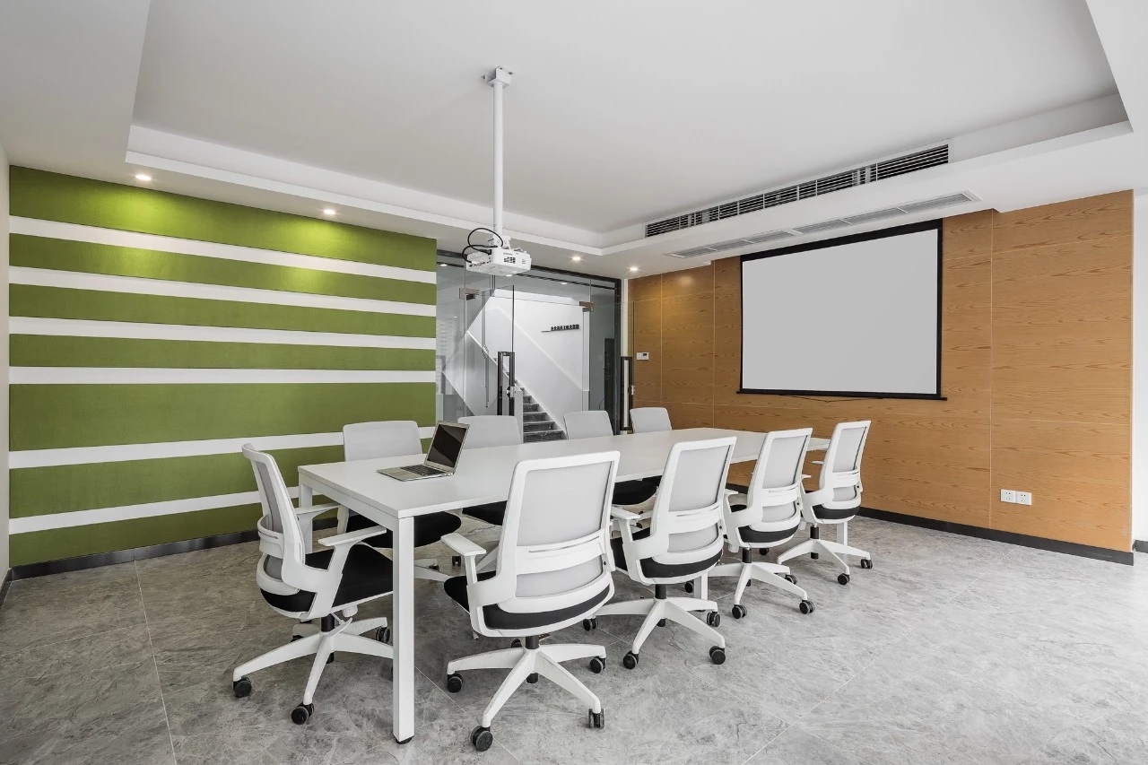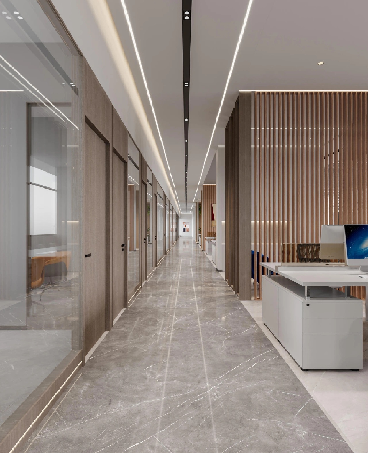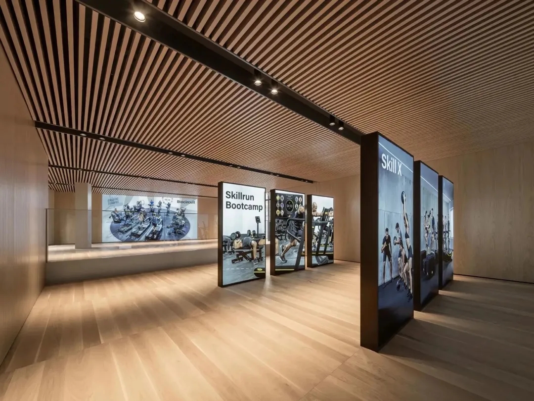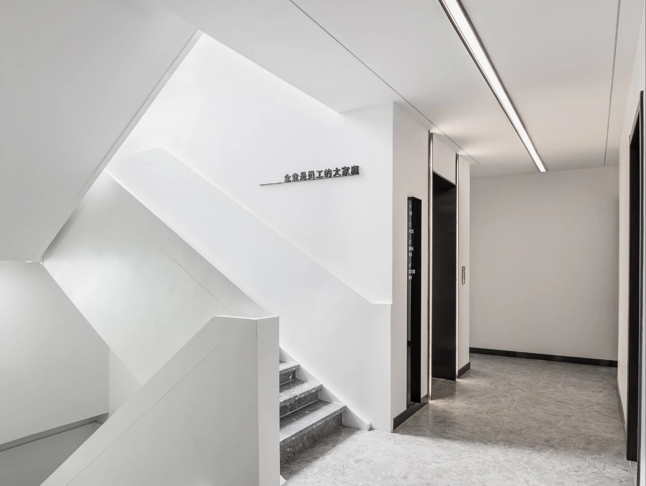 在材料运用上,接待区地面与墙面全部采用岩板,靠近核心筒的墙面使用U型玻璃,让实体的结构墙显得轻盈透亮。办公区的地面全部采用编织地毯代替传统的尼龙地毯。镜面不锈钢在天花板上的应用是整个空间的亮点,所有的过道均形成倒影,游走其中便能感受到空间的延伸与变化。