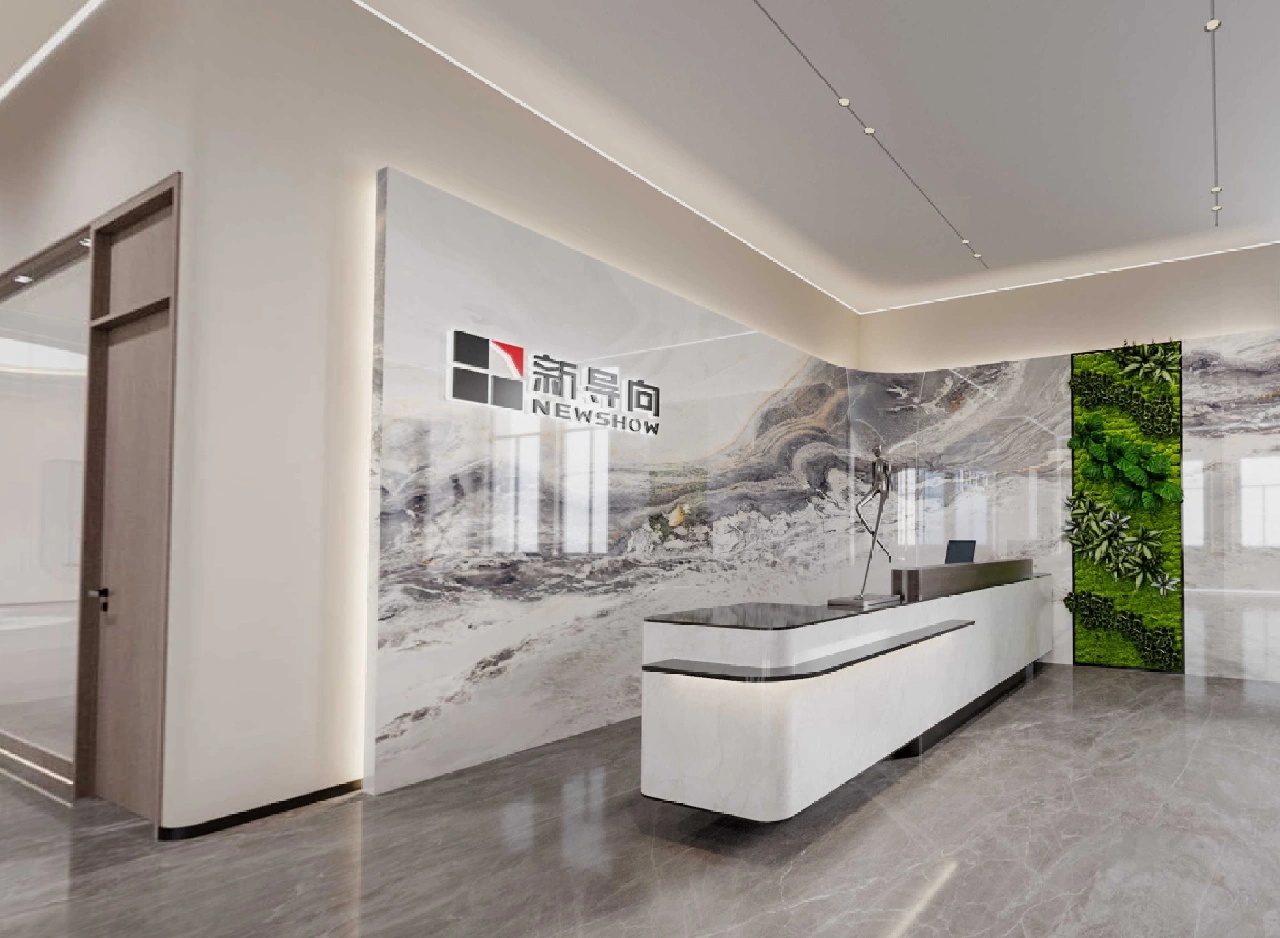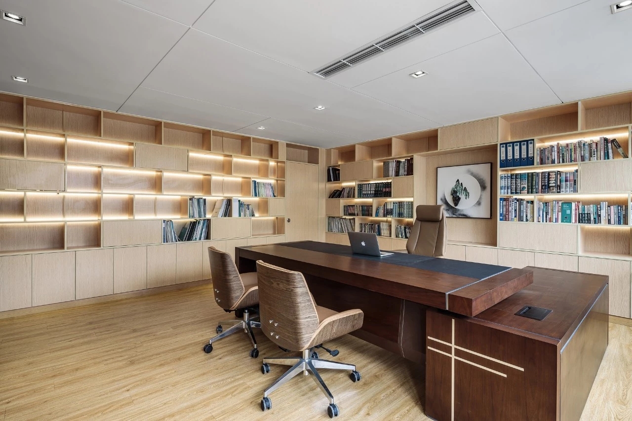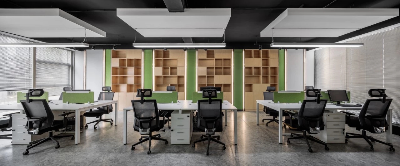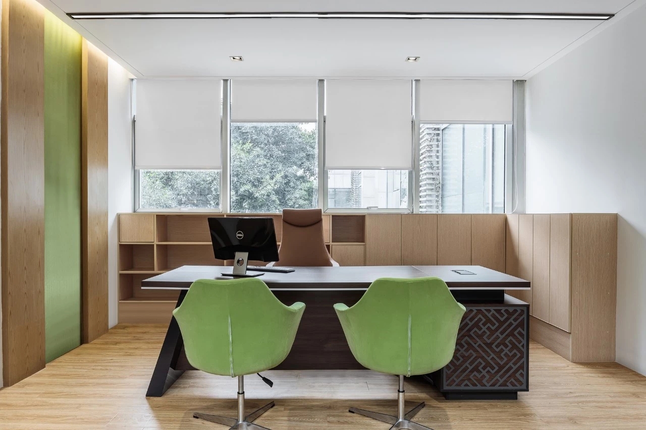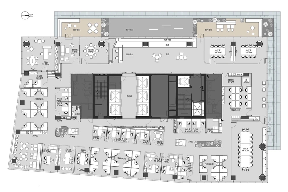 在空间布局上,将面西偏窄的空间作为接待区,与室外的露台连接,露台上的山石景观与室内的流水景观融为一体;将露台的两侧作为户外休息区,对接待功能做更广的延伸。平面图的东侧与南侧为后场工位区,将所有员工工位临窗,最大化地让员工享受到明媚的自然光和眺望远方的视野。