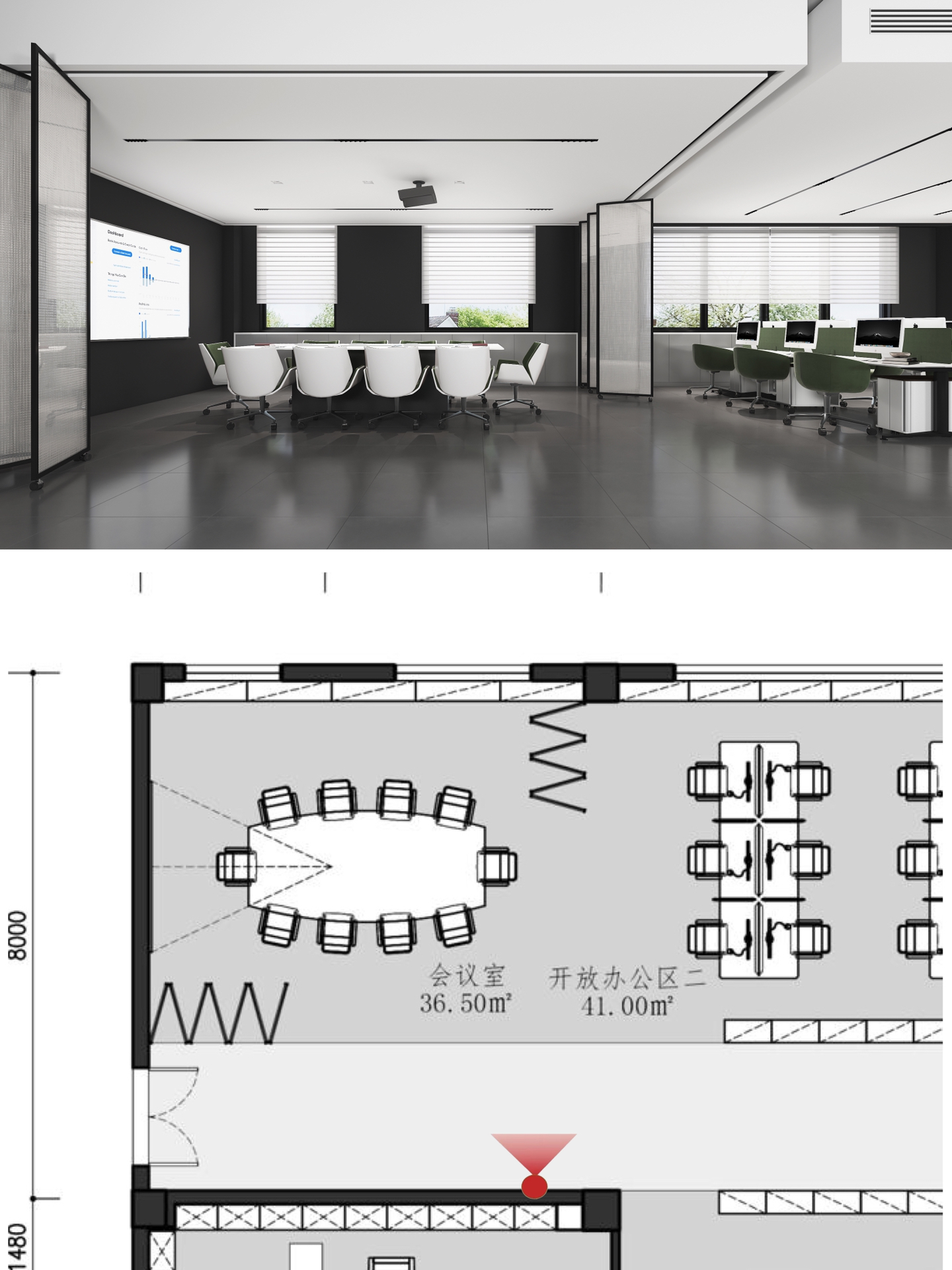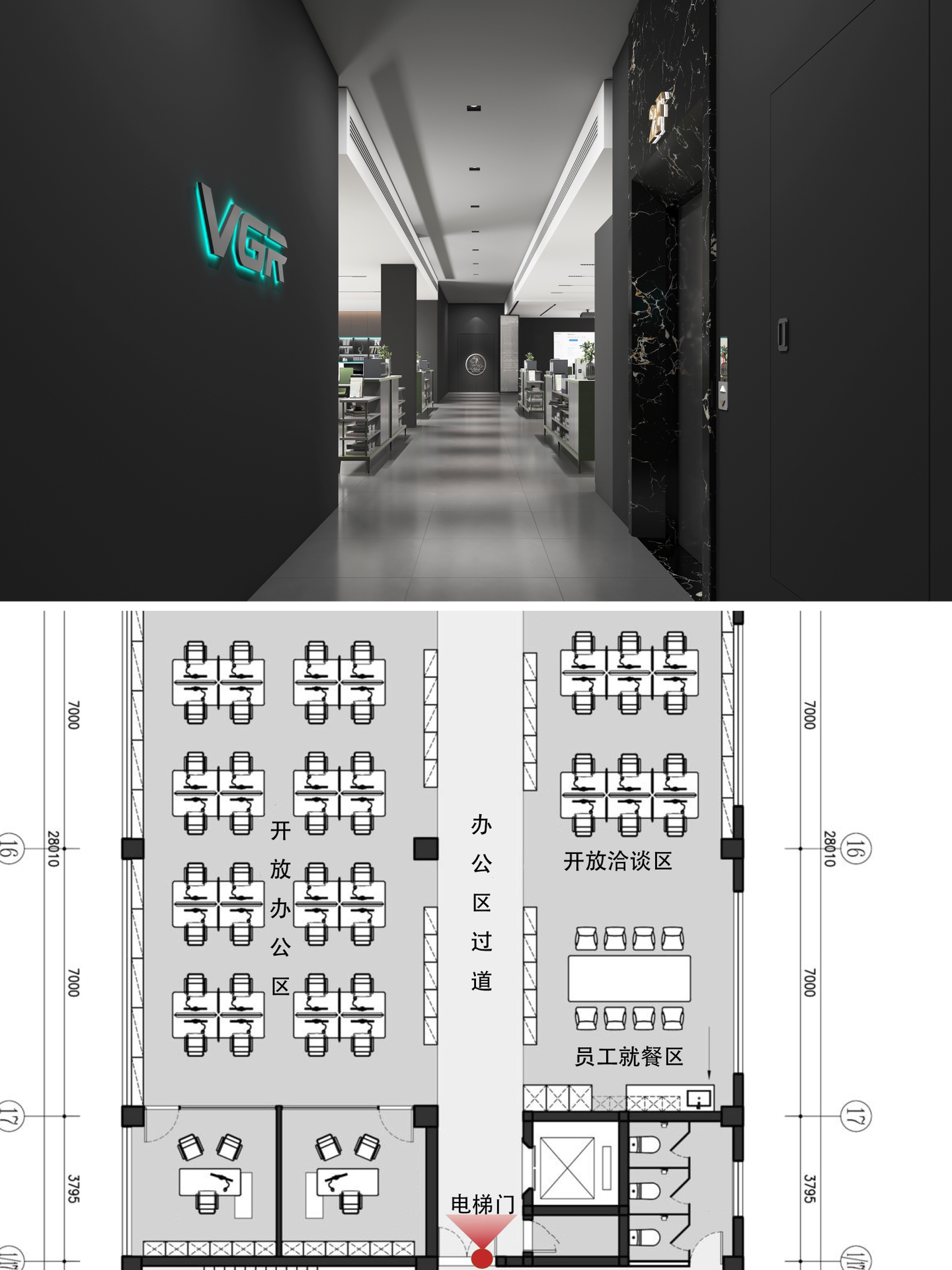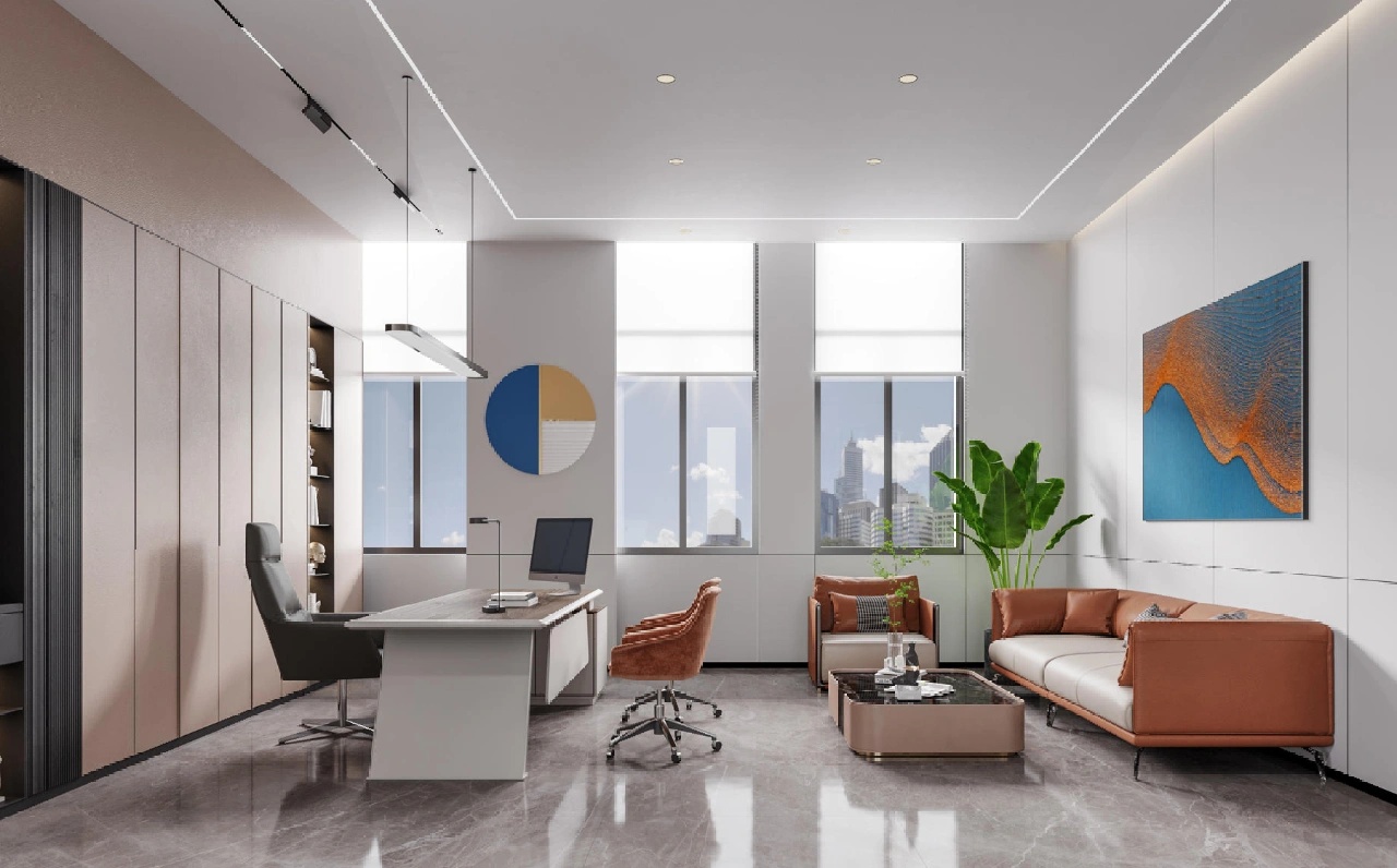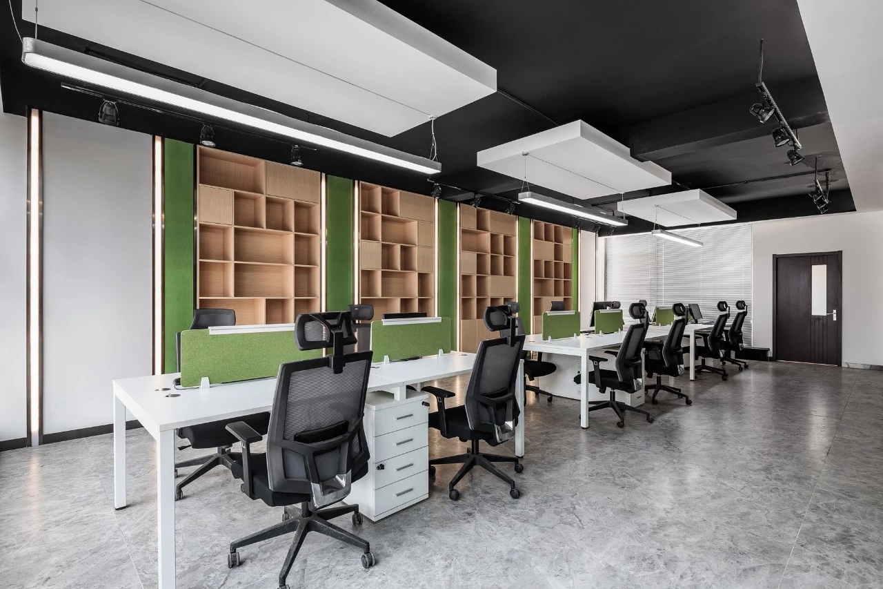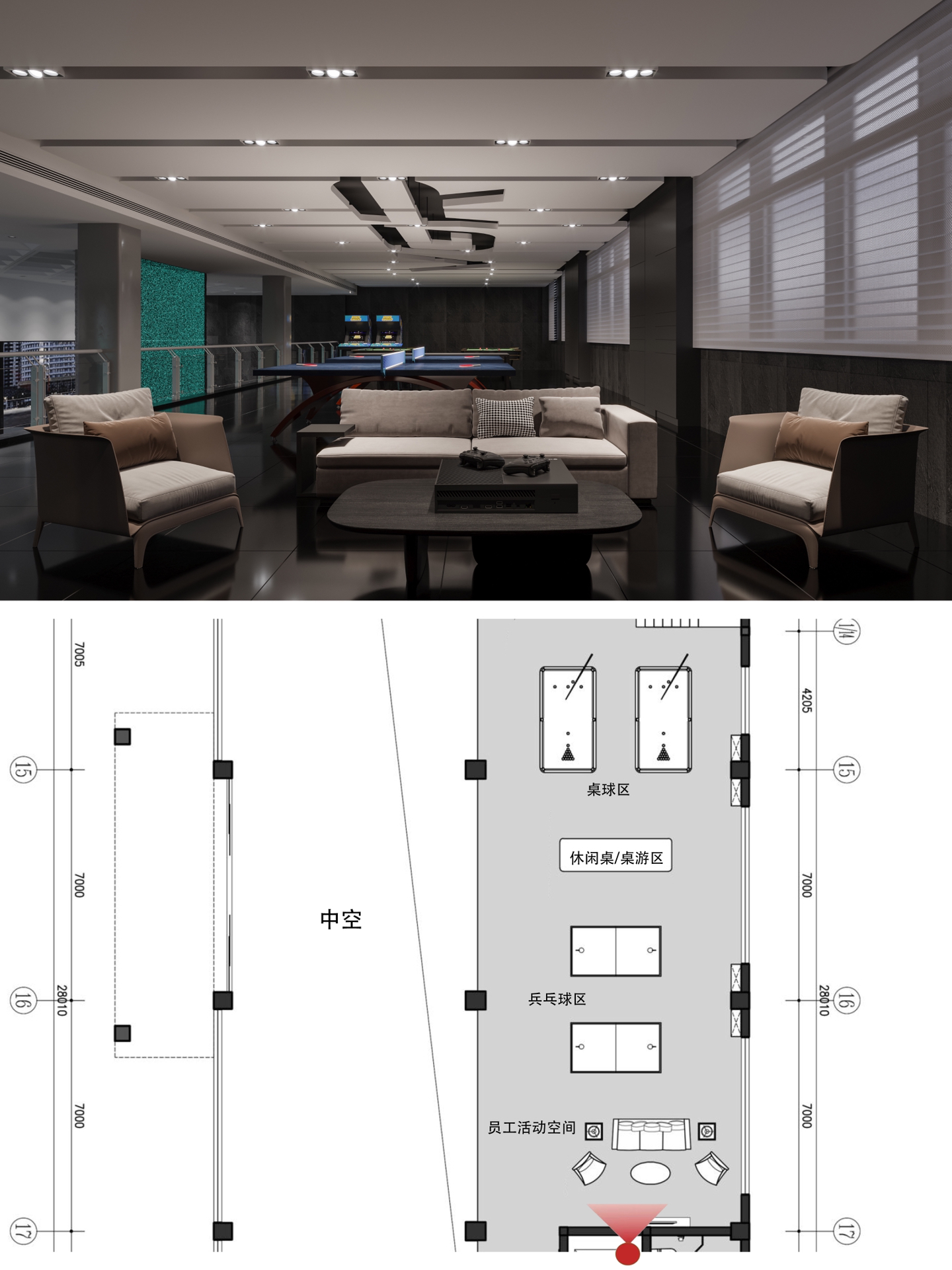 在空间布局上,将面西偏窄的空间作为接待区,与室外的露台连接,露台上的山石景观与室内的流水景观融为一体;将露台的两侧作为户外休息区,对接待功能做更广的延伸。平面图的东侧与南侧为后场工位区,将所有员工工位临窗,最大化地让员工享受到明媚的自然光和眺望远方的视野。