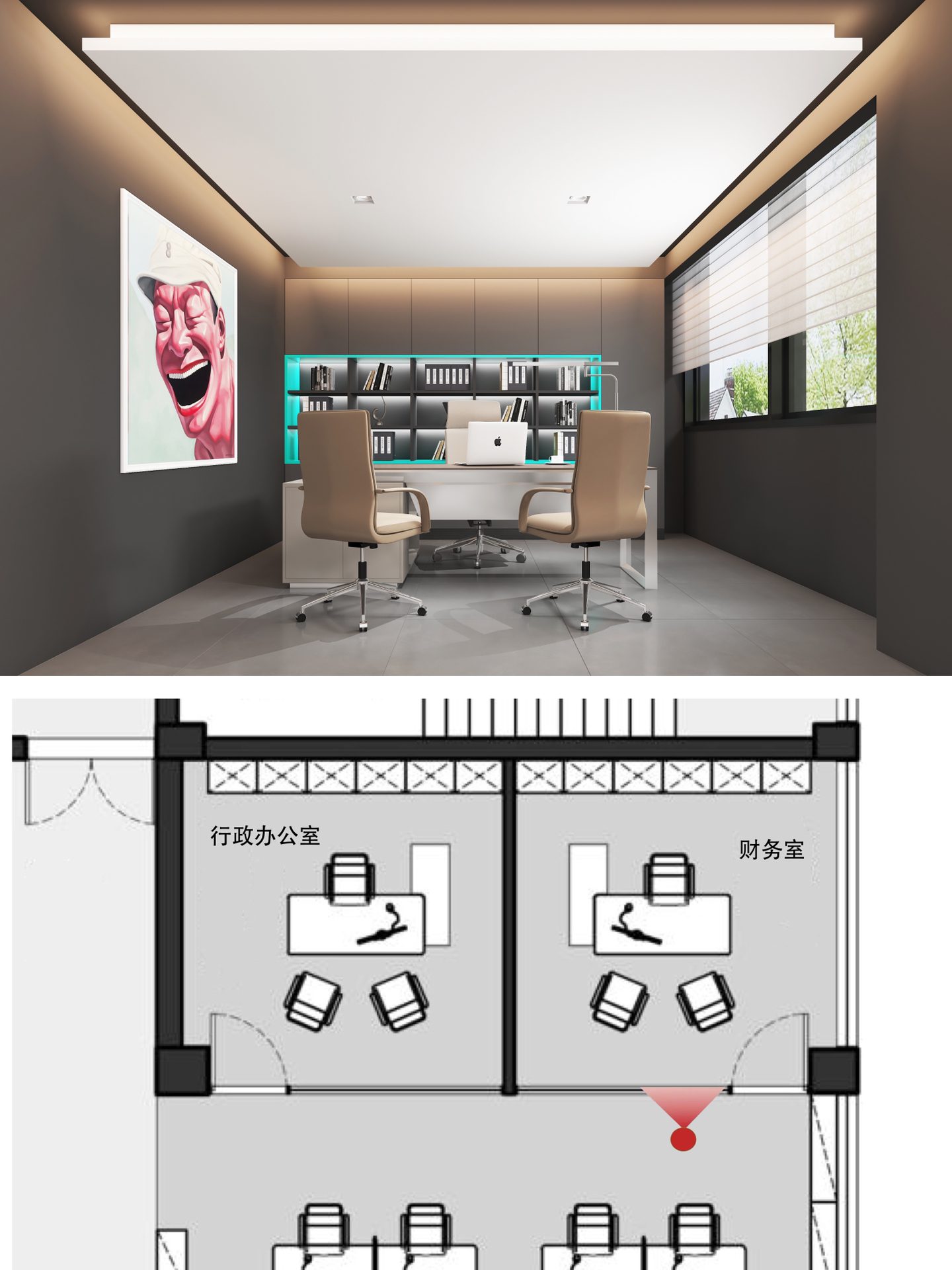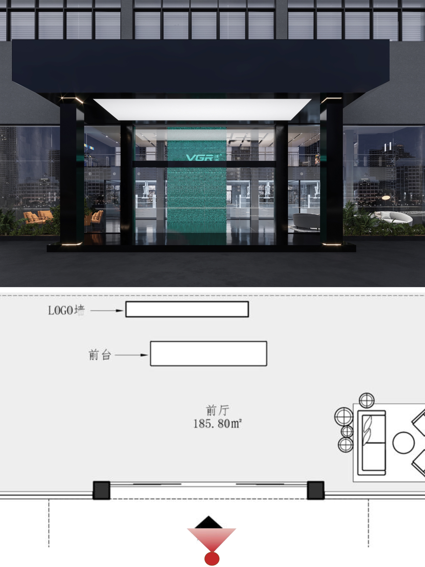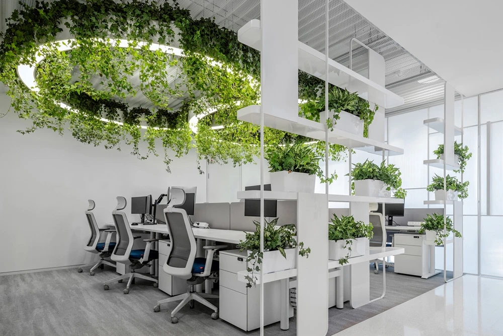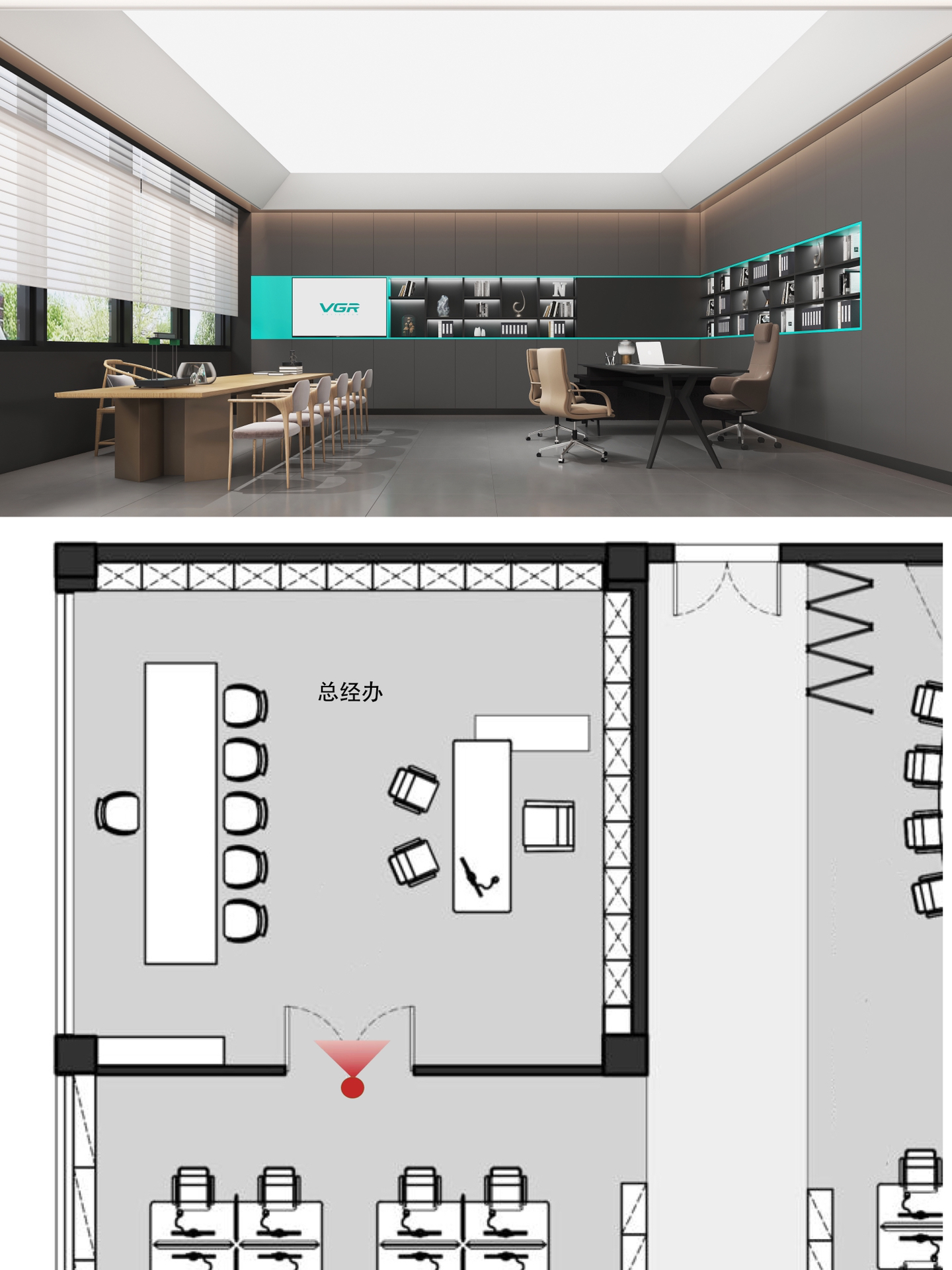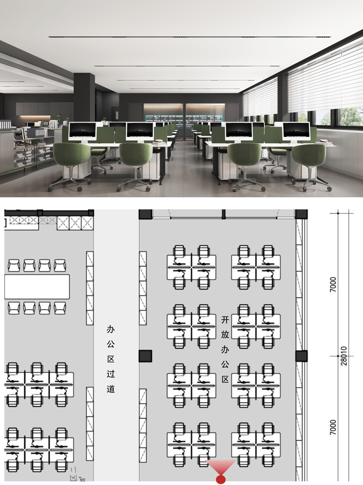 在空间布局上,将面西偏窄的空间作为接待区,与室外的露台连接,露台上的山石景观与室内的流水景观融为一体;将露台的两侧作为户外休息区,对接待功能做更广的延伸。平面图的东侧与南侧为后场工位区,将所有员工工位临窗,最大化地让员工享受到明媚的自然光和眺望远方的视野。