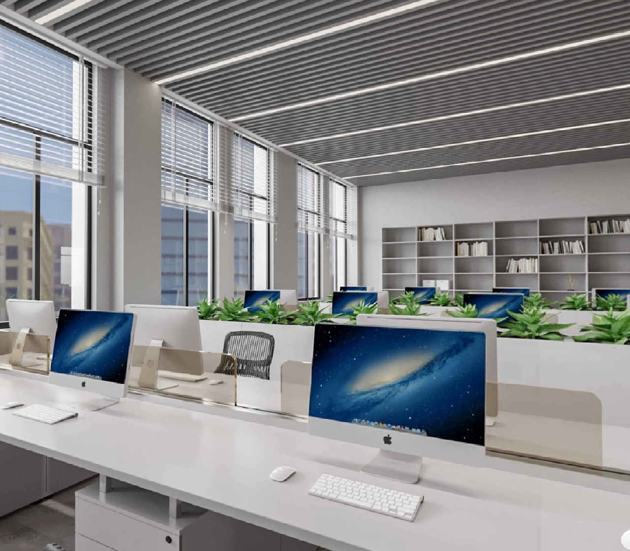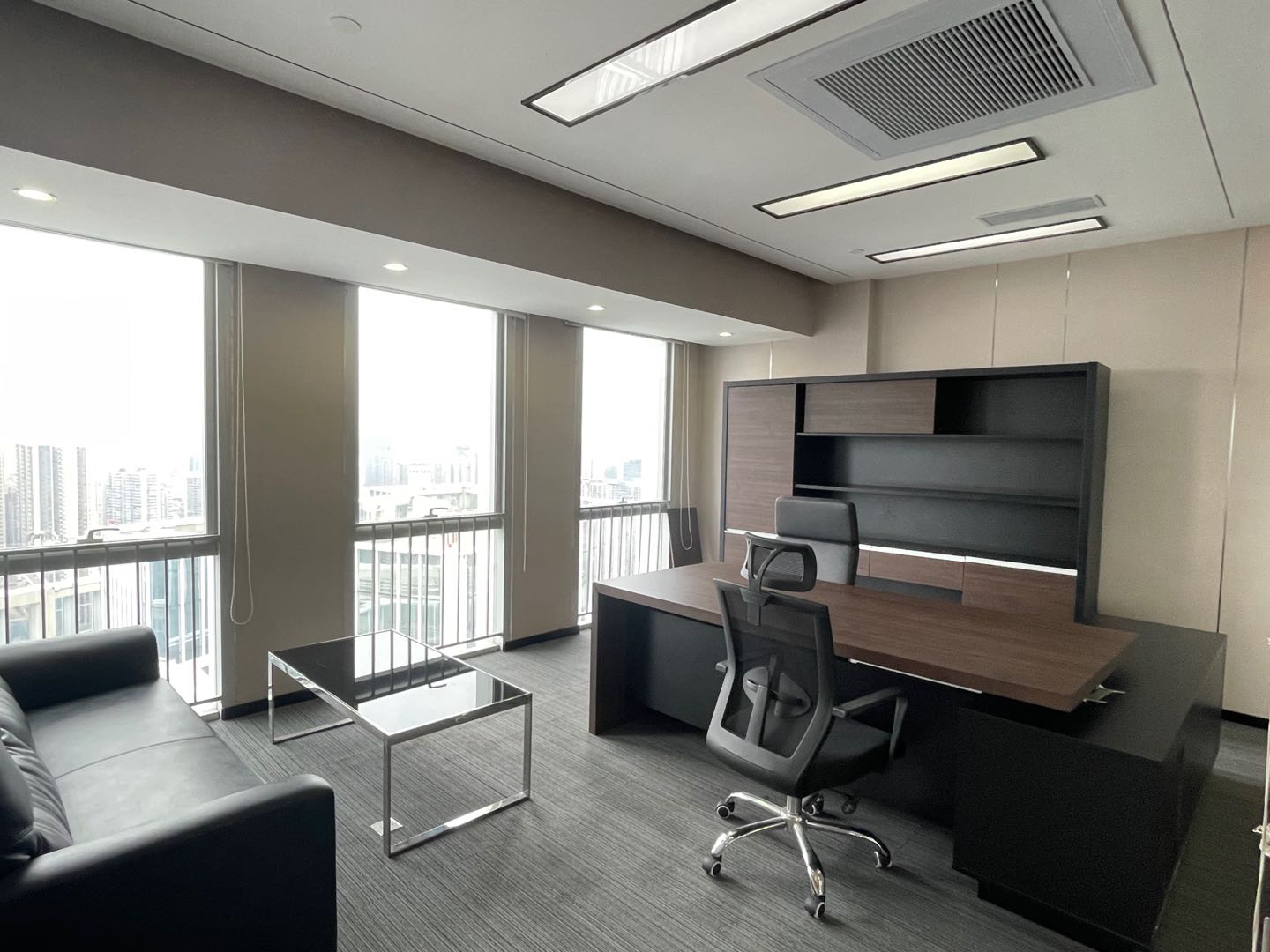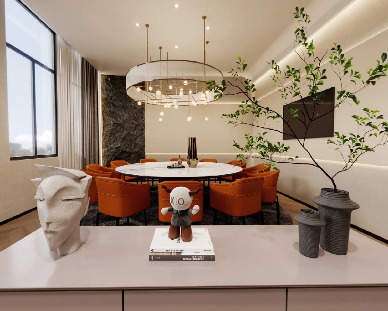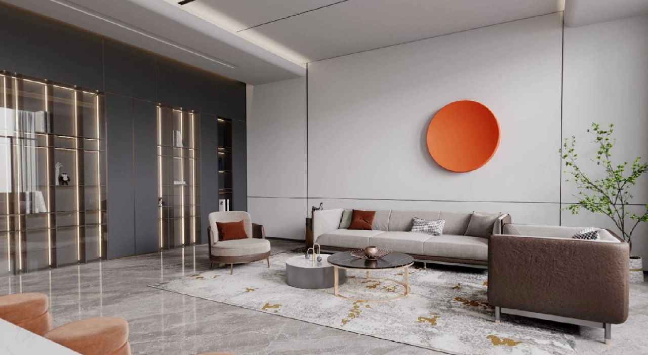 在空间布局上,将面西偏窄的空间作为接待区,与室外的露台连接,露台上的山石景观与室内的流水景观融为一体;将露台的两侧作为户外休息区,对接待功能做更广的延伸。平面图的东侧与南侧为后场工位区,将所有员工工位临窗,最大化地让员工享受到明媚的自然光和眺望远方的视野。