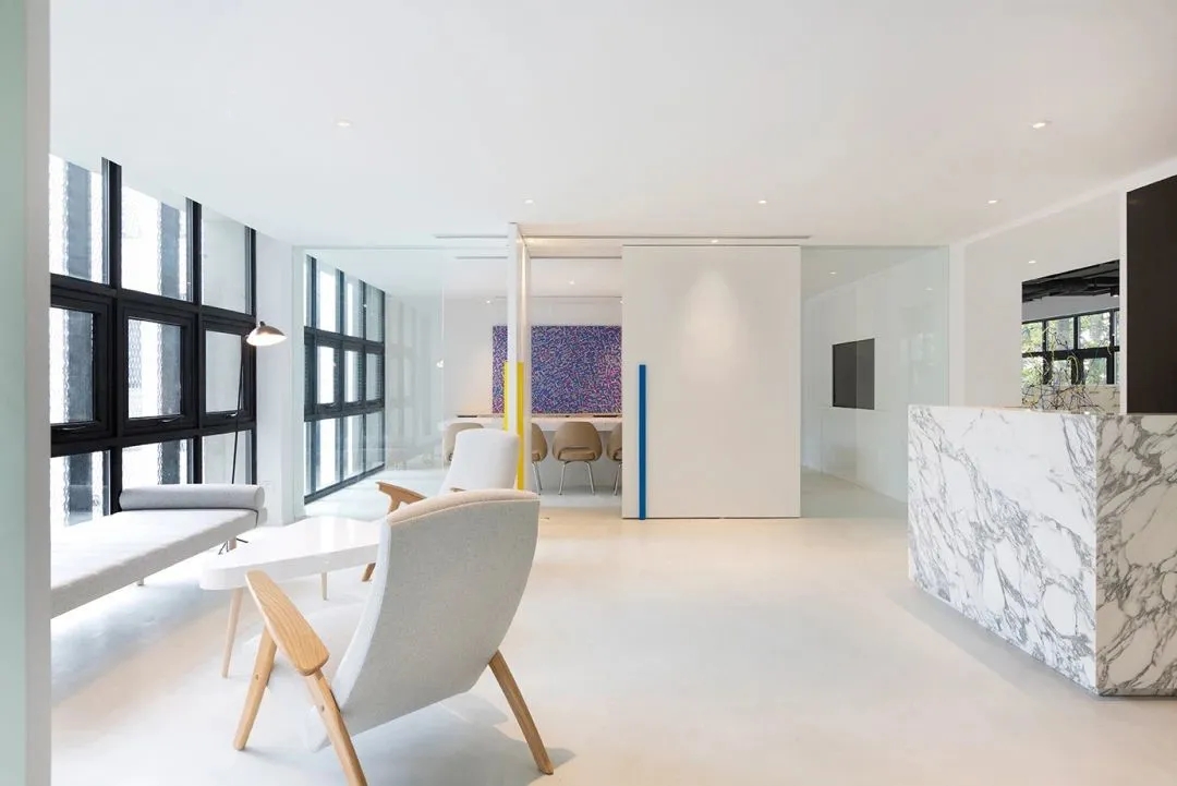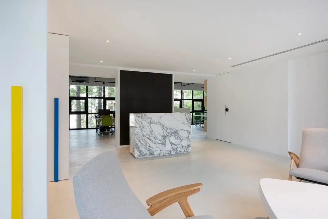 前台以纯白、灰色和黑色等色调营造淡雅、柔和的氛围;接待区的木质现代桌椅呈现出亲近自然的柚木色,打破了现代办公室惯常的装饰手法。