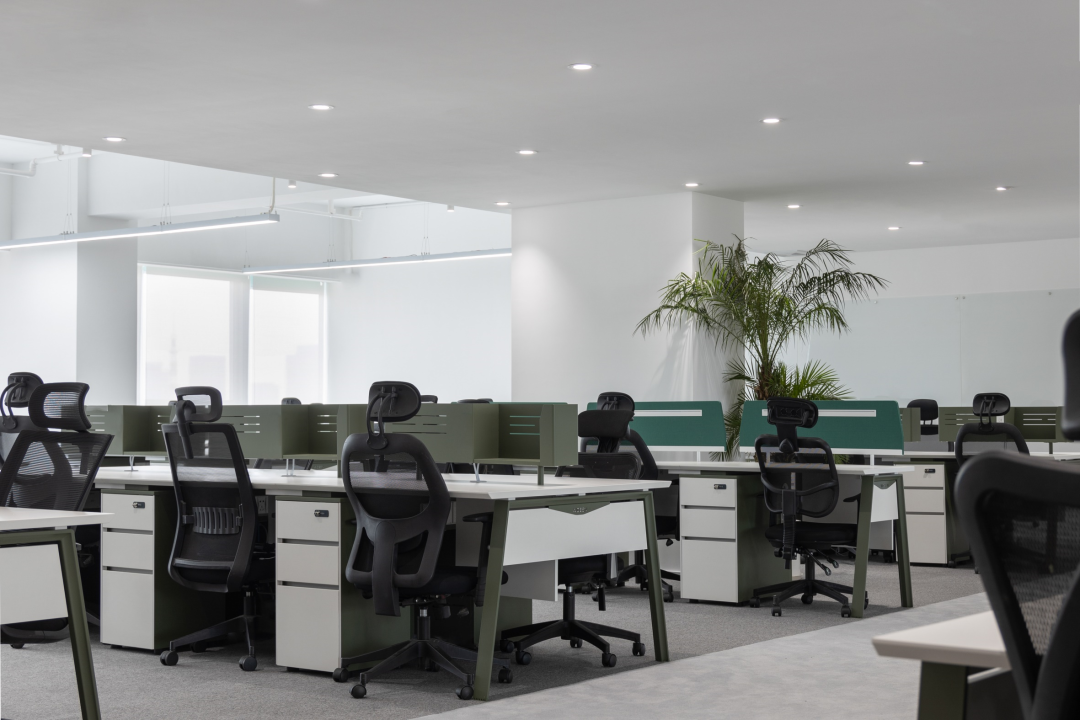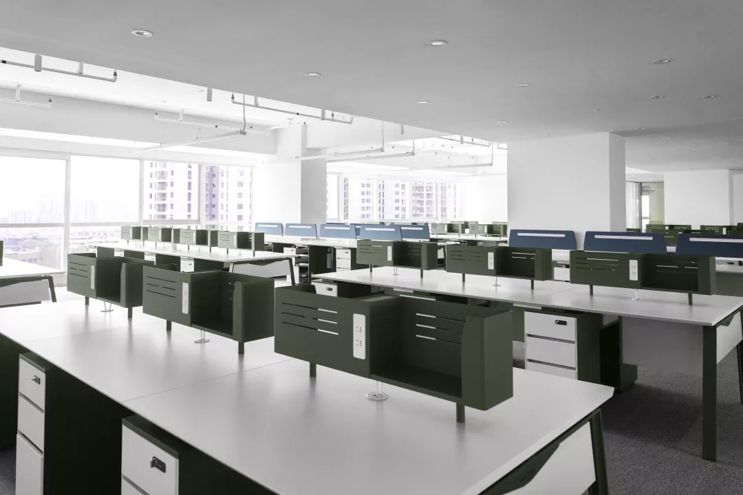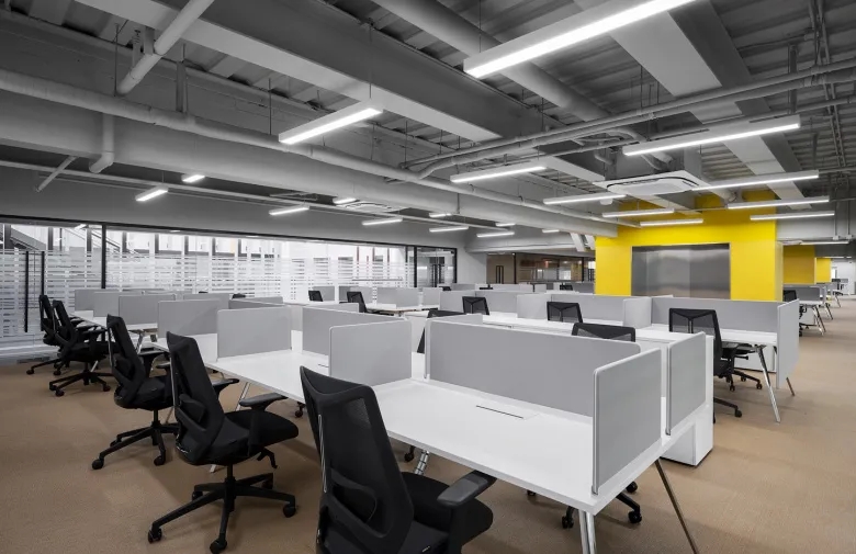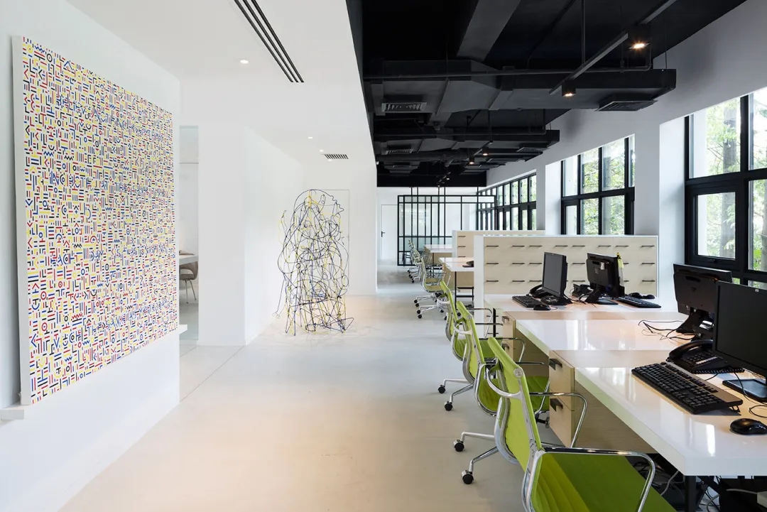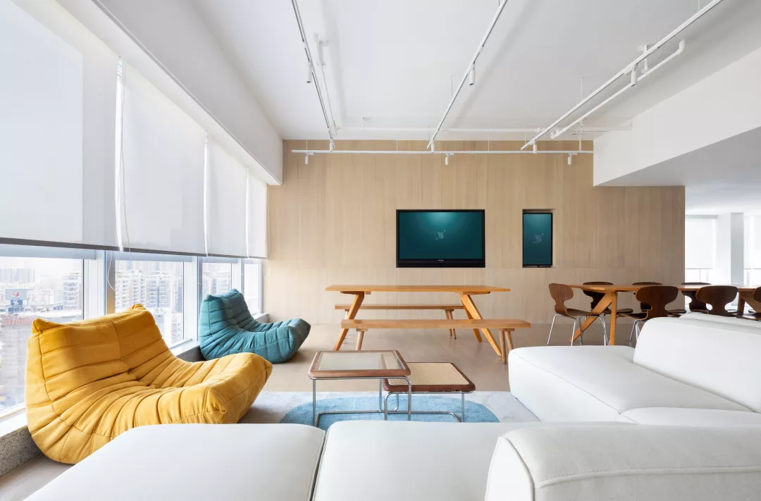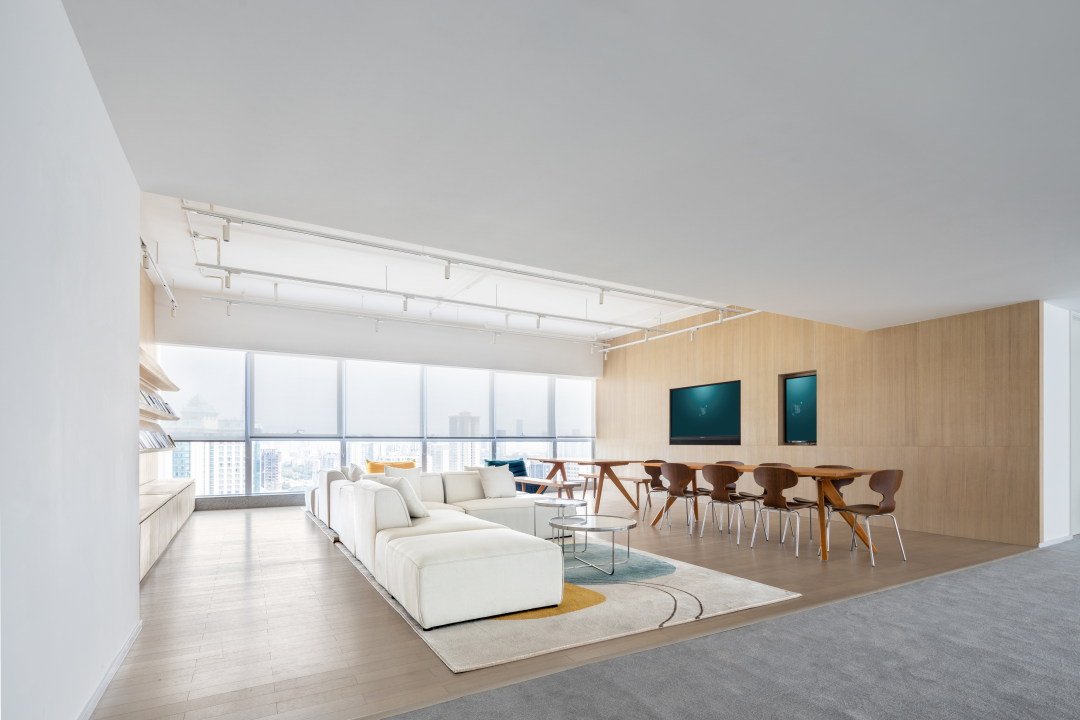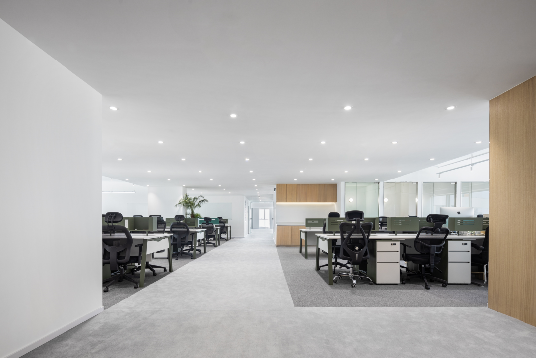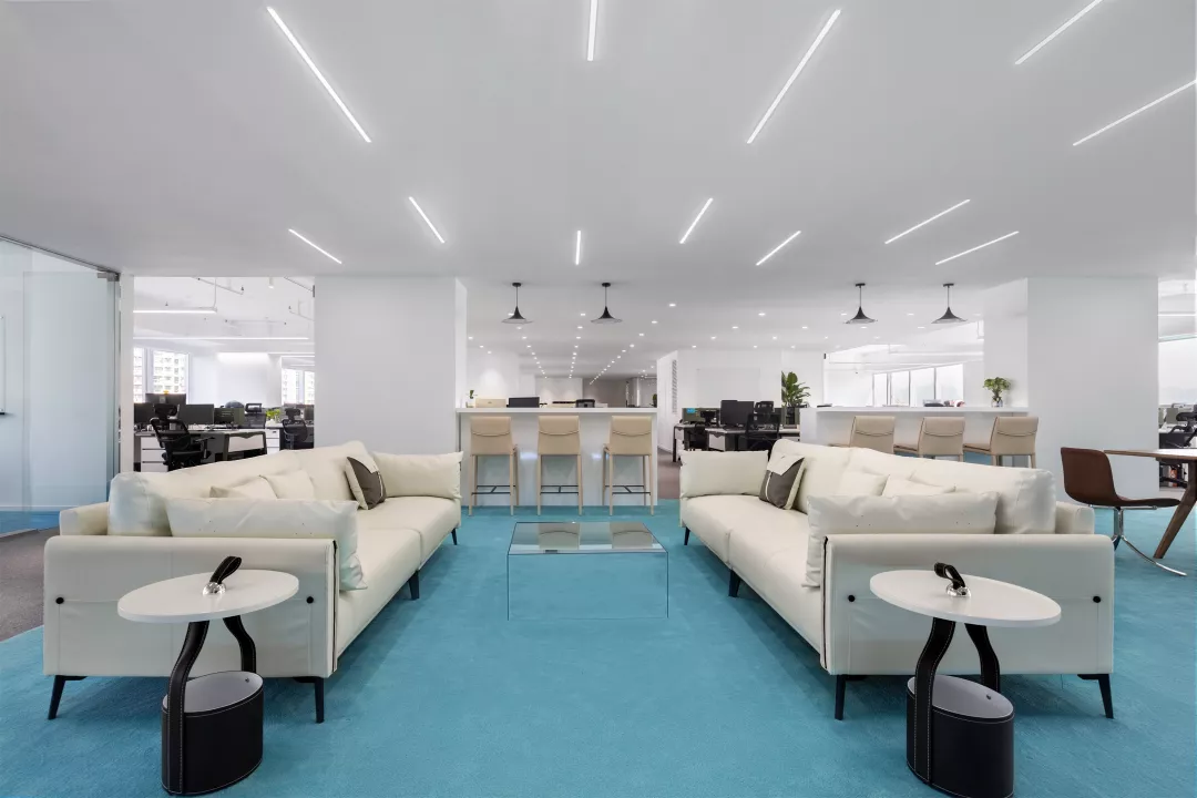 公共办公区面积较大,布局上更加注重凸显现代、开放、创意、舒适的氛围。特别运用了模组化家具,从低饱和度的色彩上划分了功能区块,整洁有序。强大的收纳空间能够满足日常的办公需求。