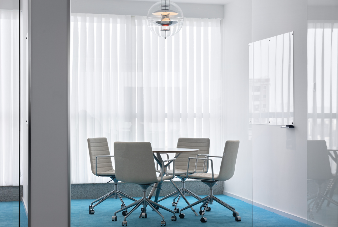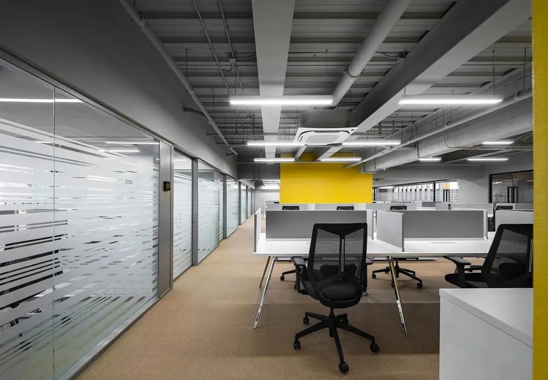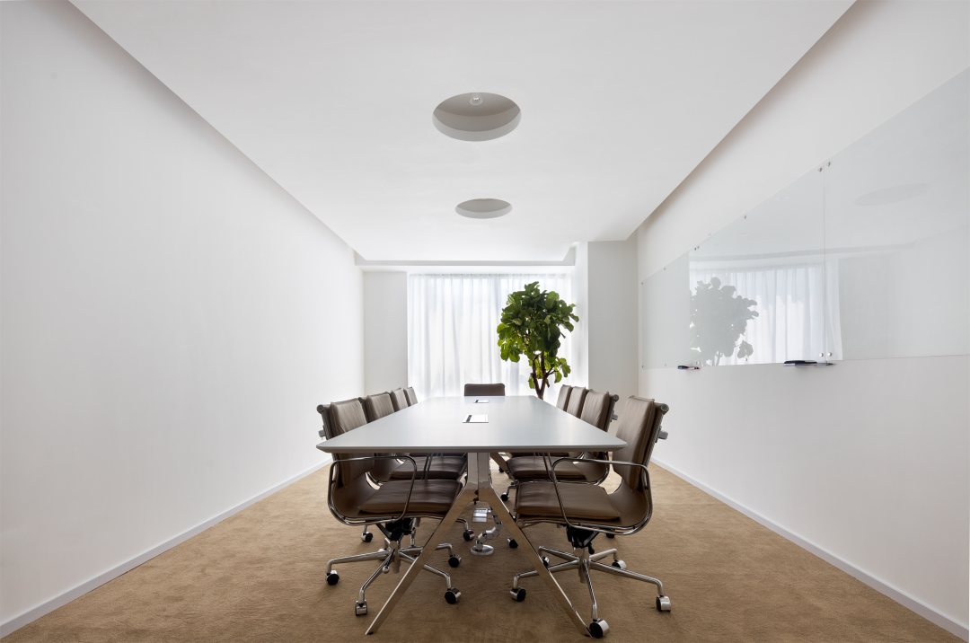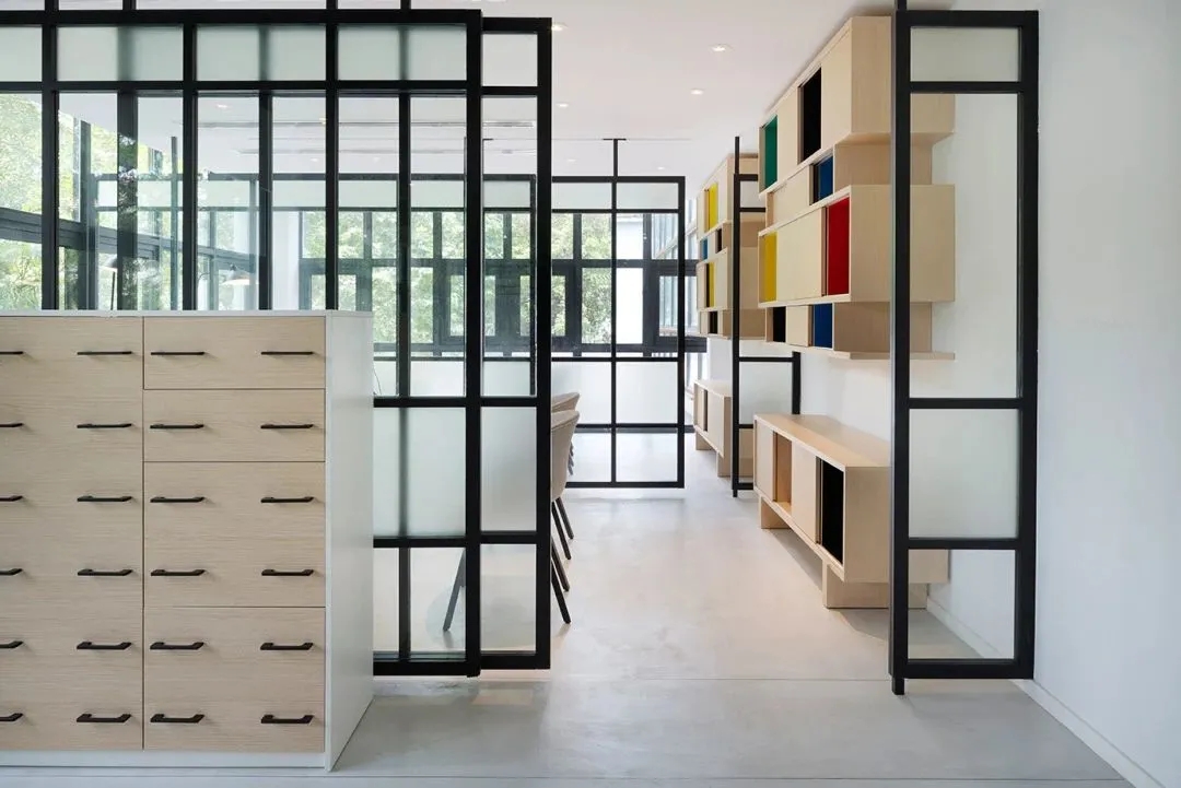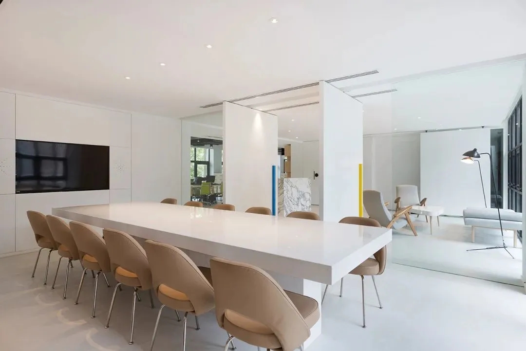 空间共性的表达,会议室以开放办公区展现出一致性和规律性的设计手法。光影、线条、利用纵向的立面设计,挖掘出空间自身的魅力,凸显包豪斯主义的设计
