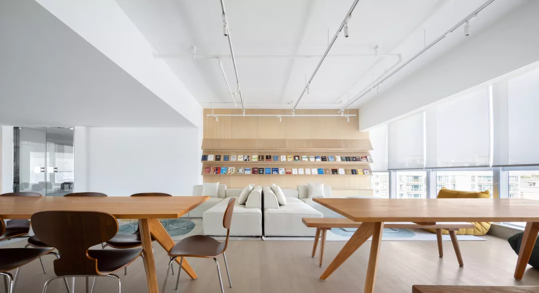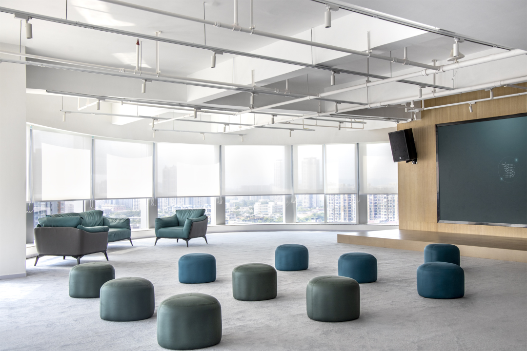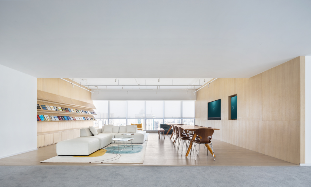 与相对规矩的办公区域相比,供员工阅读、社交的休闲区及路演区,充分显示了企业文化的自由度与功能性,空间面积宽阔,拥有丰富的可变性与创造性。在严谨高效的工作之外,营造一方轻松的空间给员工释放精神压力,或交流、或阅读、或创作。