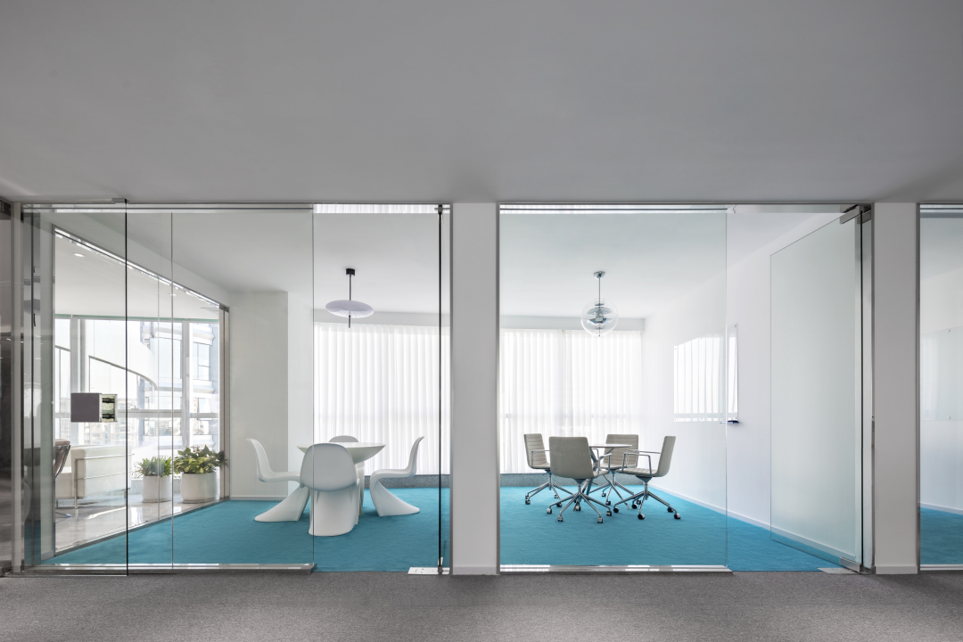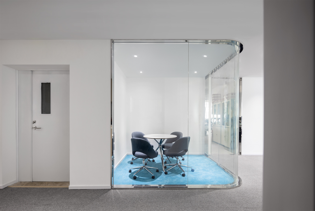 精致小巧的洽谈室置于视野较好的景观方位,使用透明的落地玻璃代替传统的实体墙,令区域之间开始变得轻盈且通透。室外光线的转化,凸显出简单却充满意向的美学设计,以及空间的多样性。