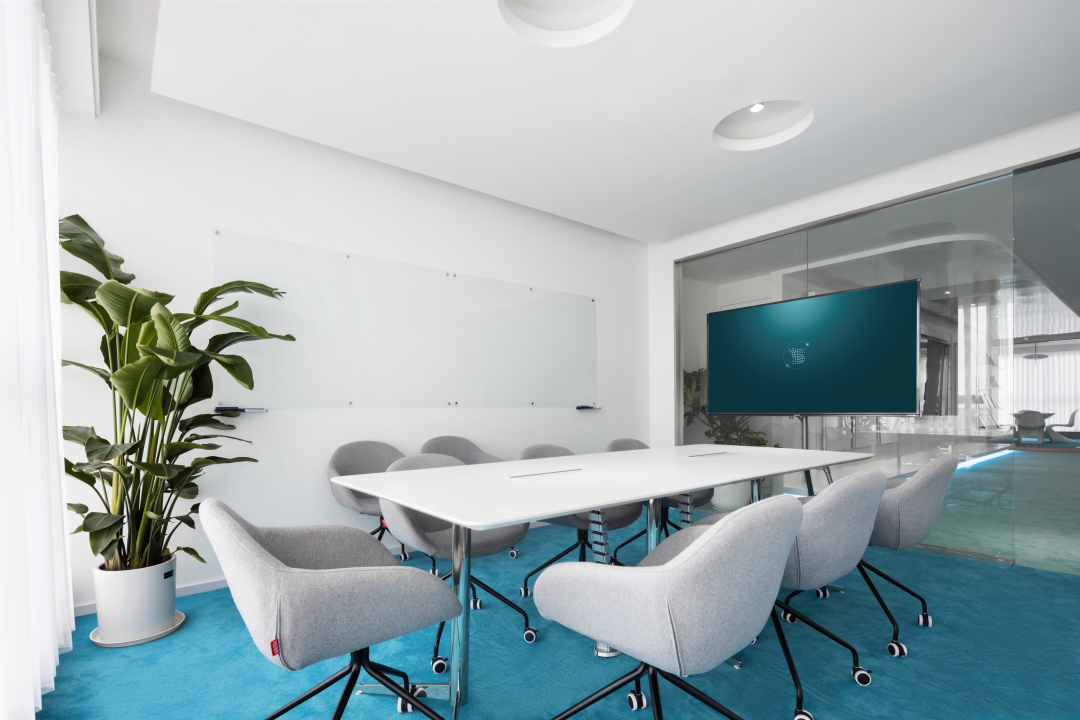 集中了会议和会客等对外的公共空间,虽有物理上的阻隔但视线却可相互穿透,为更加贴合科技感的舒适办公环境,着力趋于现代风格。桌椅组合以带有温度的大地色系为主,科技蓝地毯作为空间的点睛之笔,面与点之间相互交汇、重叠、融合。深与浅开始进行趣味对话。