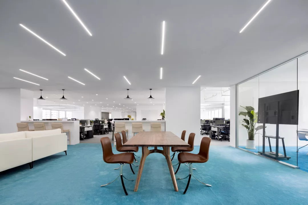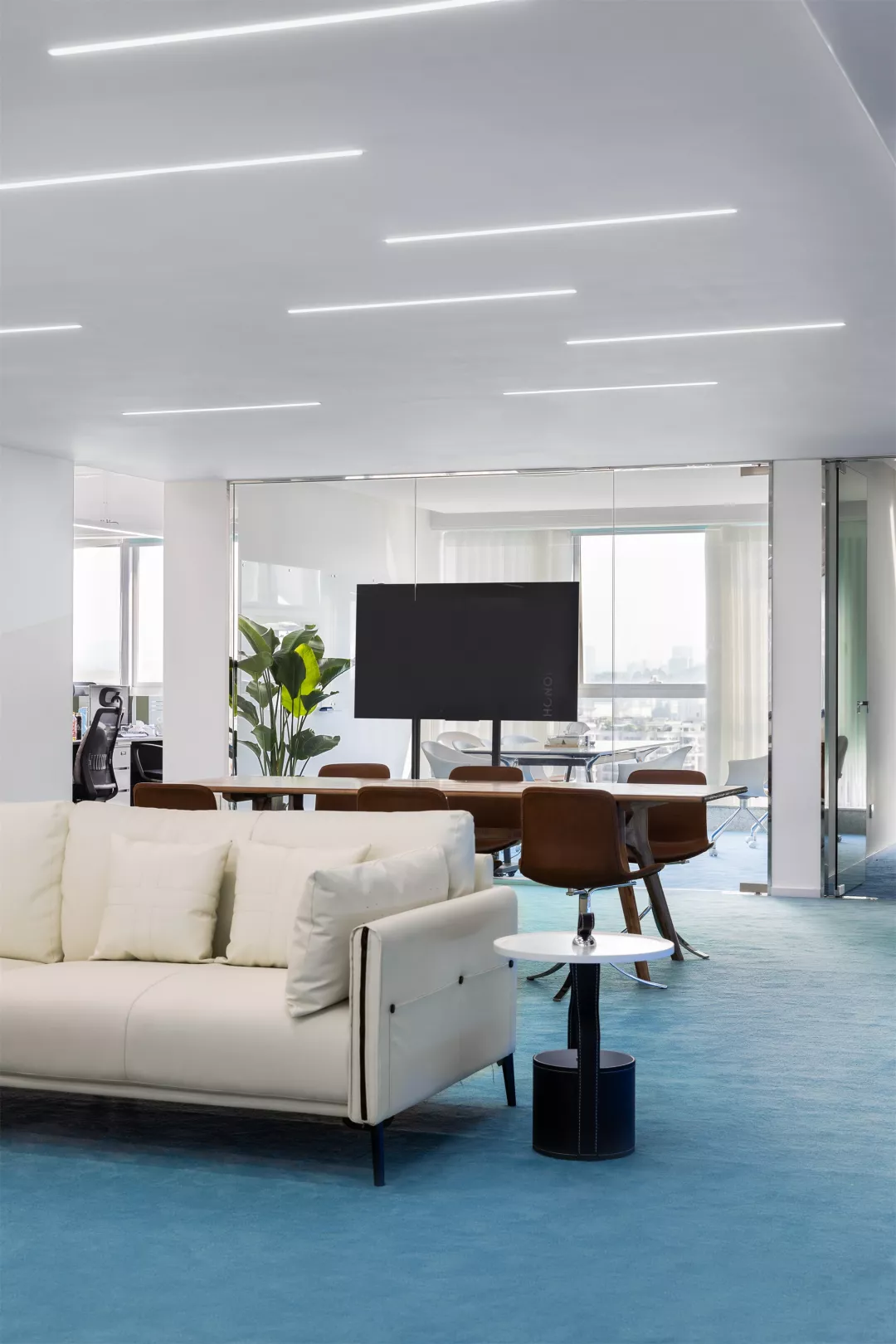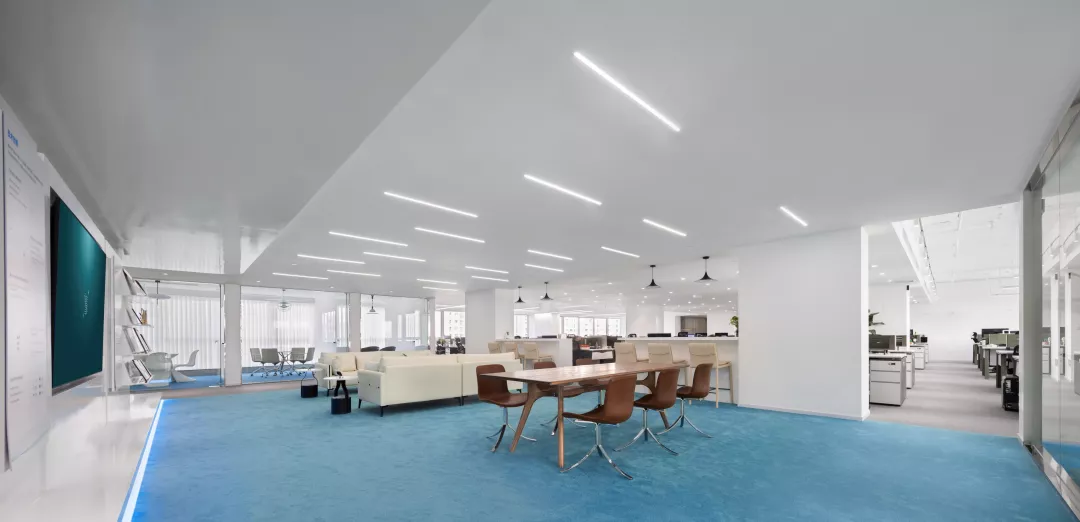 主要以企业VI色制作的地毯为界,区别开公共办公区。吊顶采用内嵌式线性条形灯,平行分布,错列处理,作为现代材料介入地面、顶面与墙面,形成连续的光环。纵深上灯光效果的拉力变化与对比,凸显出科技与未来的企业形象。