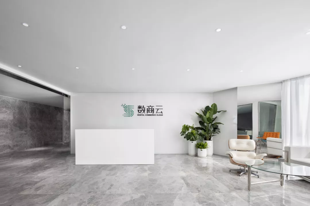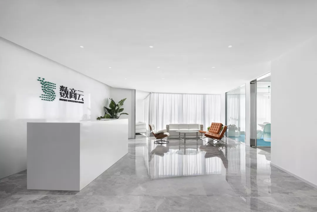前厅是企业品牌的展示,从第一印象到情绪感知,往往是设计团队探索与思考的核心。从电梯间移步而出,明亮悦目的企业LOGO墙引人注目,品牌传达的专业性在此刻便植入了人的感官之中。U型接待台的整体用精致抛光面打造,纯白的色系呼应视觉范围内的简洁布局,增加空间的纯粹性与对比性。使用高级灰瓷砖进行墙地大面积通铺,配合内嵌式筒灯映射出柔和的线条,渲染出空间印象。