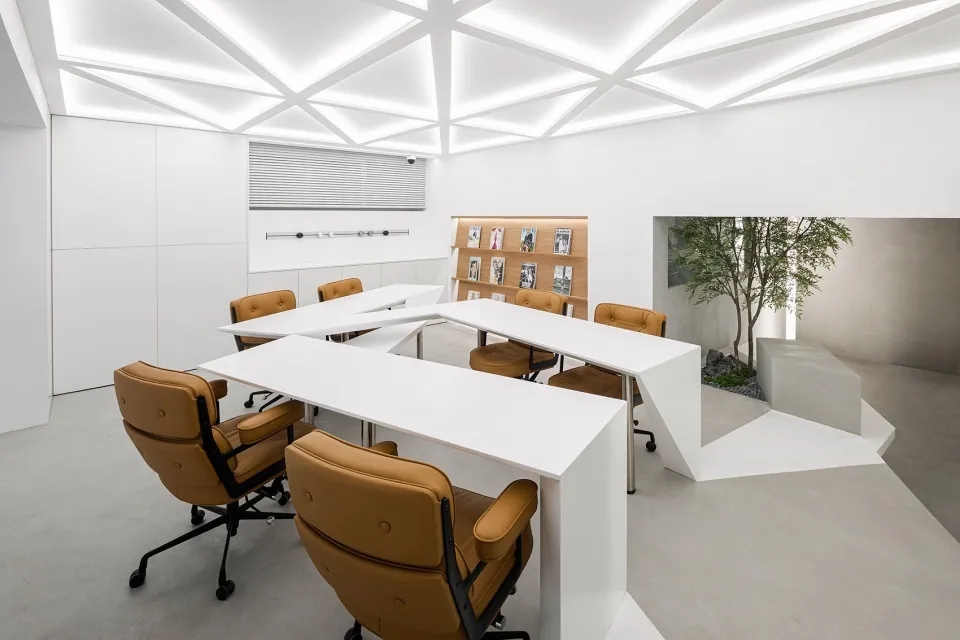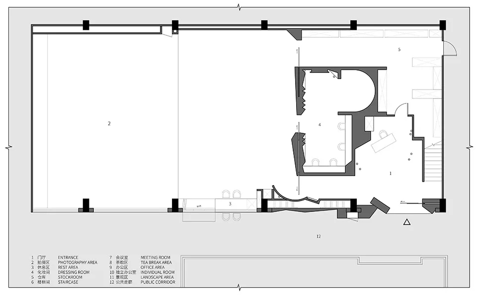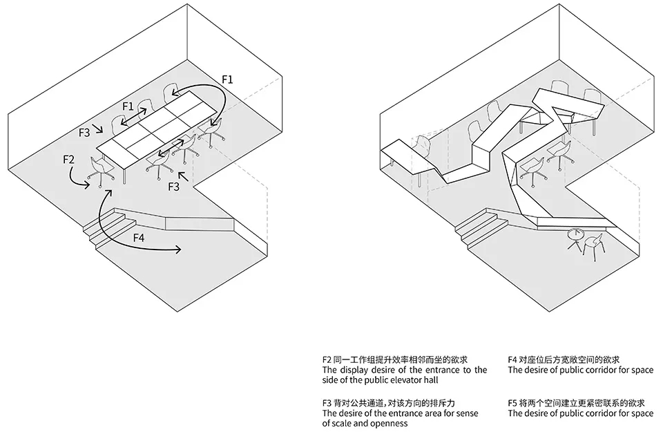 办公桌形态对空间场力的回应The response of desk form to spatial force内部办公分为三个部门,每个部门有两人,并提出了两两一组的工位布置需求。设计师在有限的空间内实现既紧凑又分离的状态是办公区的设计重点。