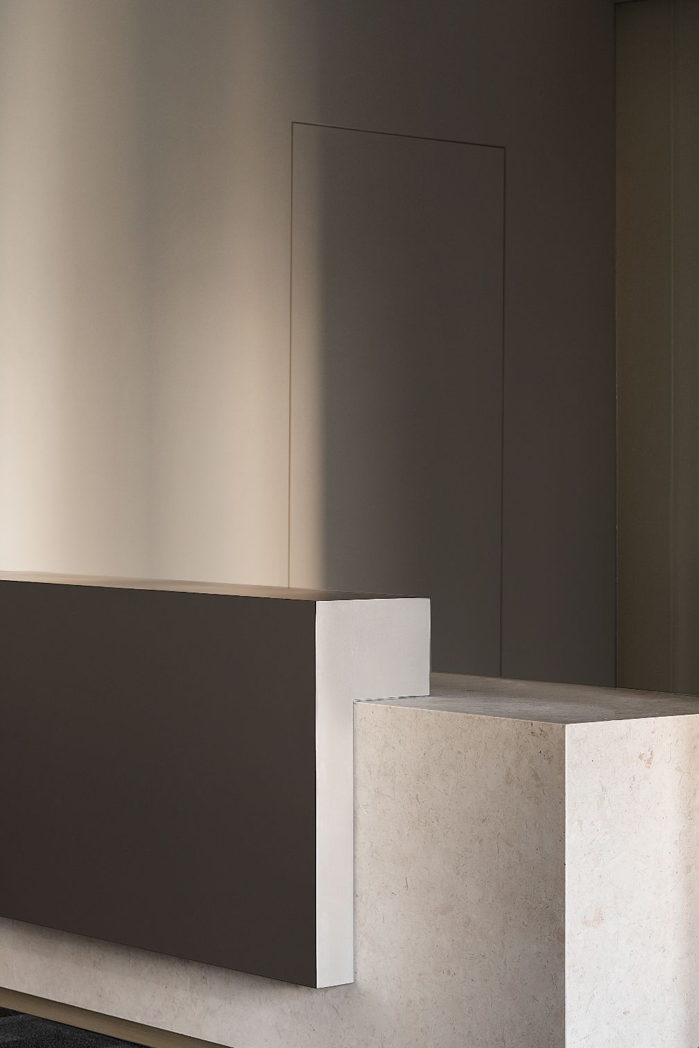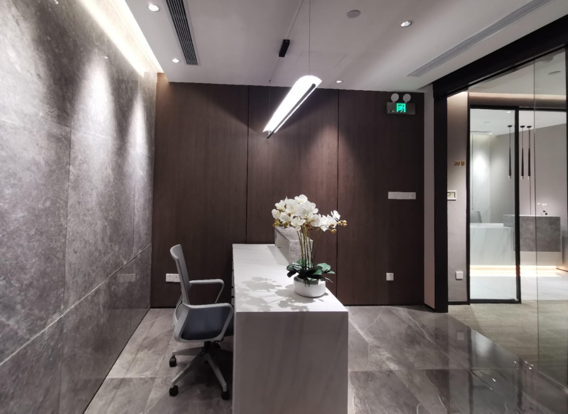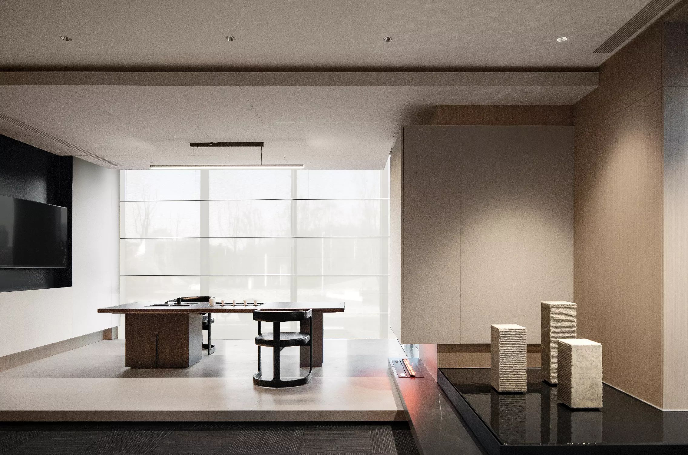 进门的迎宾区给到访的客户呈现了一个开阔的视觉空间,设计师将空间打开,将北面的阳光引入整个空间,是首次进入公司的人感受到空间赋予品牌的气场。