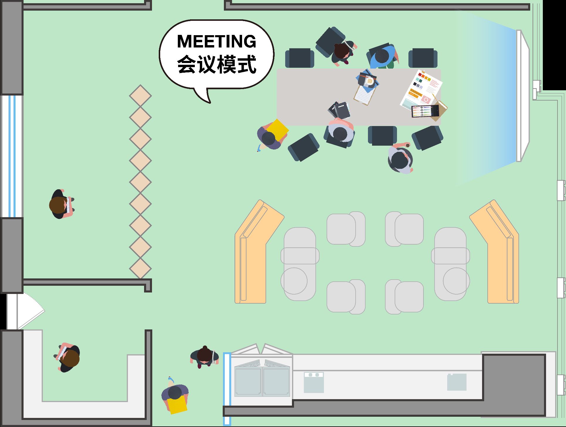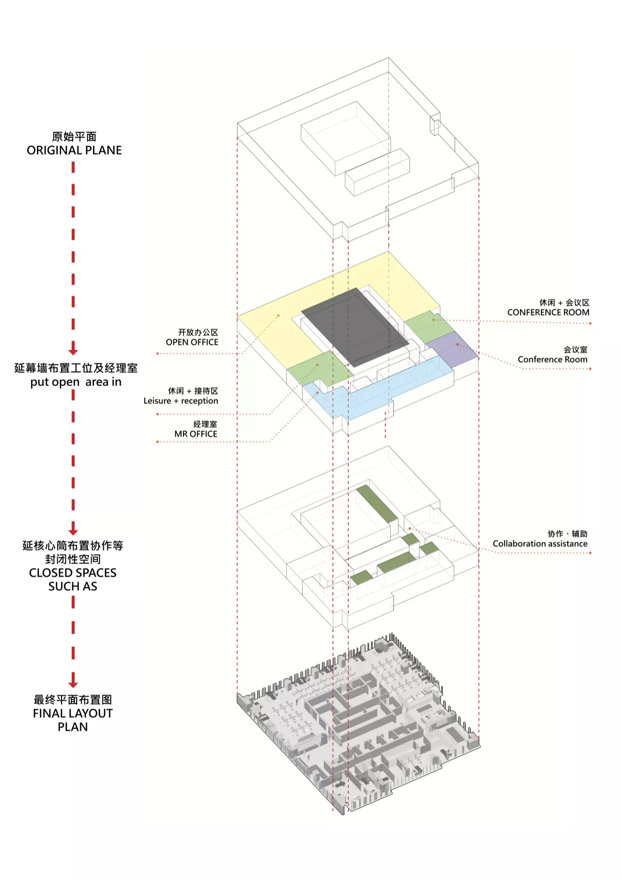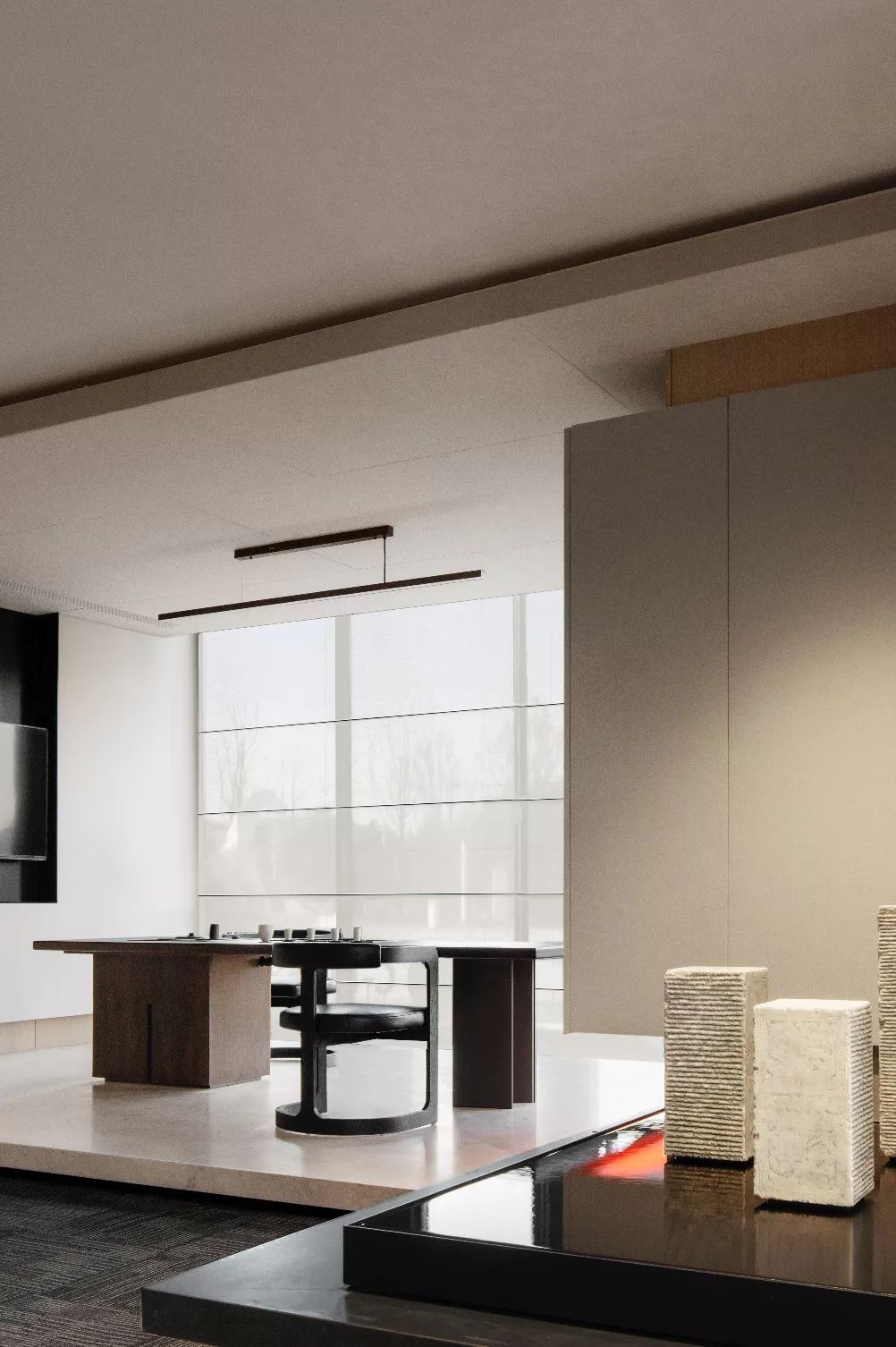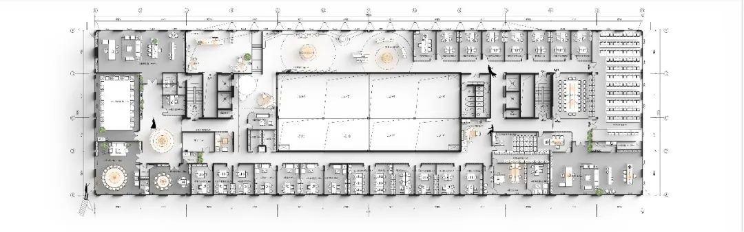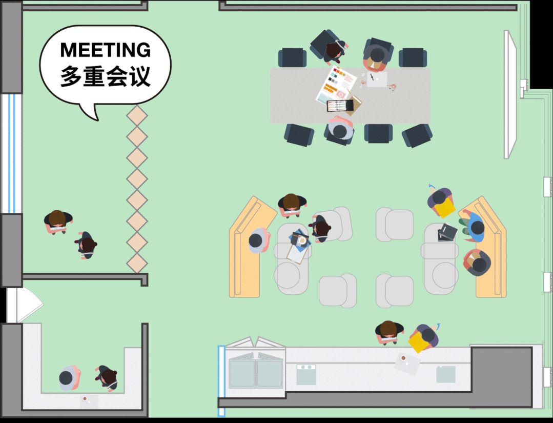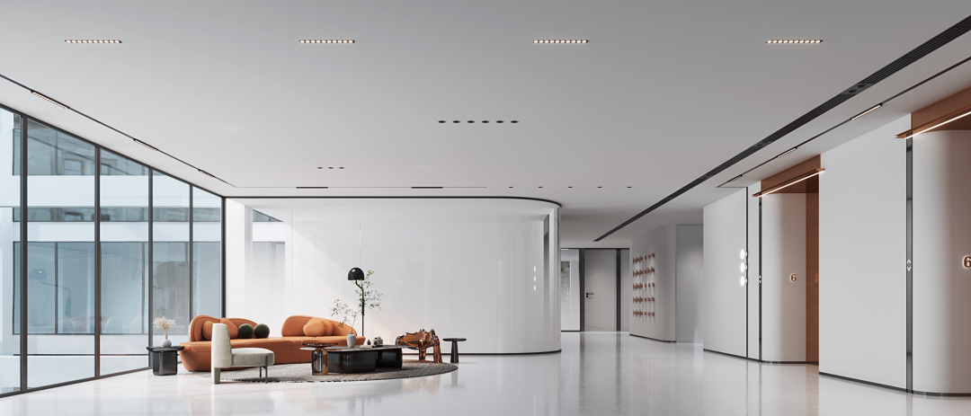 从迎宾区开始,设置的环形的动线布局,使不同的人群进行分流,客人不必穿过集体工作空间就可以进入到需要到达的区域,员工也在路程上减少了不必要的浪费。