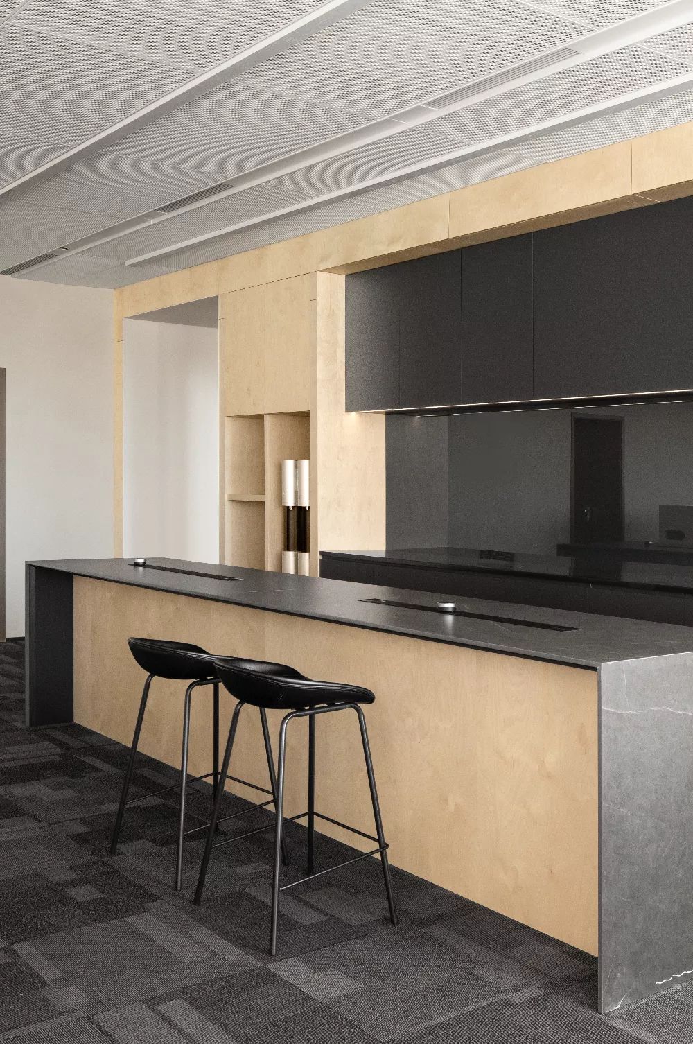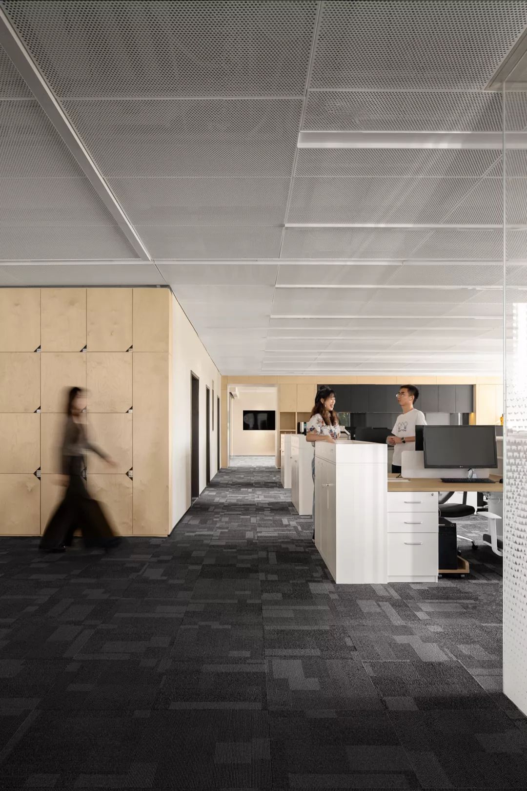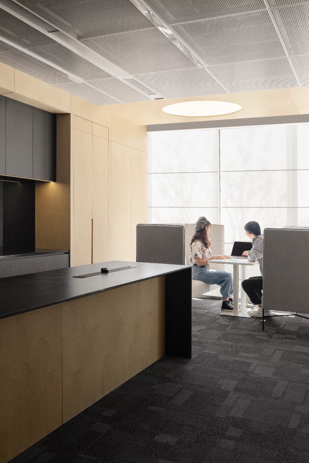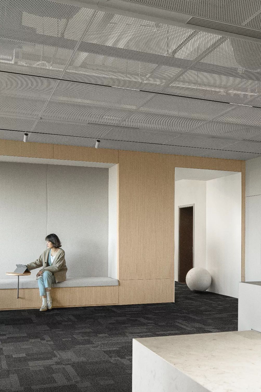 公共办公区采用大面积的中性色桦木海洋板,营造出秩序、沉静、平衡之感,桦木板在开放办公区被广泛使用大面积使用,在墙板柜门上形成统一化的视觉语言,原始结构和顶面穿孔铝板、墙面的白色艺术涂料形成空间的留白。