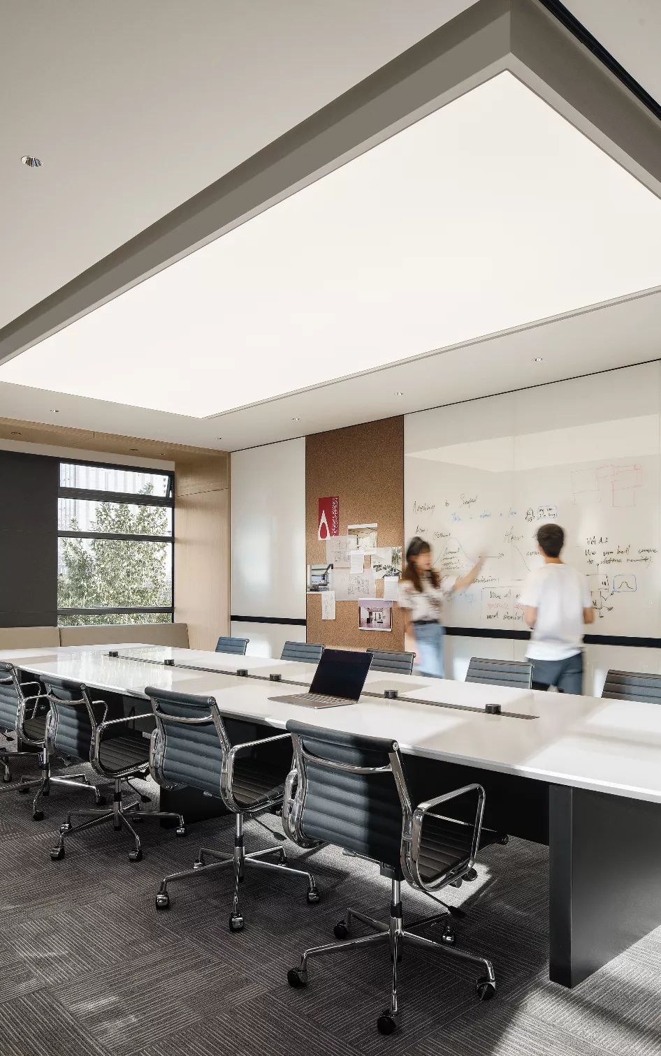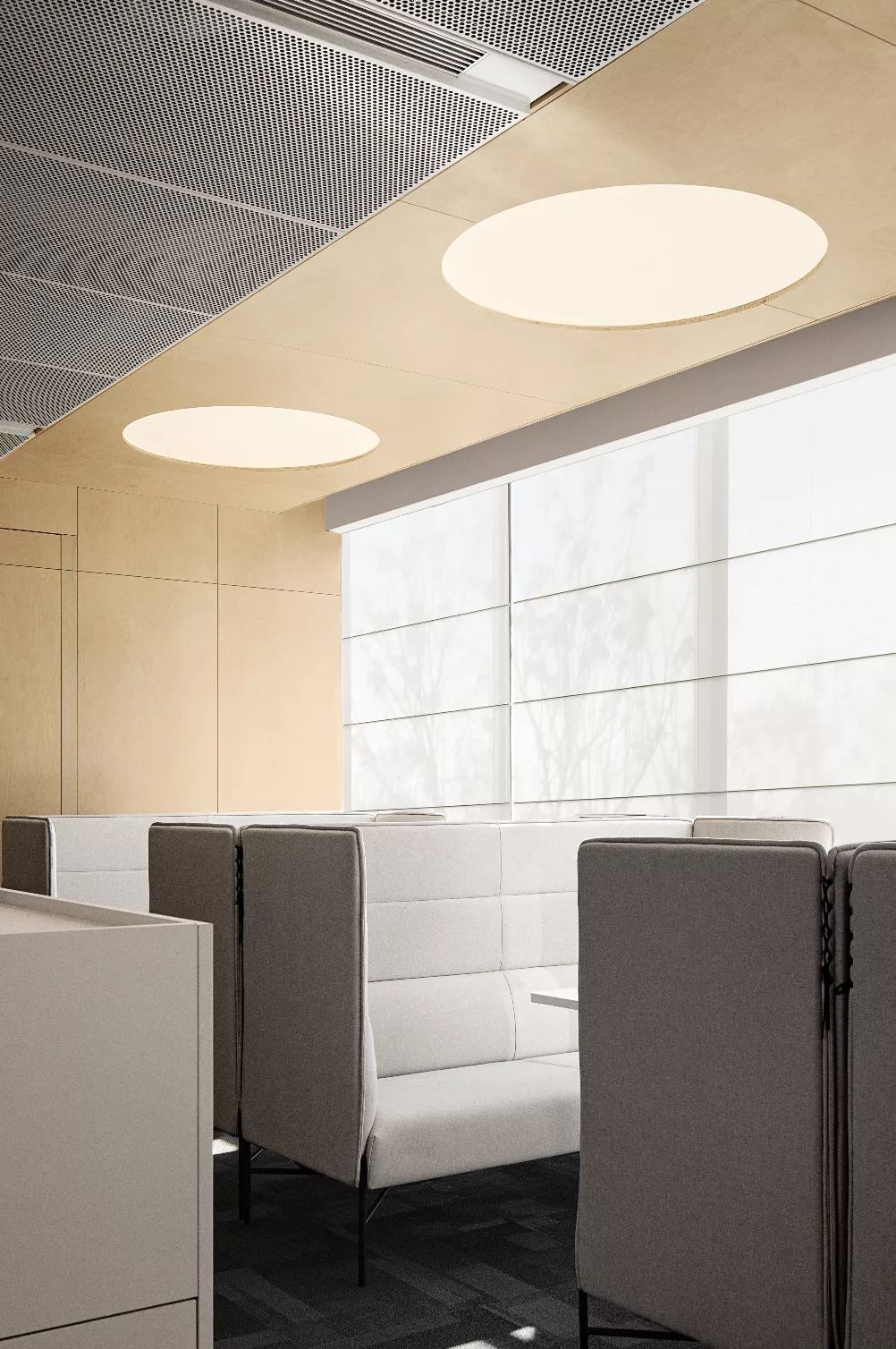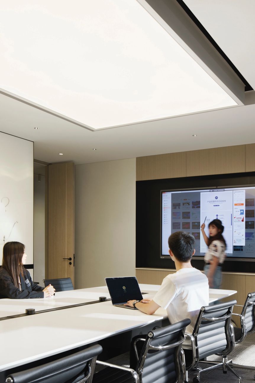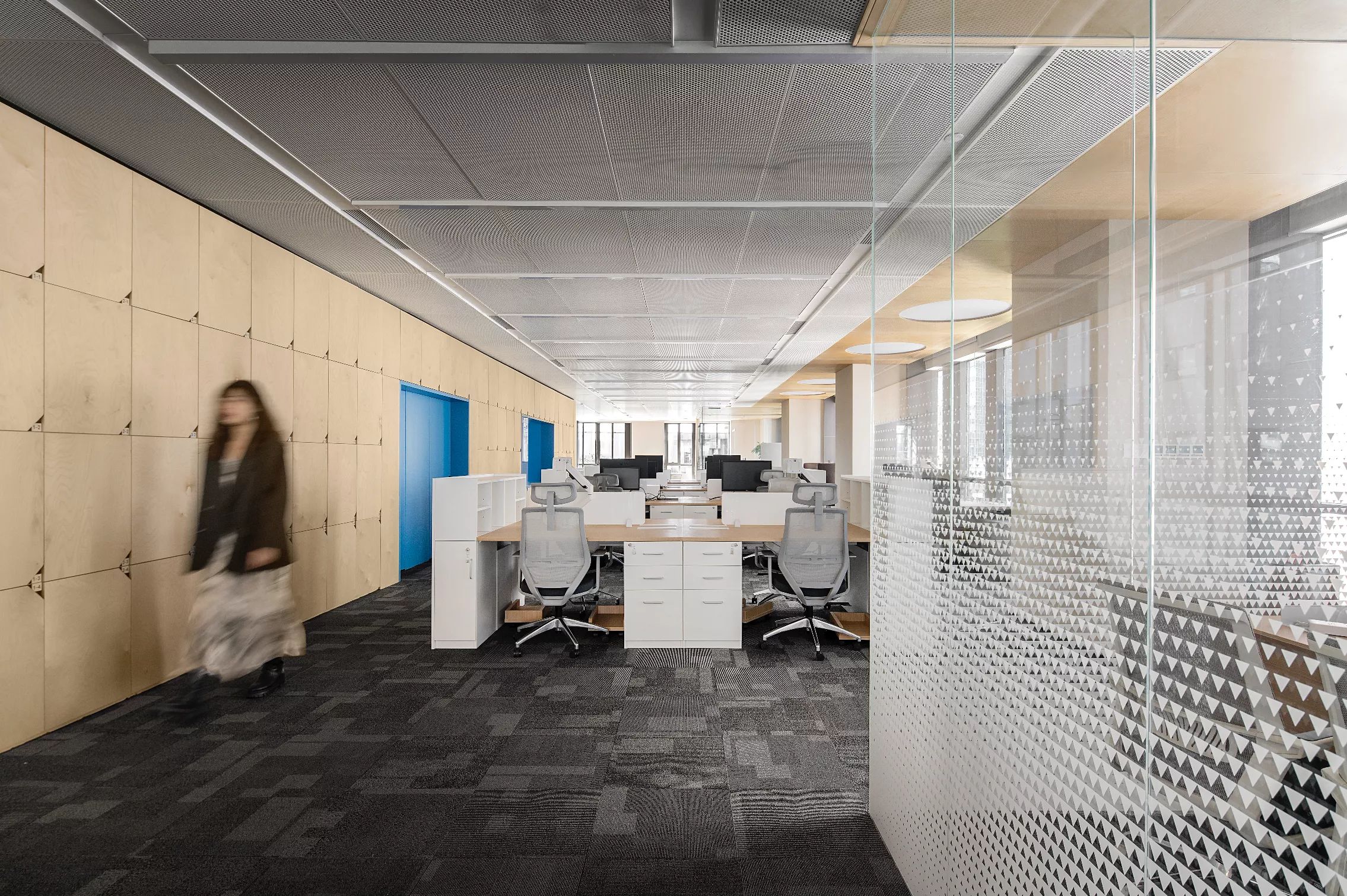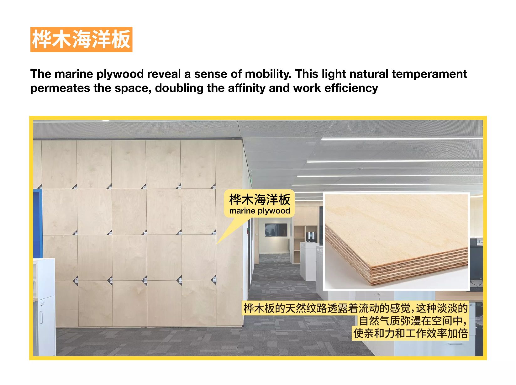 公共办公区采用大面积的中性色桦木海洋板,营造出秩序、沉静、平衡之感,桦木板在开放办公区被广泛使用大面积使用,在墙板柜门上形成统一化的视觉语言,原始结构和顶面穿孔铝板、墙面的白色艺术涂料形成空间的留白。