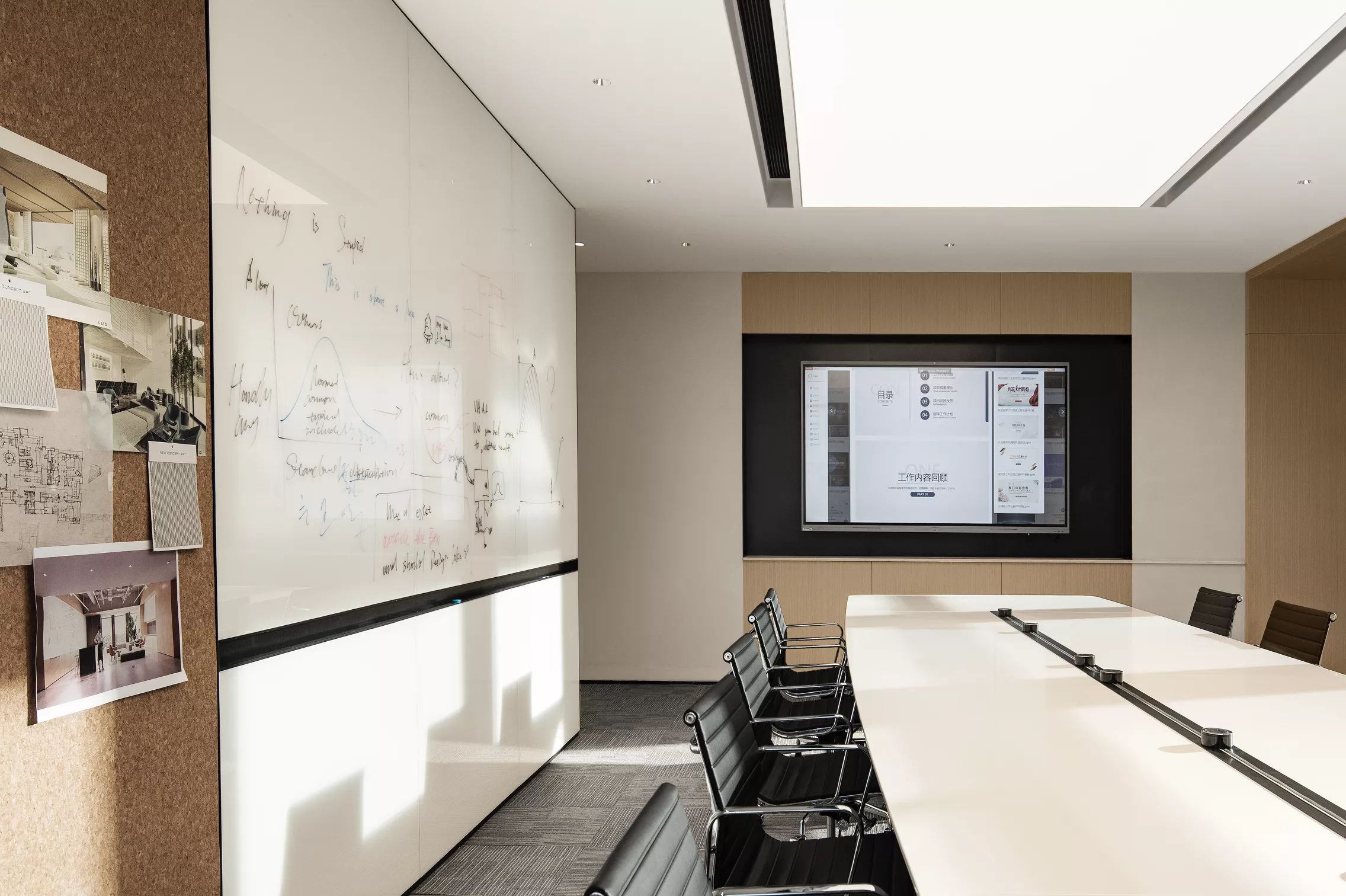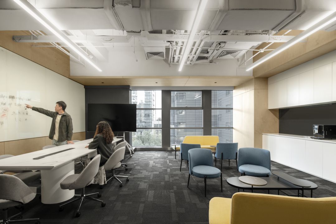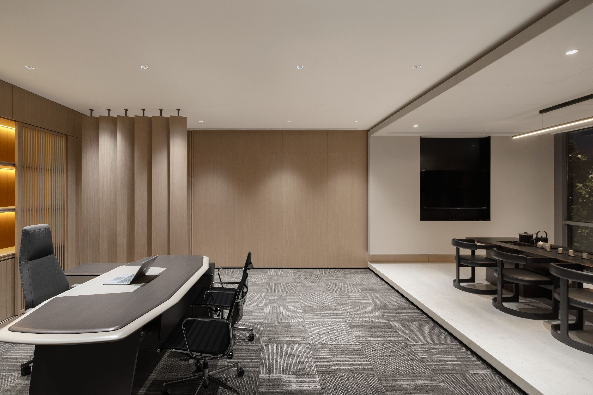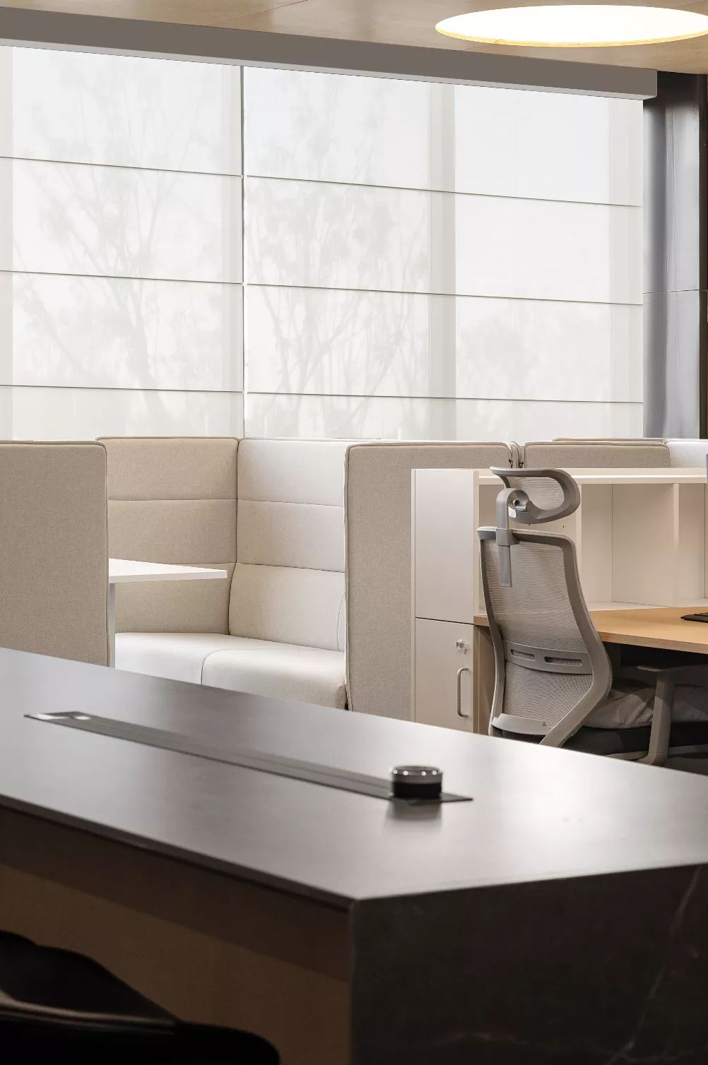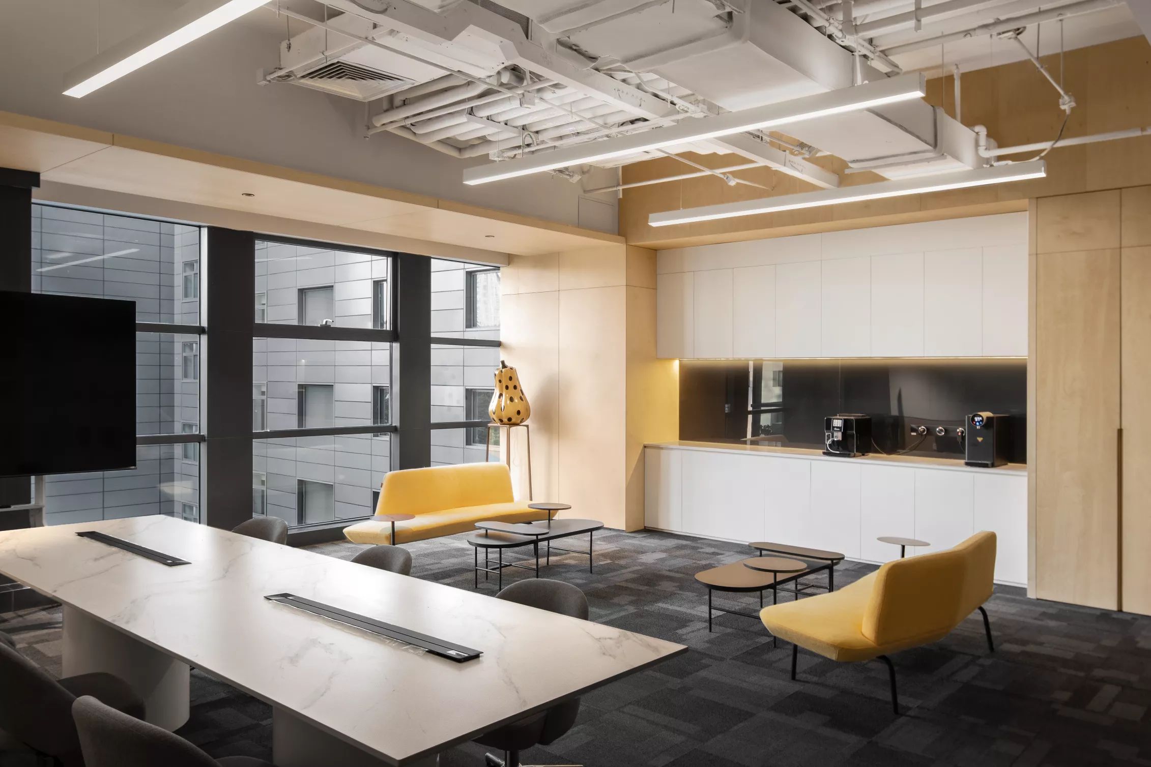 公共办公区采用大面积的中性色桦木海洋板,营造出秩序、沉静、平衡之感,桦木板在开放办公区被广泛使用大面积使用,在墙板柜门上形成统一化的视觉语言,原始结构和顶面穿孔铝板、墙面的白色艺术涂料形成空间的留白。