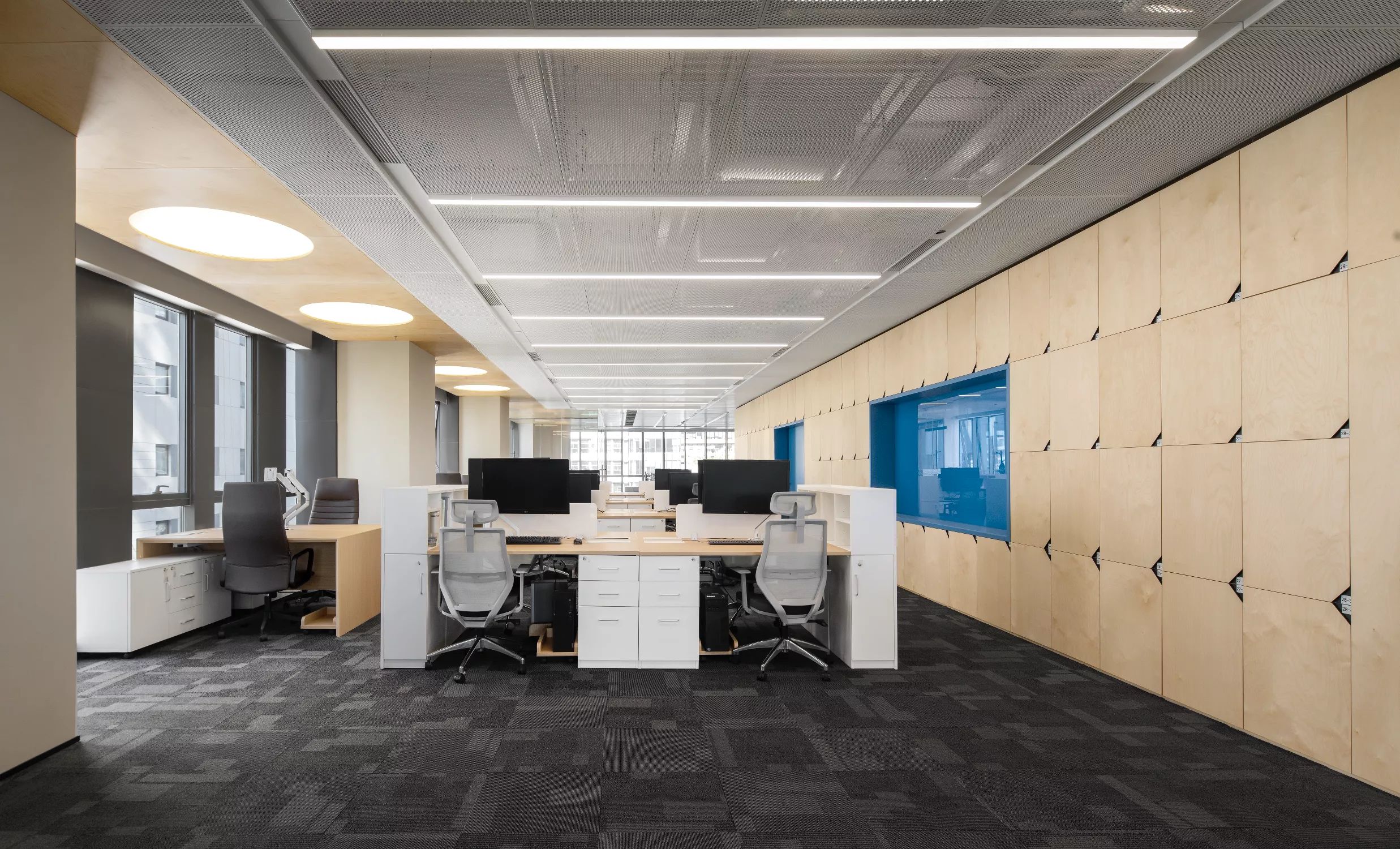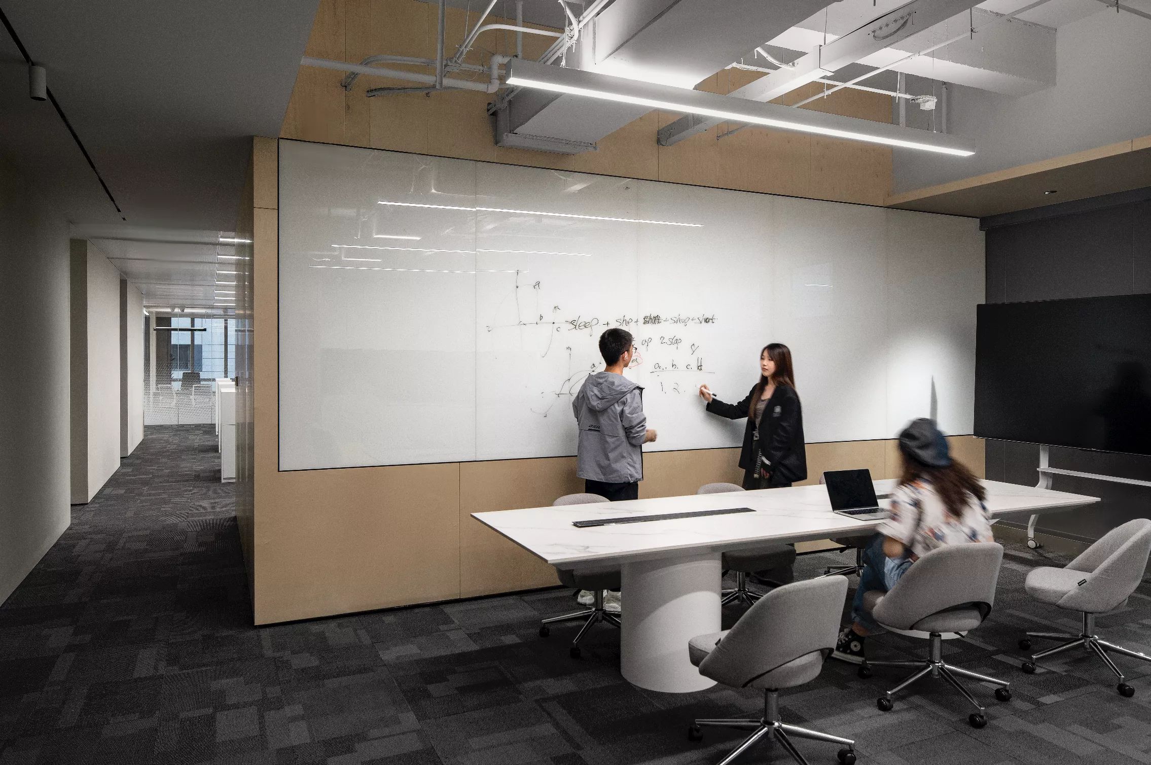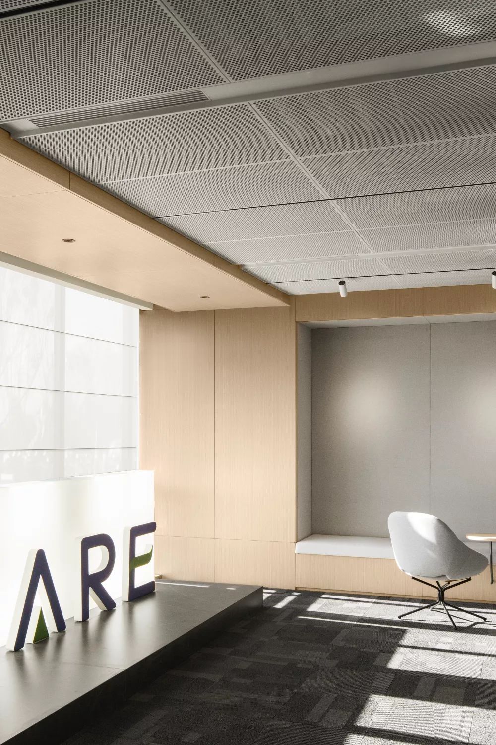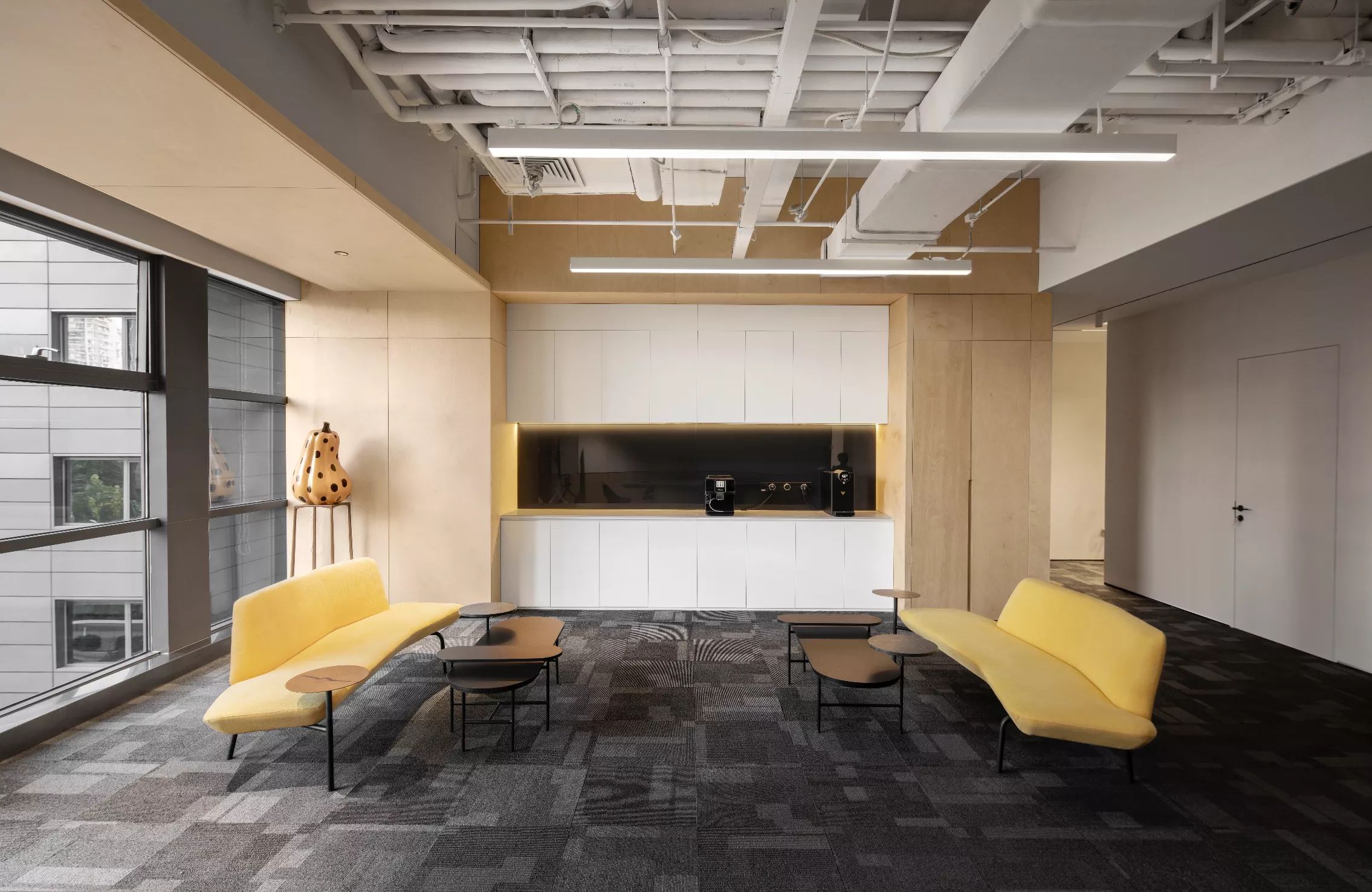 公共办公区采用大面积的中性色桦木海洋板,营造出秩序、沉静、平衡之感,桦木板在开放办公区被广泛使用大面积使用,在墙板柜门上形成统一化的视觉语言,原始结构和顶面穿孔铝板、墙面的白色艺术涂料形成空间的留白。