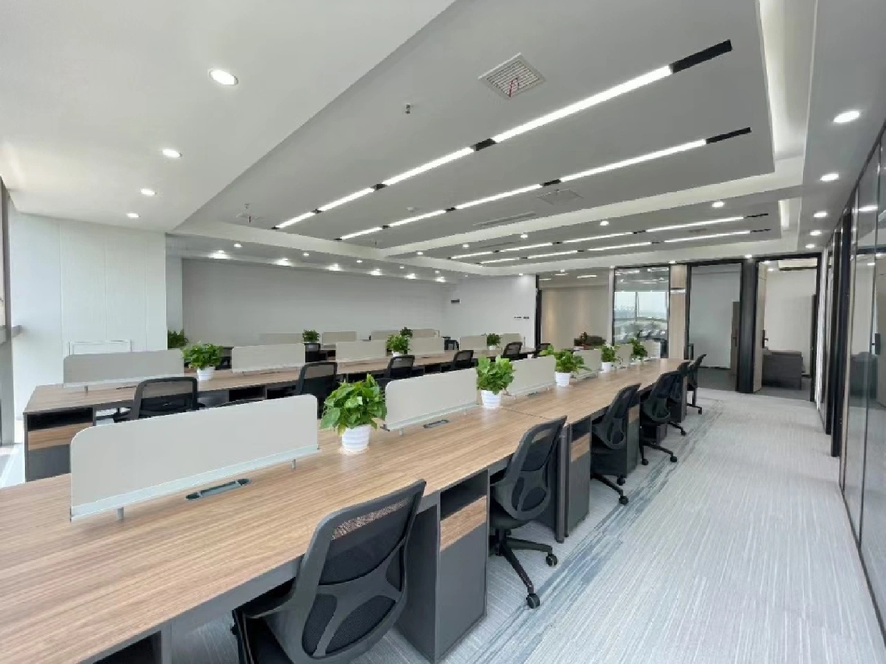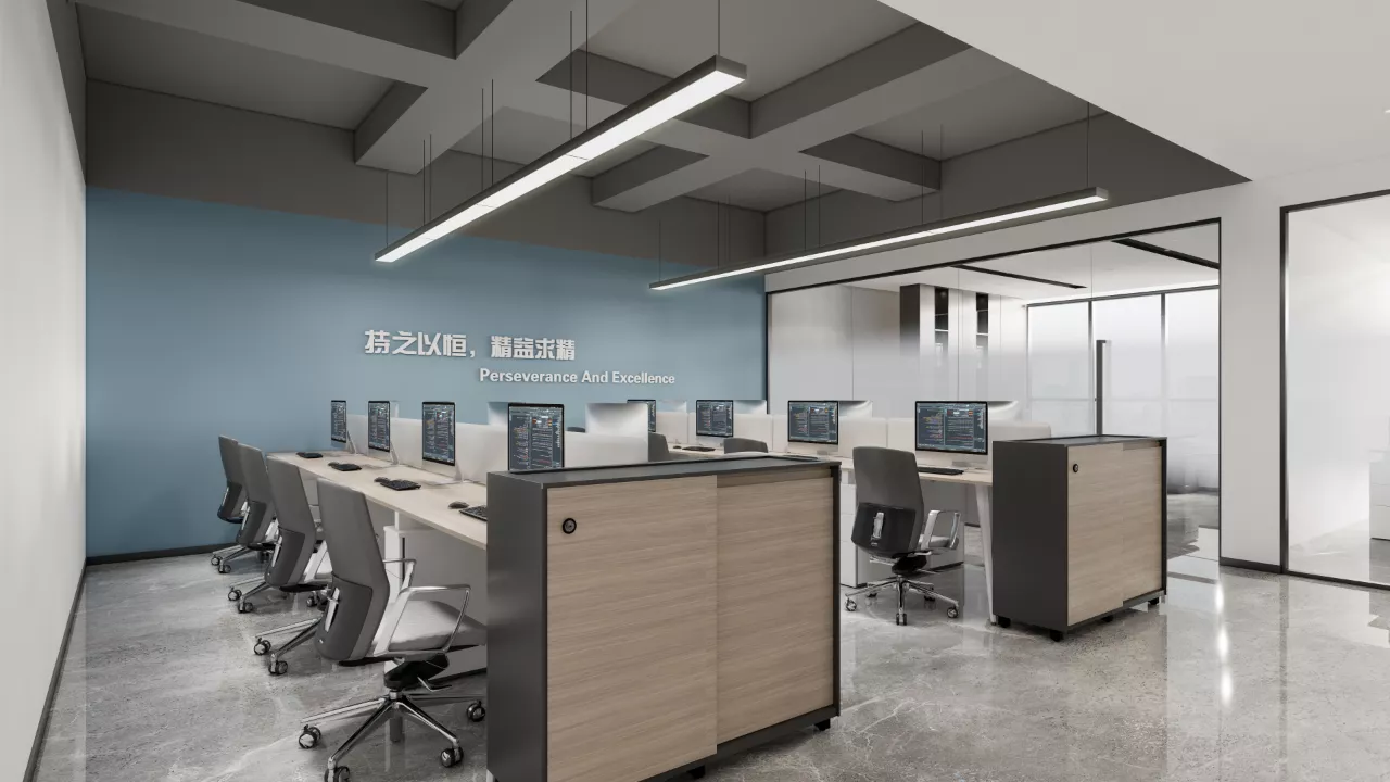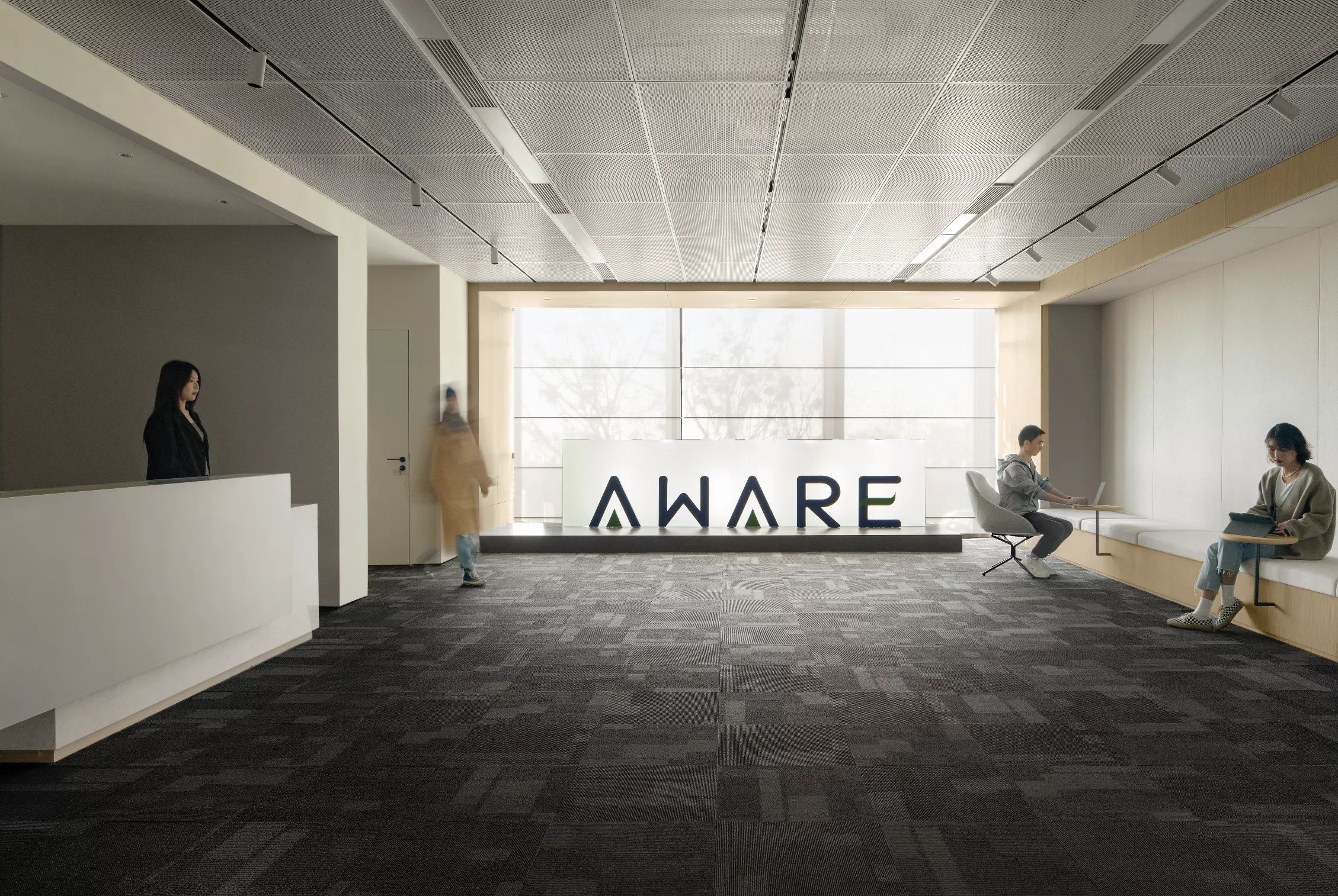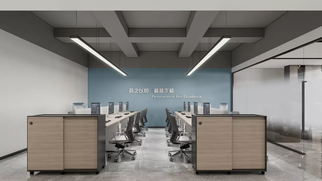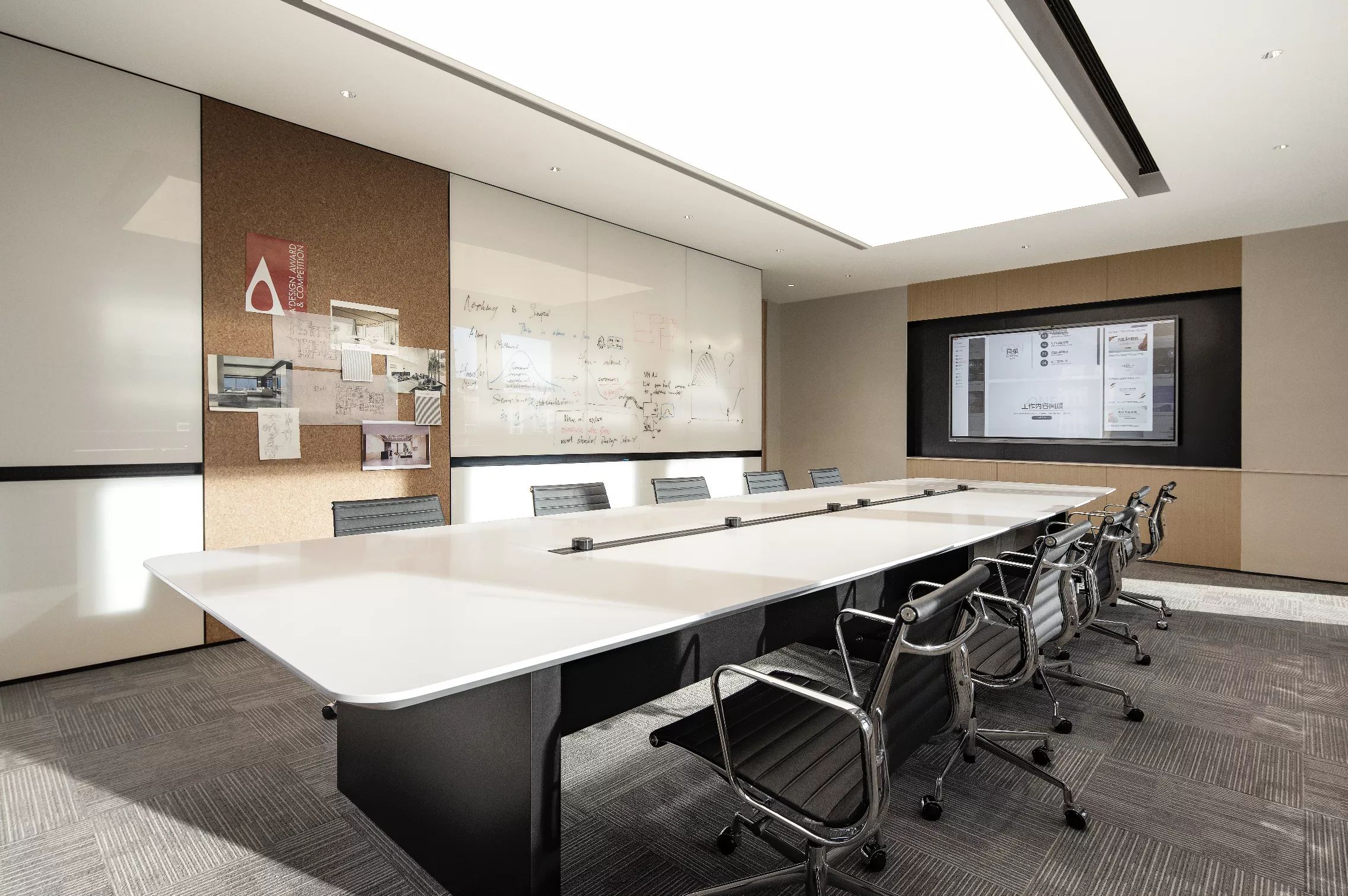 公共办公区采用大面积的中性色桦木海洋板,营造出秩序、沉静、平衡之感,桦木板在开放办公区被广泛使用大面积使用,在墙板柜门上形成统一化的视觉语言,原始结构和顶面穿孔铝板、墙面的白色艺术涂料形成空间的留白。