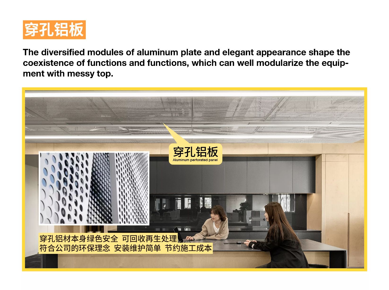 穿孔铝材本身绿色安全,兼具回收再生处理,环保节能等特点,符合本次业主公司的环保生产理念。安装维护简单,节约施工成本,铝板多样化的模块和优雅的外观塑造功能与功能共存,可以很好的把顶面凌乱的设备进行模块化处理。