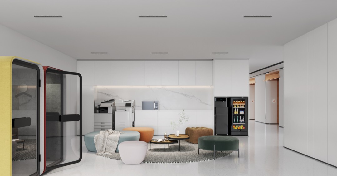 穿过公共办公区来到复合的社交空间,这里可以是多重会议的灵感探讨,也可以是跨领域的主题社交,更可以变身为举办讲座的会场。多种功能的重合将人们聚集在一起,共同将办公室作为社区中心来运营。