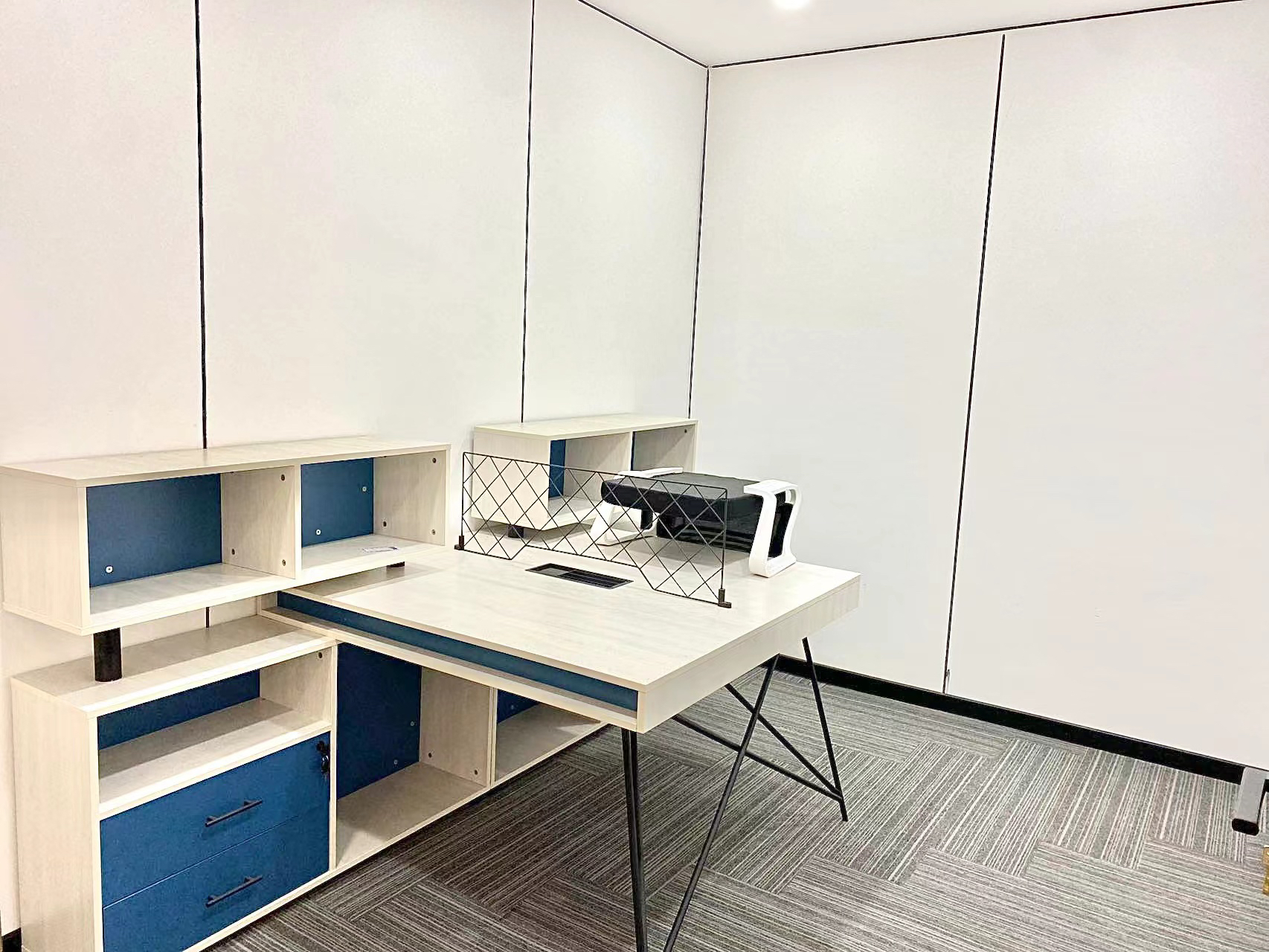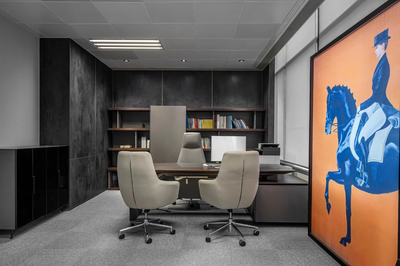 在开放办公区最深处的一面白色烤漆墙面中隐蔽了两间办公室,董事长办公室就在其中。推开隐蔽门一面耀眼的爱马仕屏风惊现眼前,稳重大气的深咖色书柜和工作台搭配灰色的地毯让董事长办公室给人非常踏实诚信的心理感受。