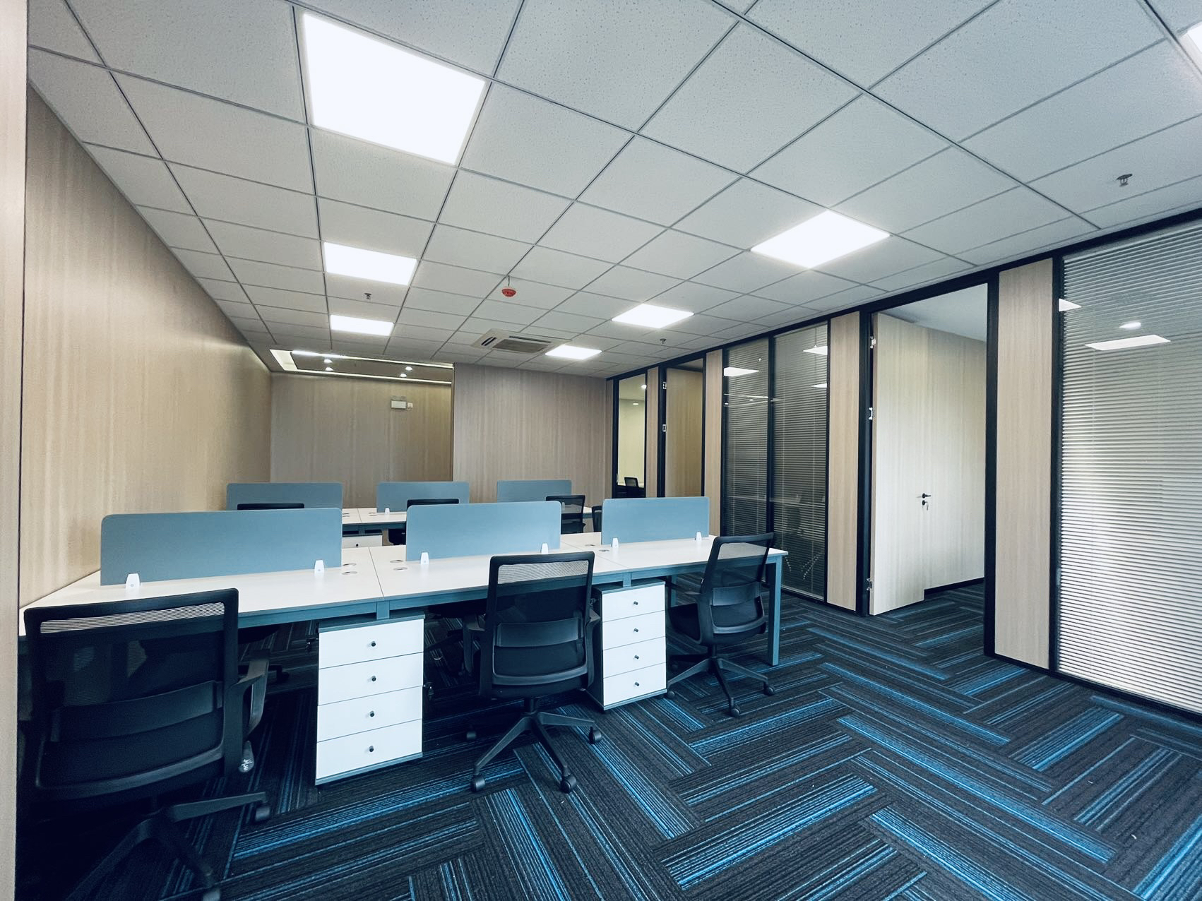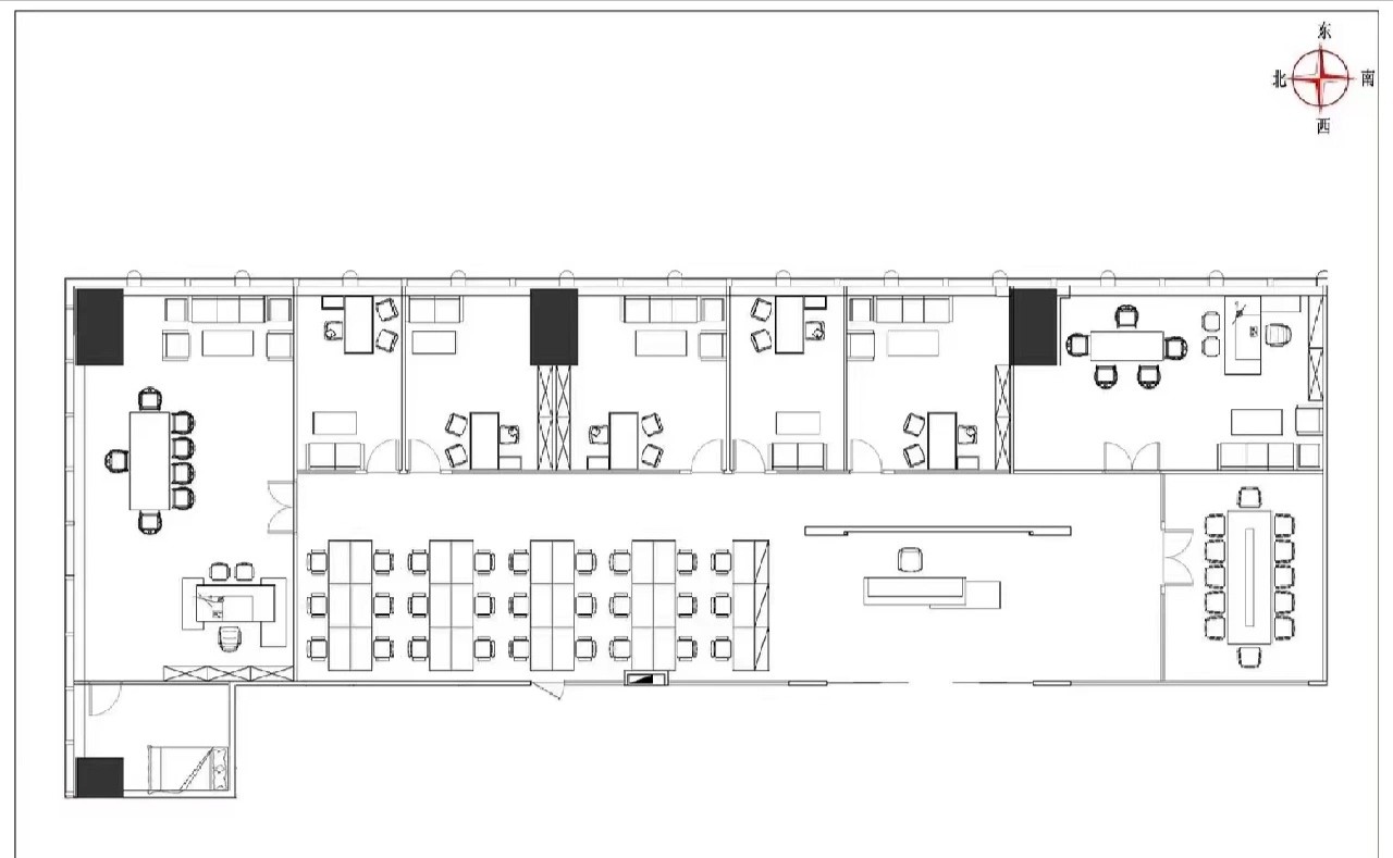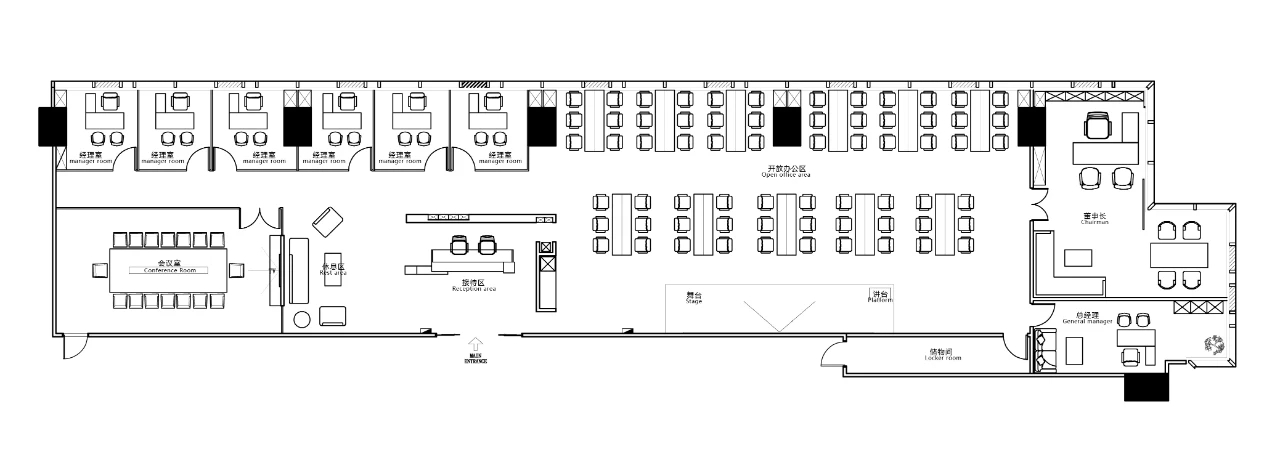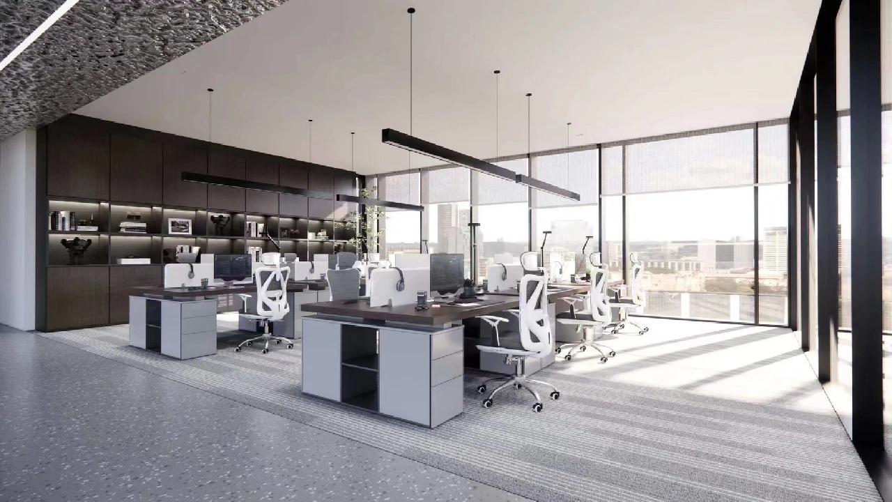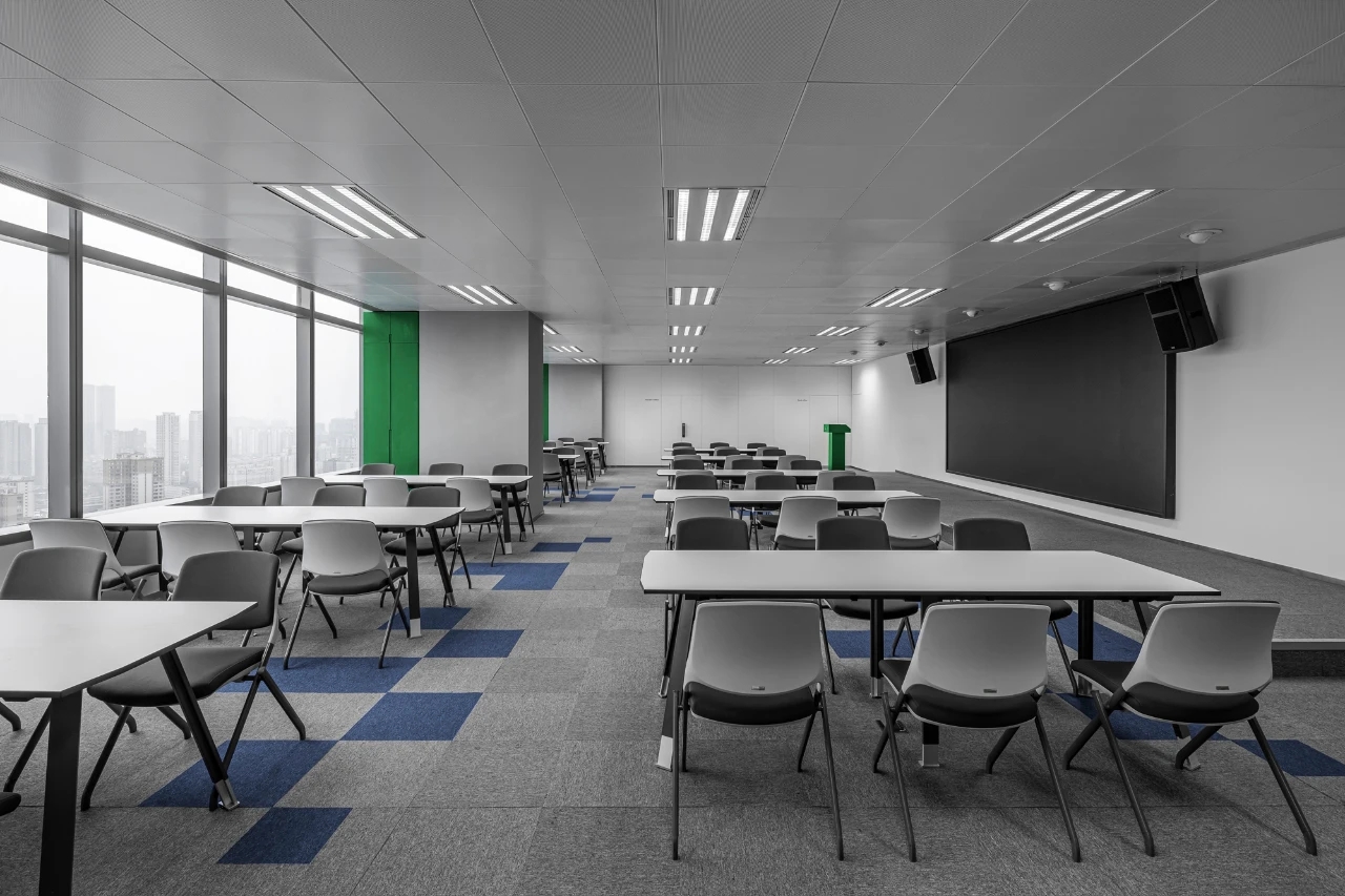 迎合使用的需求,开放办公区将会是一个较为灵活多变的布局规划。兼备独立办公和整体培训以及小组化办公的多样模式,固在设计布局上没有过多的分隔,而保证空间的最大化和无死角的视觉体验。地毯的设计采用了像素格的理念,运用蓝色点缀在大面积的灰色其中,给空间增加了些许活力。