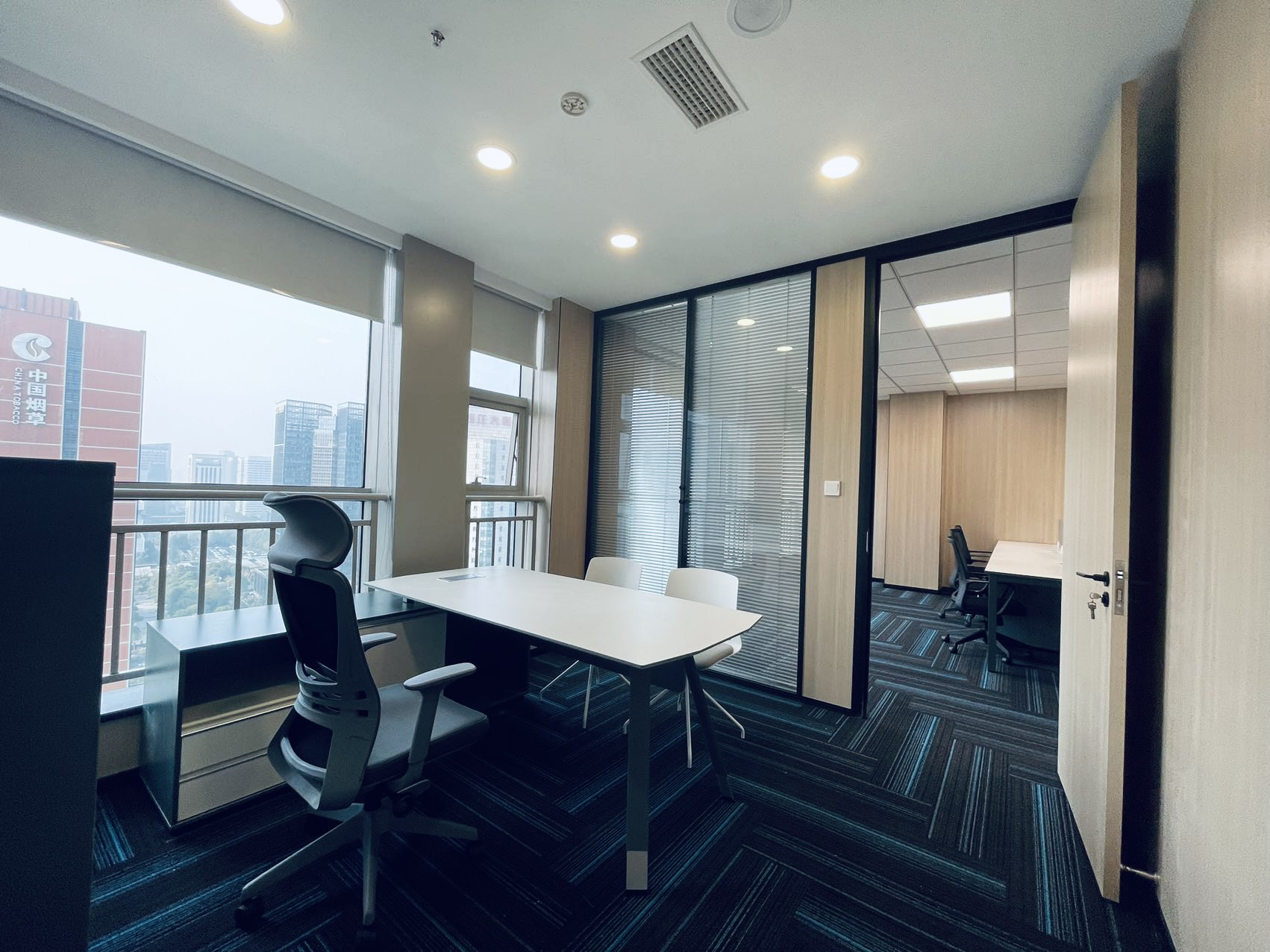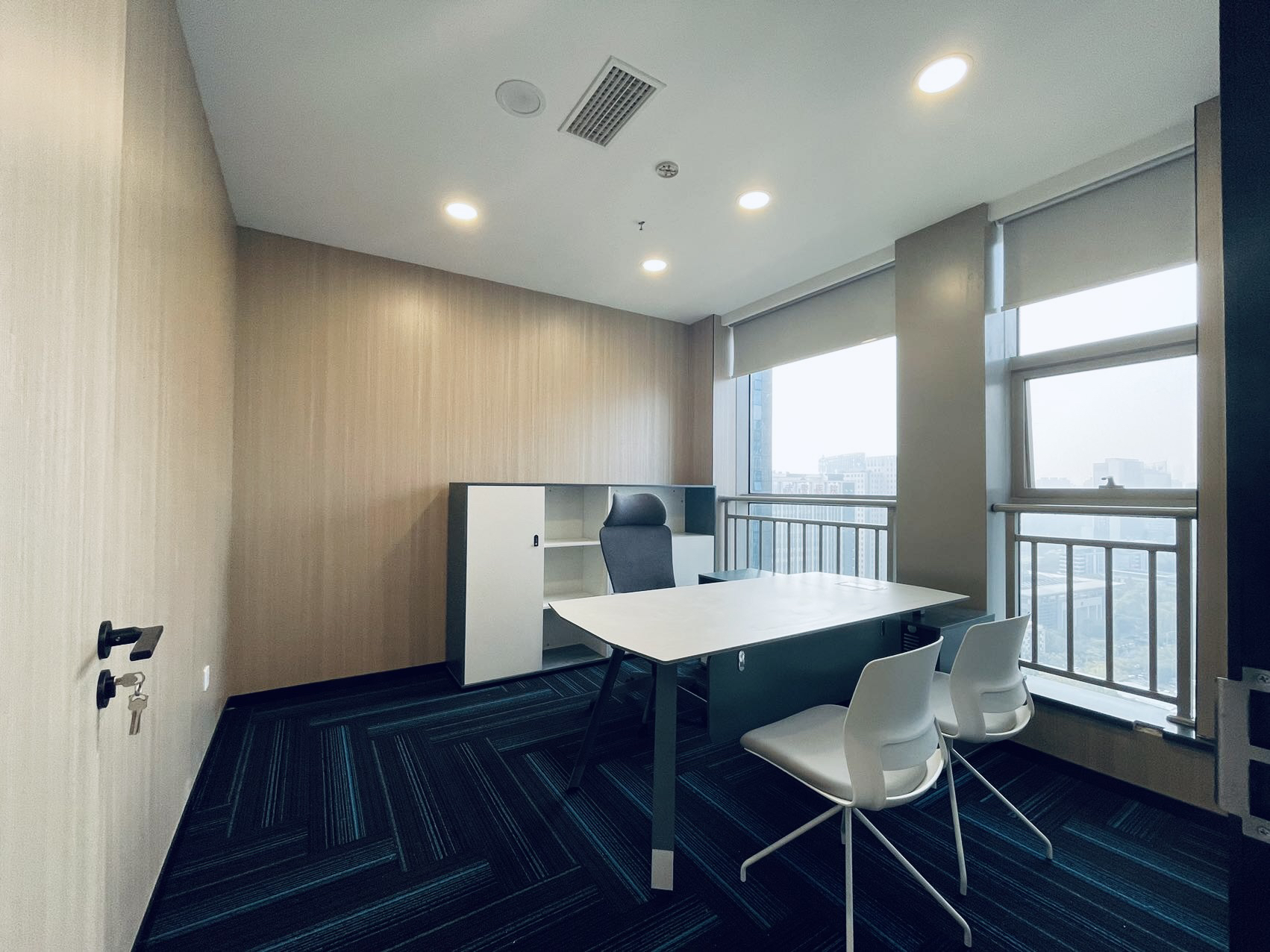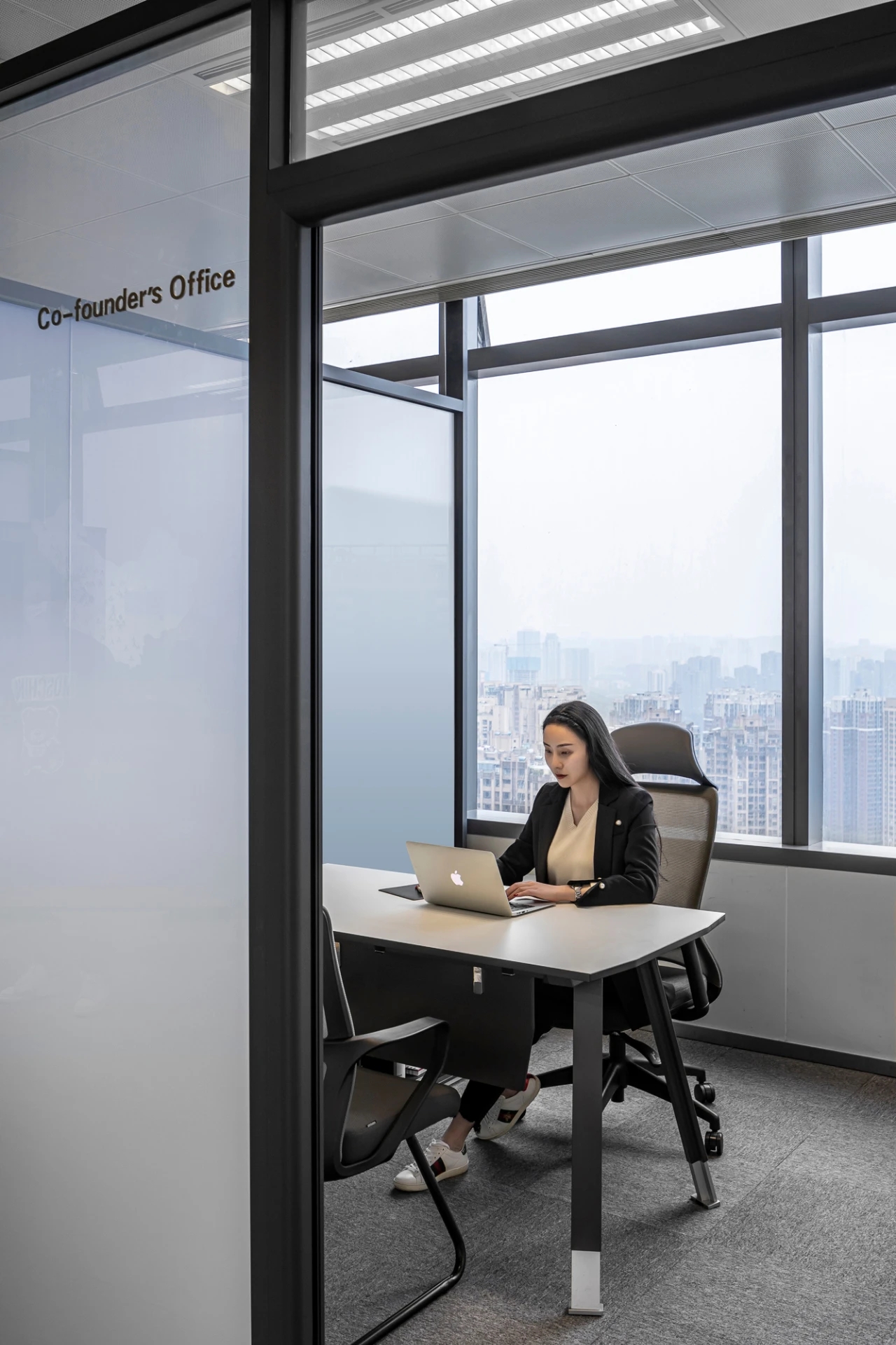 由渐变玻璃分隔的独立办公室,面积不大但将空间最大化利用,鸟瞰城市发展的同时又与过道和开放办公区疏隔有度。透过渐变玻璃看到办公室内的场景及人物多了一分朦胧如纱的浪漫场景。