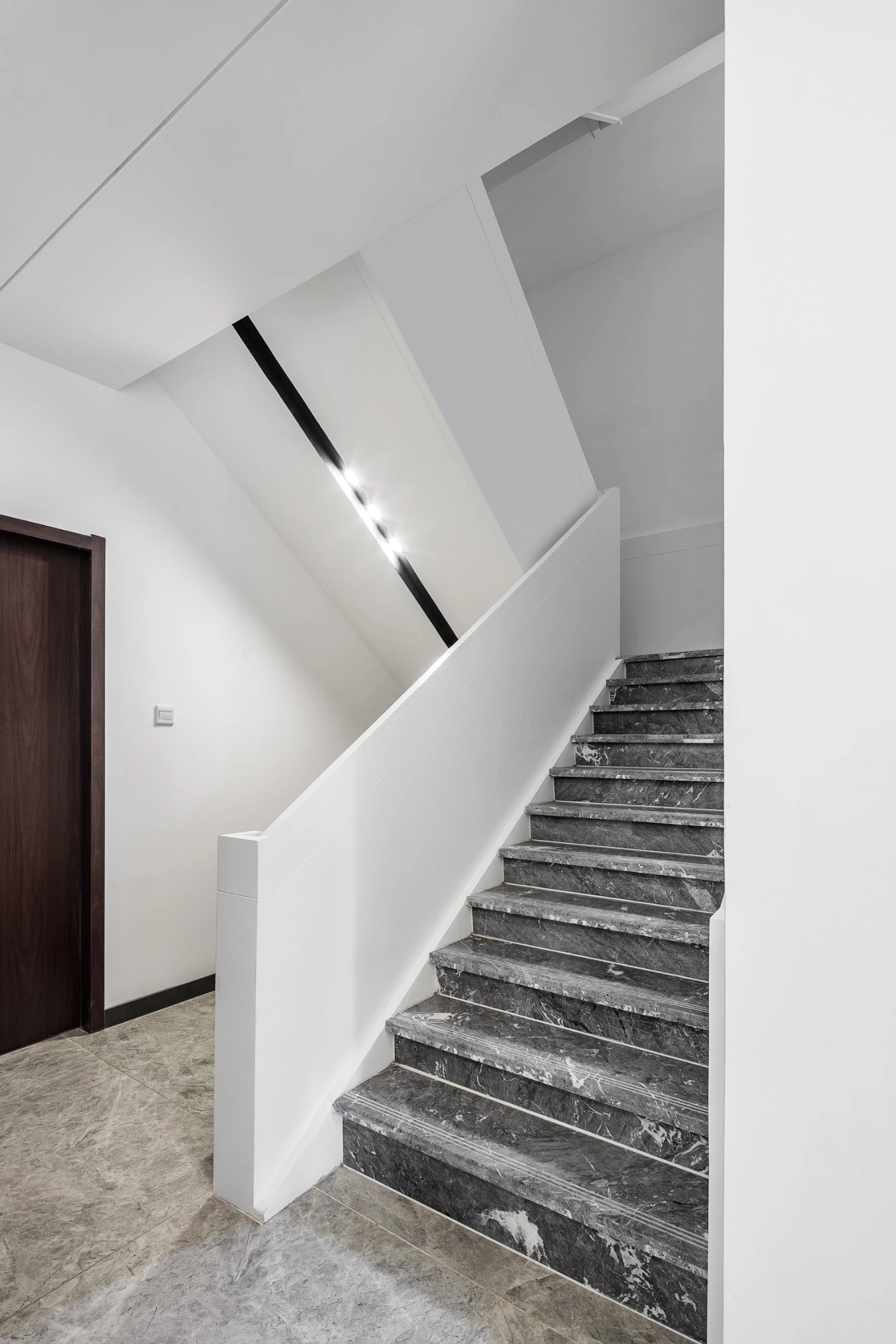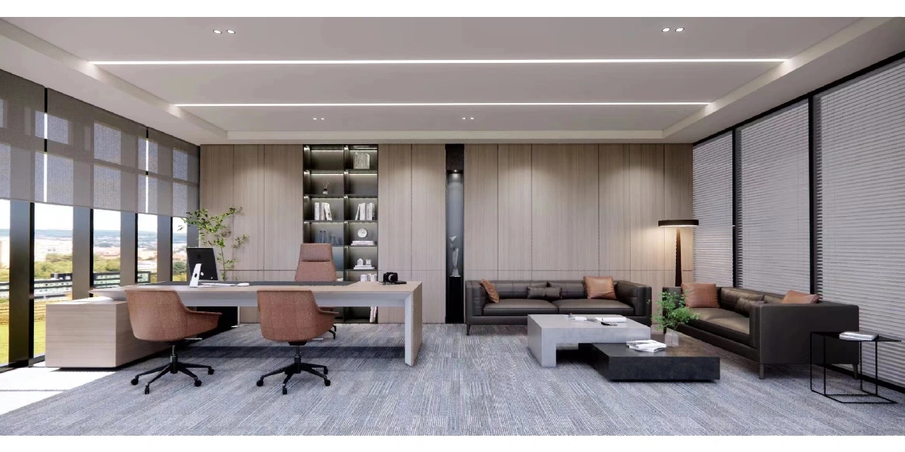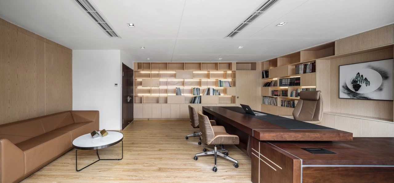 三楼来到董事长办公室,进门两面上顶的书柜是董事长众多书籍的海洋,喜欢阅读喜欢书香的他希望在工作之余也有一个可以静心学习的氛围。在书柜的一侧设计了一道暗门,里面是董事长的休息室,工作台对面的洽谈区设计上采用了木色墙板,与书柜和地面色彩统一,结合浅咖色的沙发整体相得益彰。
