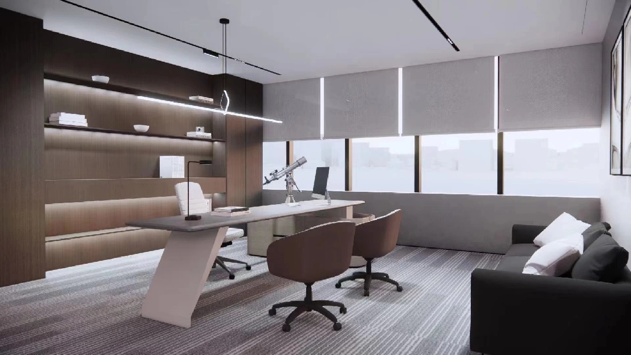 二楼总经理办公室商务时尚,绿色的墙面生机勃勃,半高的围合式背柜功能强大,包围感极强,木色的地板温馨舒适,天花的线条明快硬朗。办公室的采光极好,阳光上午和下午都可以进入空间,产生不同的光线效果,给一天的工作带来些许轻松愉悦。