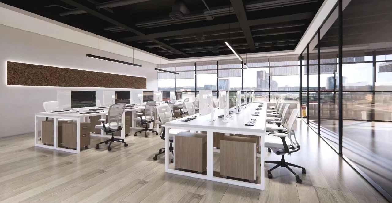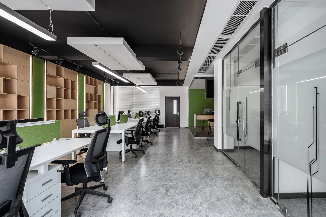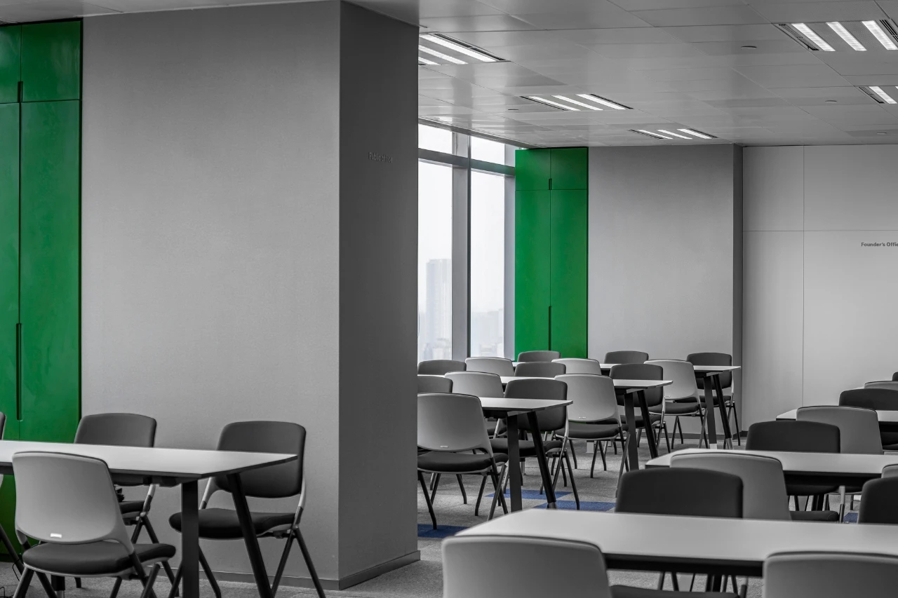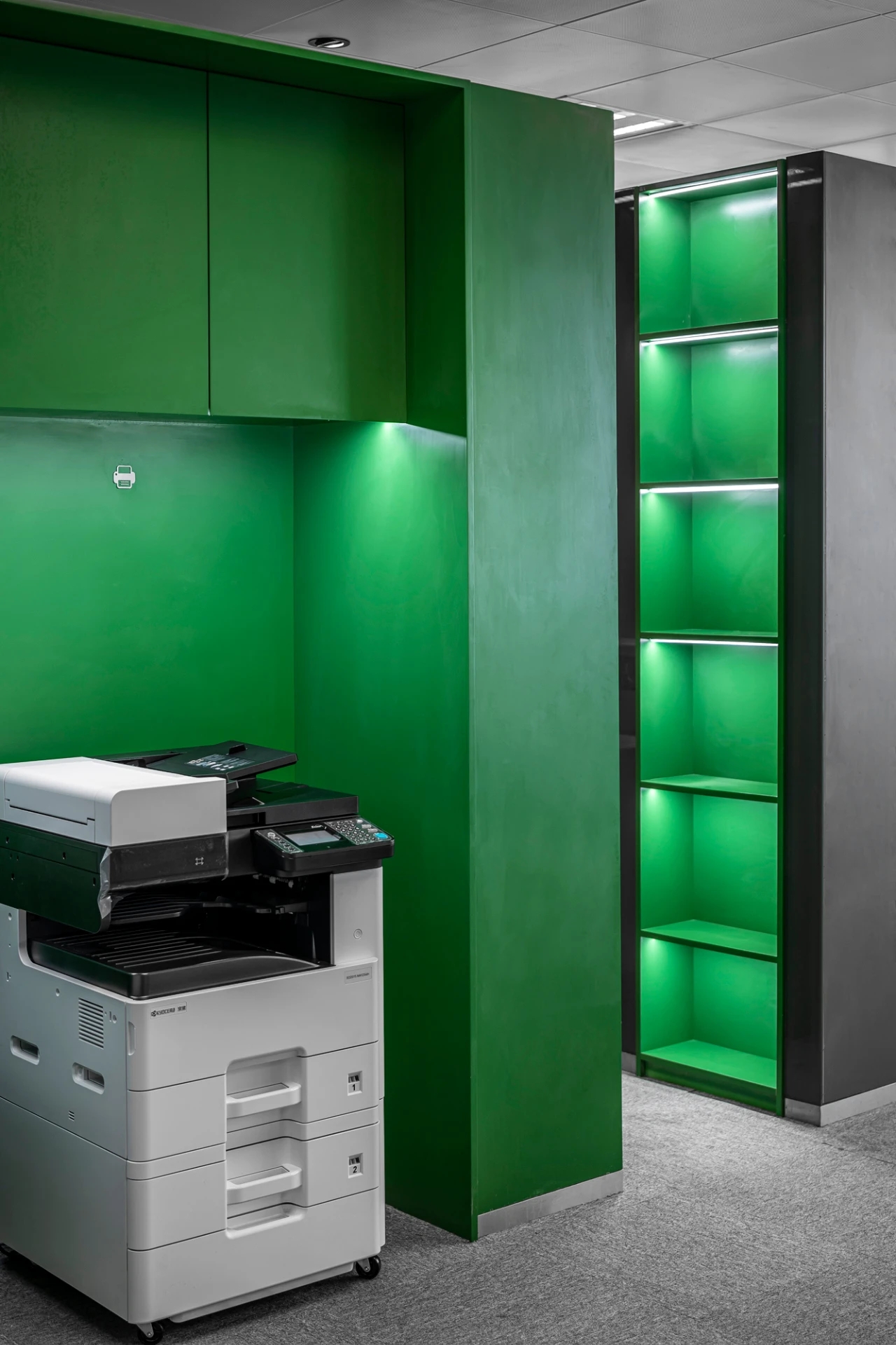 二楼来到企业的办公区,开放的办公分区结合开放的文印休闲区,各自独立但又联通。办公区一整面格子柜间隔绿色的软木布板给空间带来了活力和变化,同时也解决了储物的功能和小组讨论和记录便签的功能。文印区则大面积采用绿色布板,地面和天花都分区与其他空间,黑色的操作台转角到吧台,在这里可以用餐、喝咖啡、泡茶,给工作空隙的时间一个小憩休闲的空间。