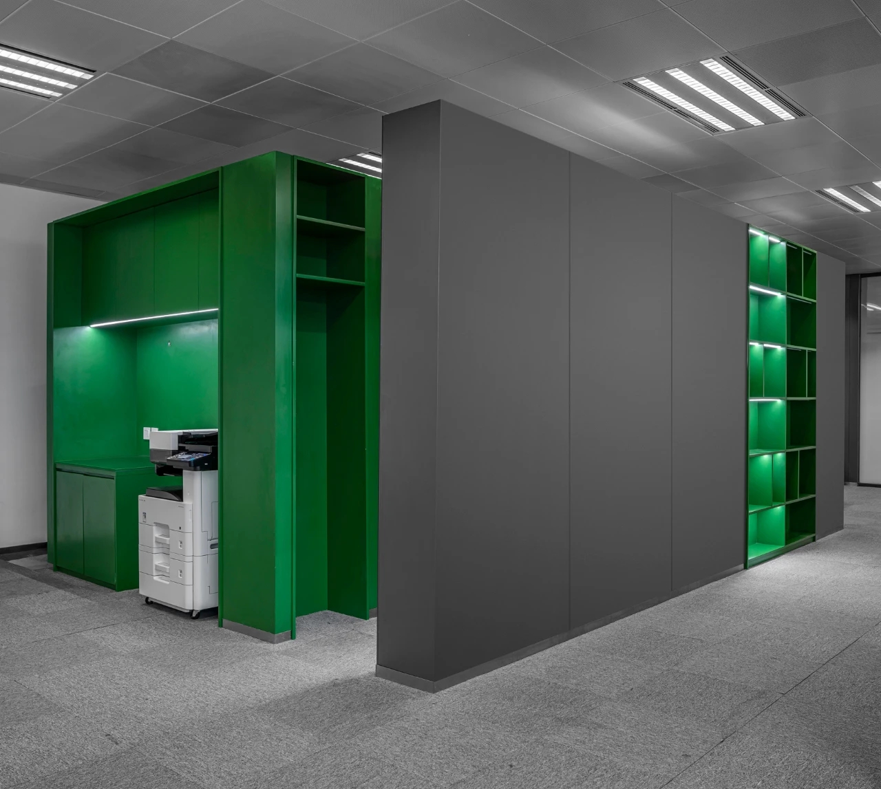 利用形象墙的背面设计了一面荣誉柜,让进入公司的客人在过道来回穿梭时都能看到。另一面隔墙则利用背面的空间设计了一组文印柜和咖啡吧,侧面预留了放置饮水机的位置。这里面对开放办公区,又与吧台联通,可灵活的兼顾休息区和开放办公区的共同使用。整体统一的灰色绿色搭配让空间整体性极强,不同的颜色区分又把各自的功能划分开来。