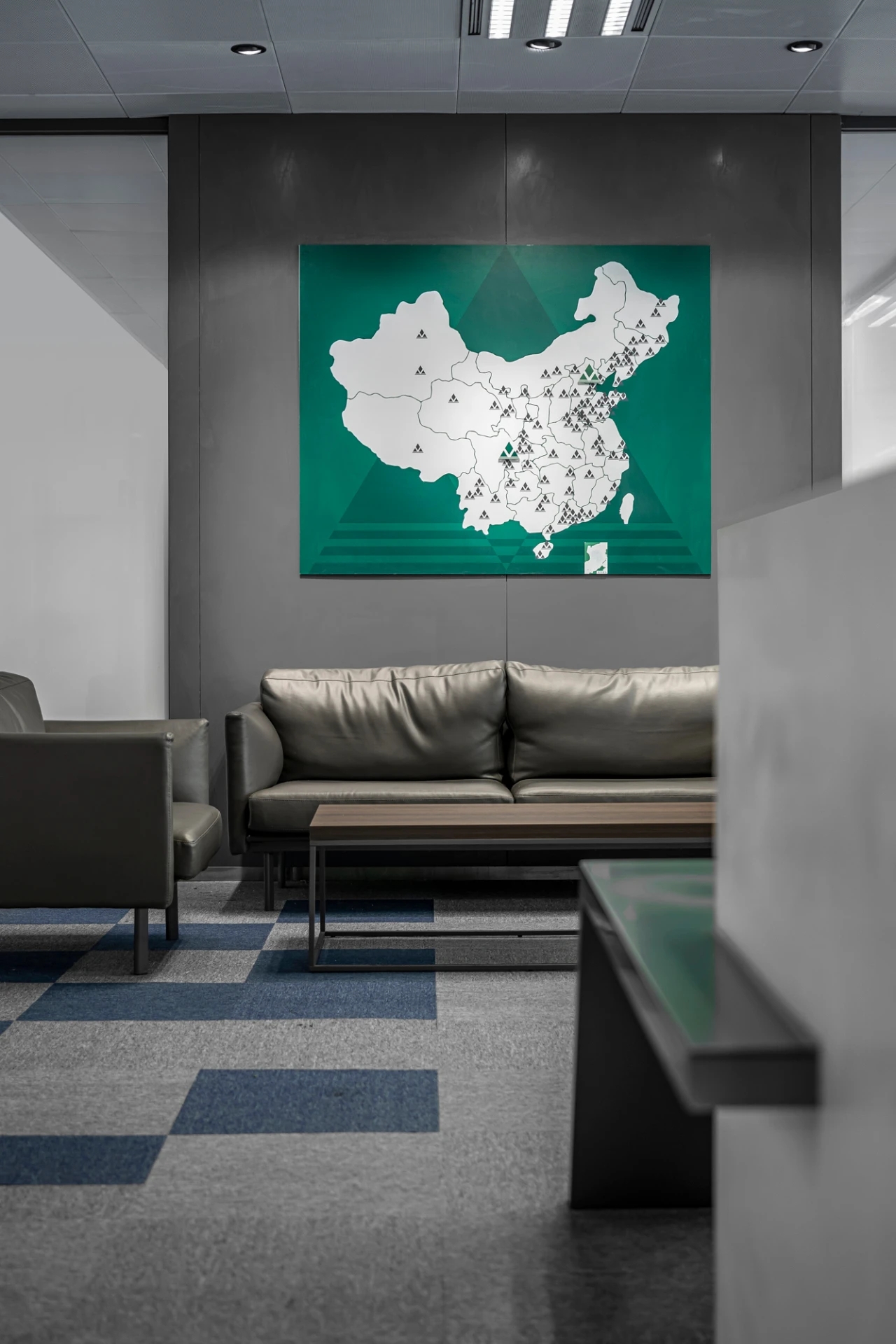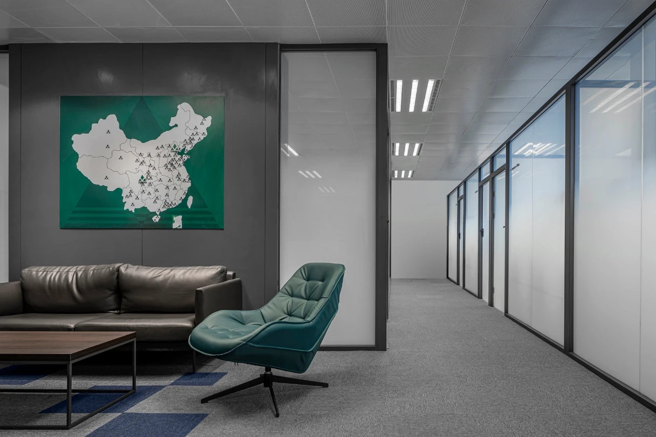 门厅的左侧来到休息区,灰色的墙面上一幅绿色的企业布局图格外醒目。渐变玻璃的设计让过道空间更加清新优雅,也将室外的采光更好的引入室内,同时保持了相对的私密性。