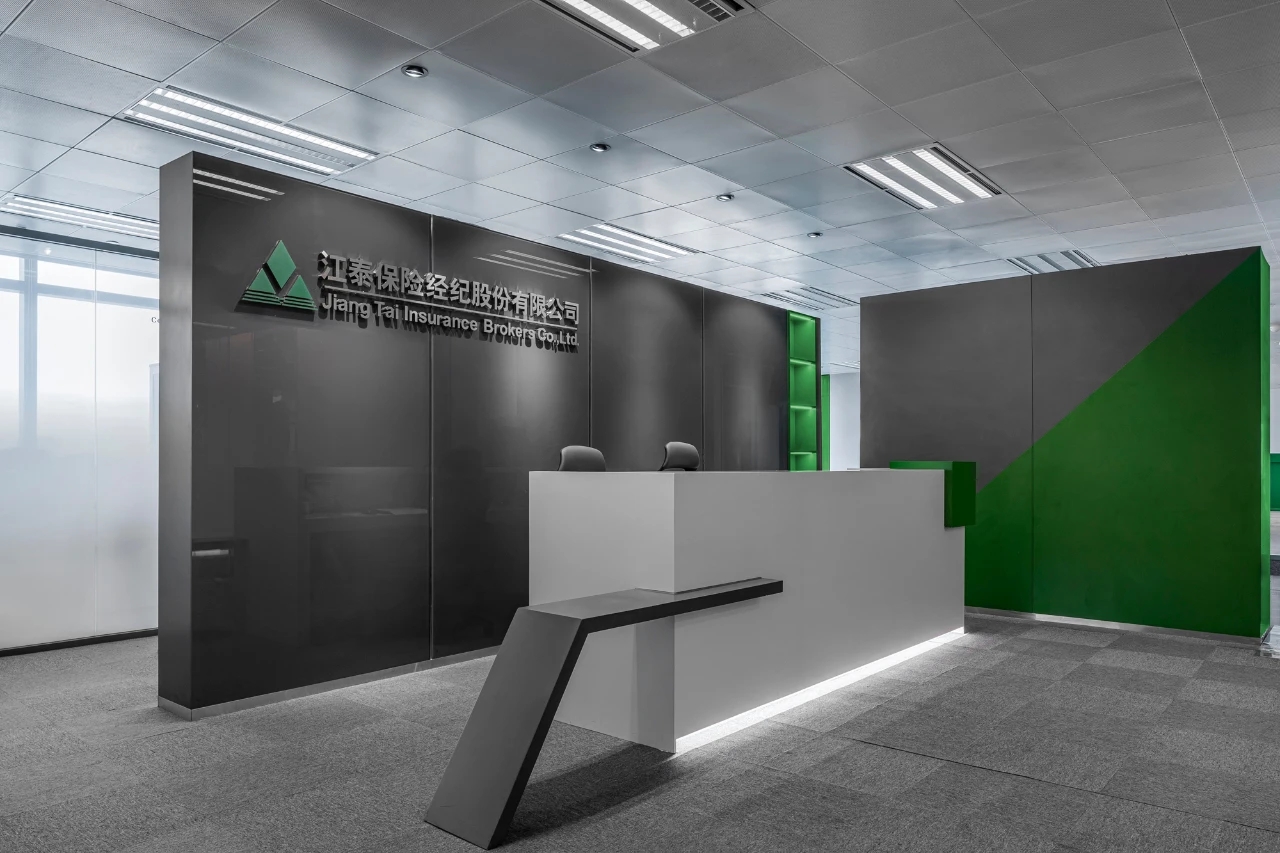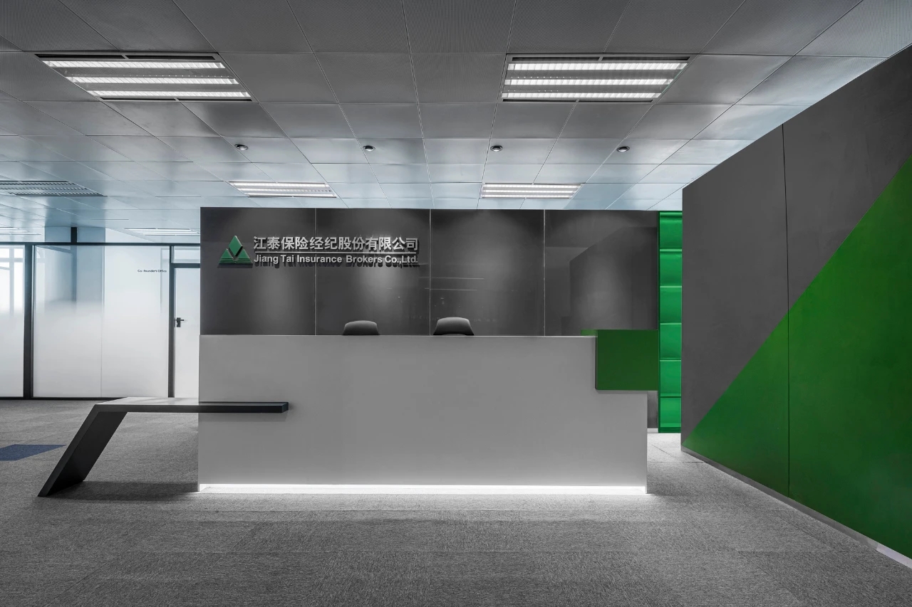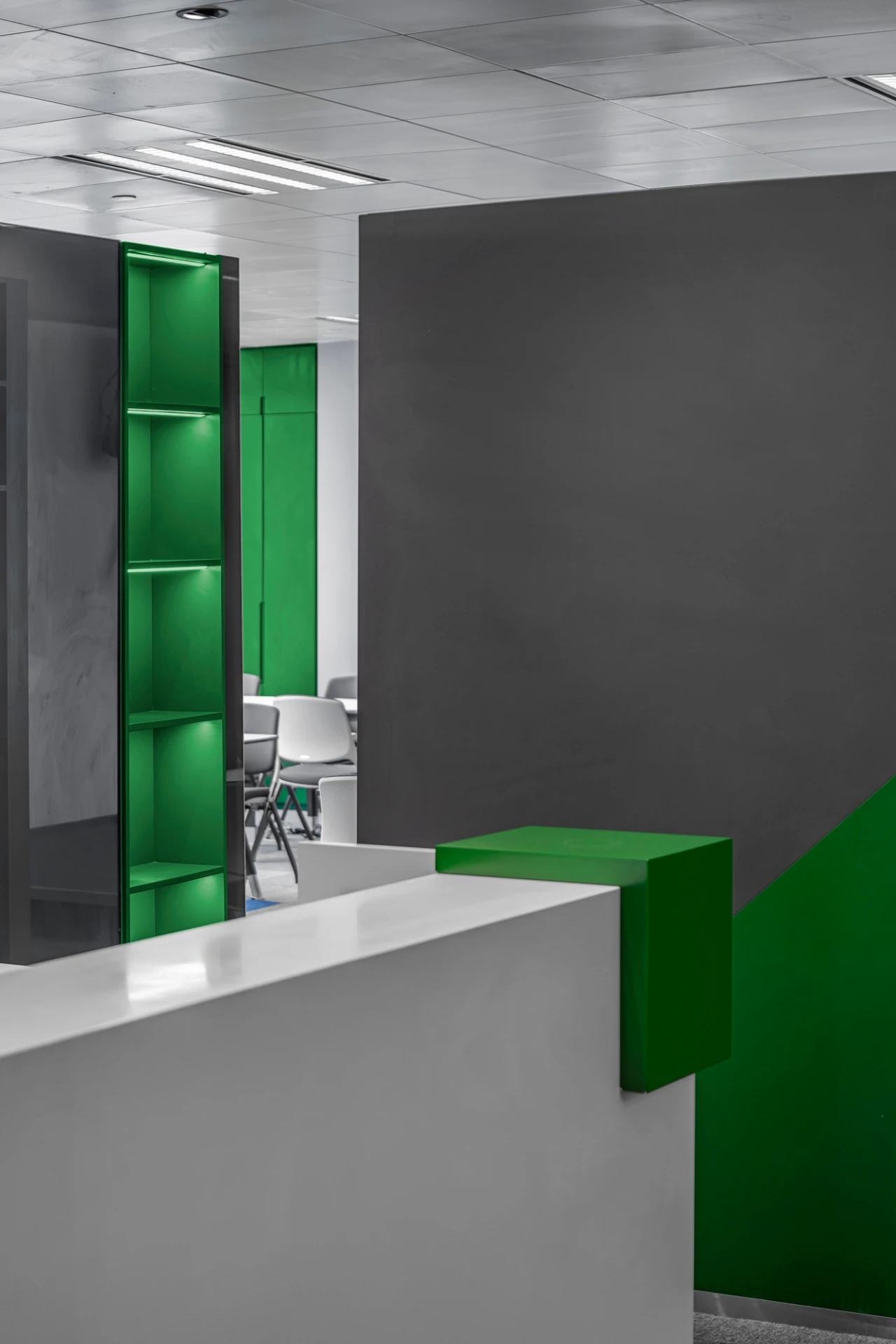 开启电梯来到企业的门厅区,运用半高式隔墙的手法通过两面独立的柜体墙将空间功能分区。灰色的背景墙将背后的自然光线阻隔,让近距离的视线感受沉浸稳重,两边透出的光线又让空间显得灵活通透。运用三角形和立方体的结构特点设计了吧台和墙面的构成元素,绿色作为企业的主色调贯穿始终。