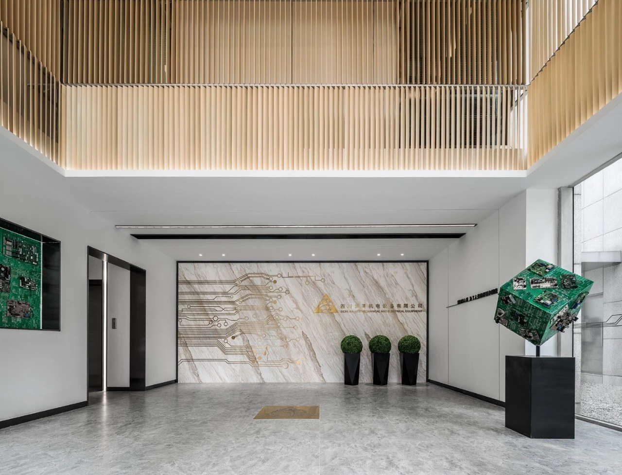 设计运用灰白色为主基调,金色及绿色作为点缀,让空间层次分明。其中最值得的提出的是大厅挑高的天花造型,设计灵感来自于空调的出风口百叶片,环绕天花四周,百叶片分为上中下三层,每一层吹向不同的方向。大厅背景墙也是一大亮点,科技感十足的金色线条穿插交错,代表着电路芯片上的一次次挑战和创新。大厅一侧还放置了一个醒目的立方体,设计师亲自动手制作,将研发部门工作中所采用的废弃电路板和芯片主板拼接粘贴成为一个科技感十足的芯片魔方,通过支杆设计悬于空中,这也正是设计师眼中最符合爱得机电独一无二的装置艺术作品。爱得机电正是一家制造研发空调核心技术的科技制造企业,我们抓住了企业的核心理念将其通过视觉传达给每一个客人。
