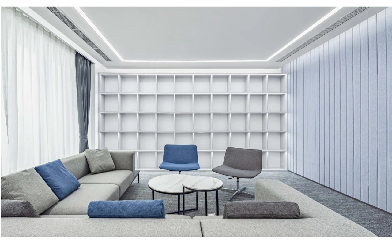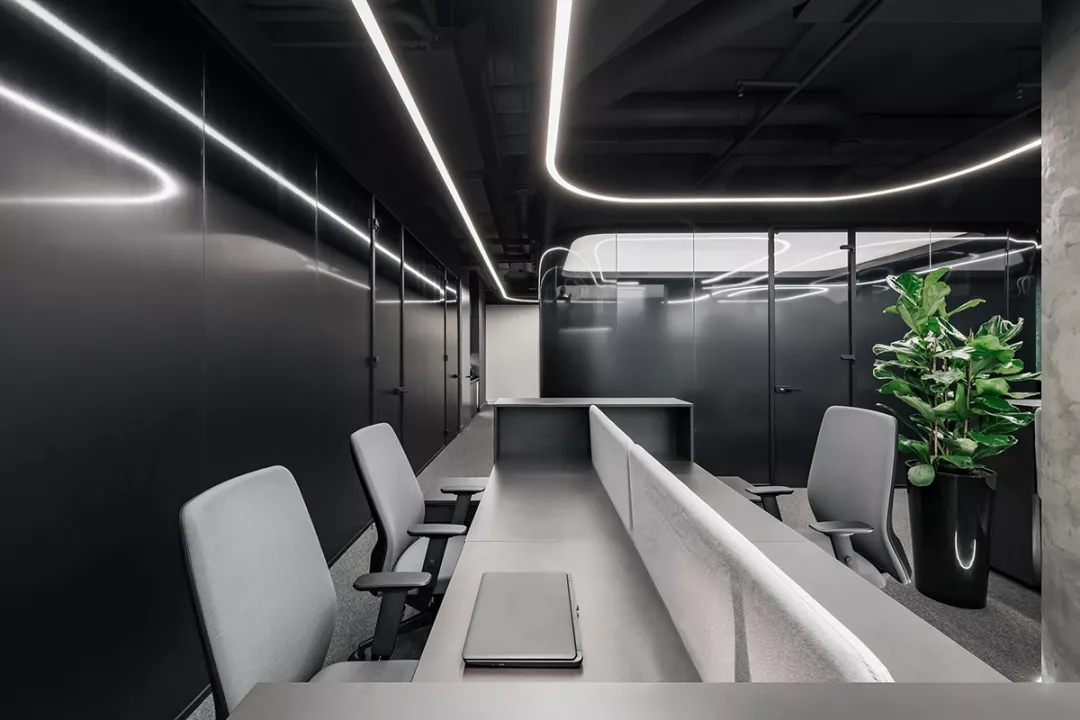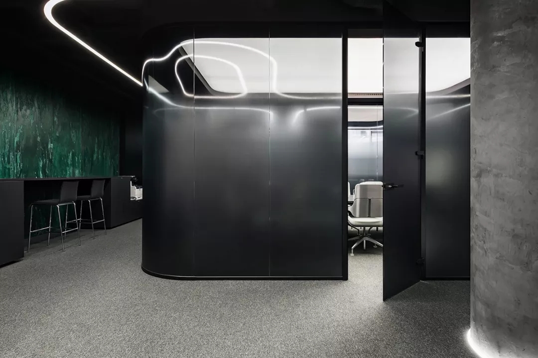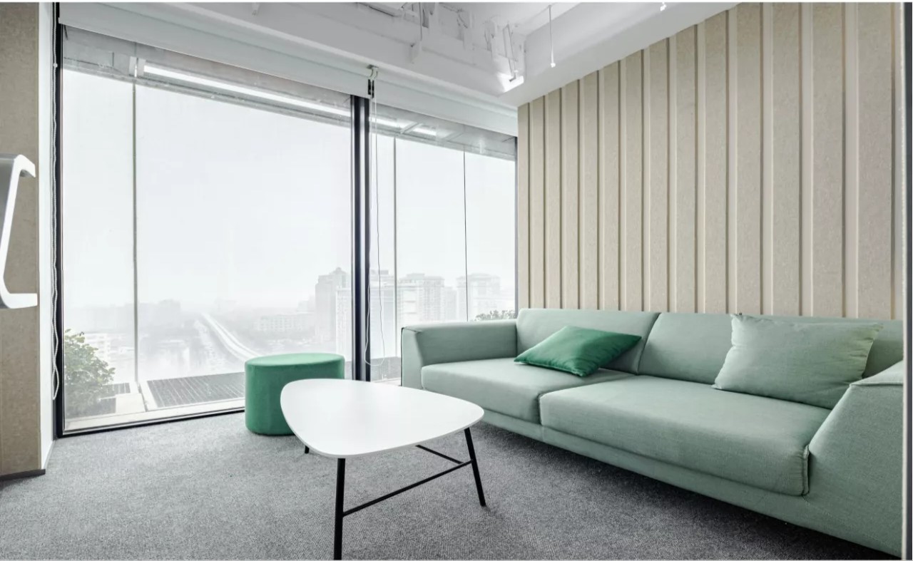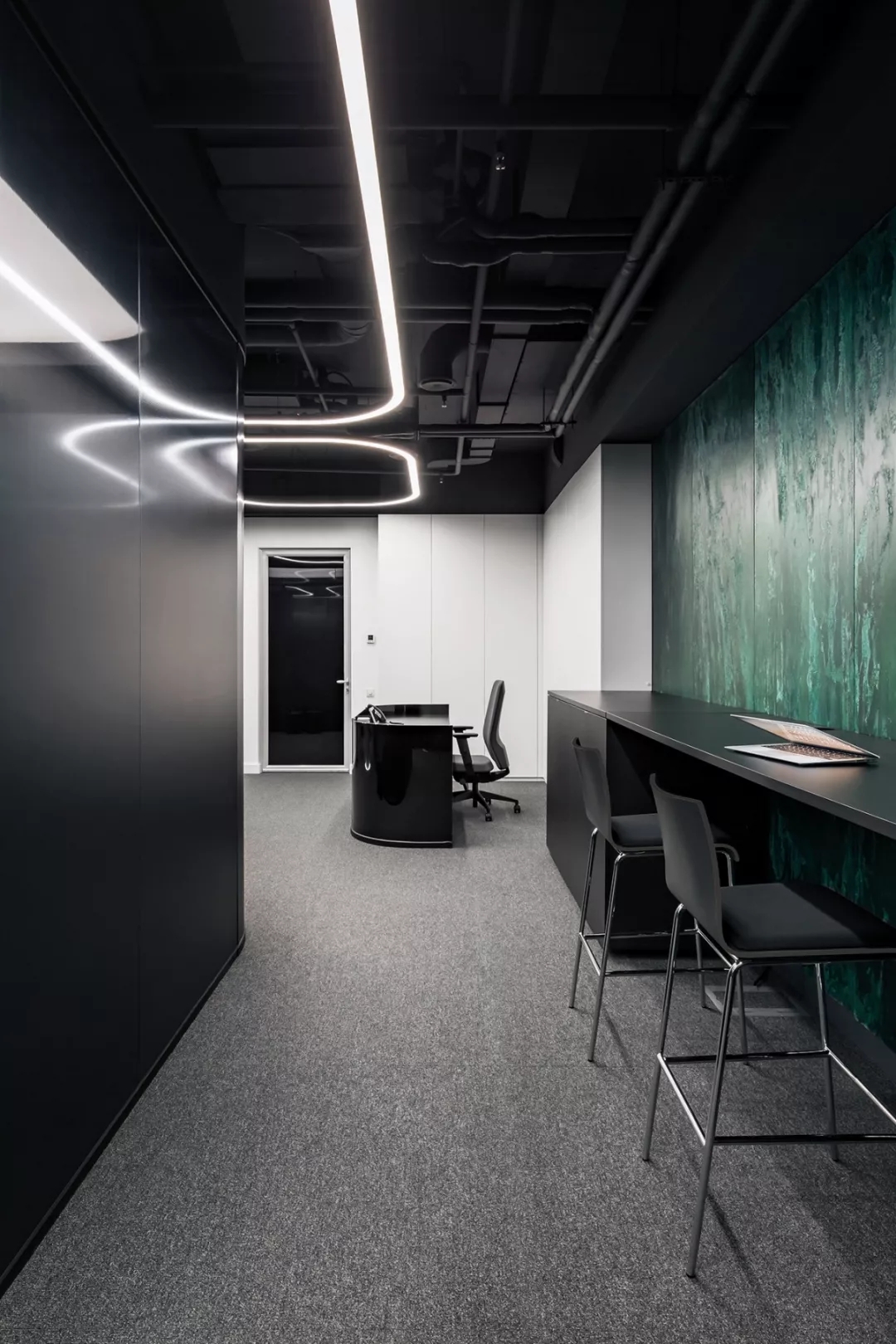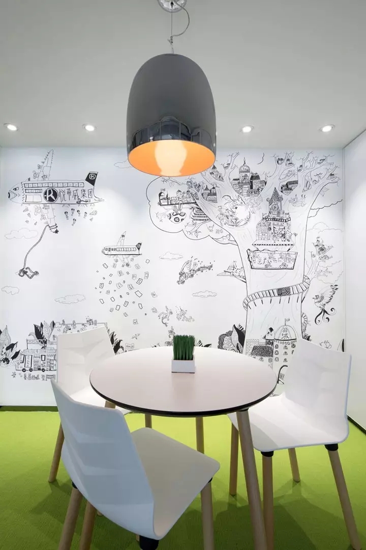 有两面墙是儿童白描手绘了这里的梦想,洽谈室是表达企业文化的茁壮大树向上的主题,办公区则是表达企业未来无限可能的游乐王国的主题。以“白、灰、绿”的色调融合简洁的线条呈现了现代办公美学空间的格调,在有形的场所中领悟无形的精神“喜悦、乐趣、宁静”。这里是梦想的开始,一个绿色的梦。