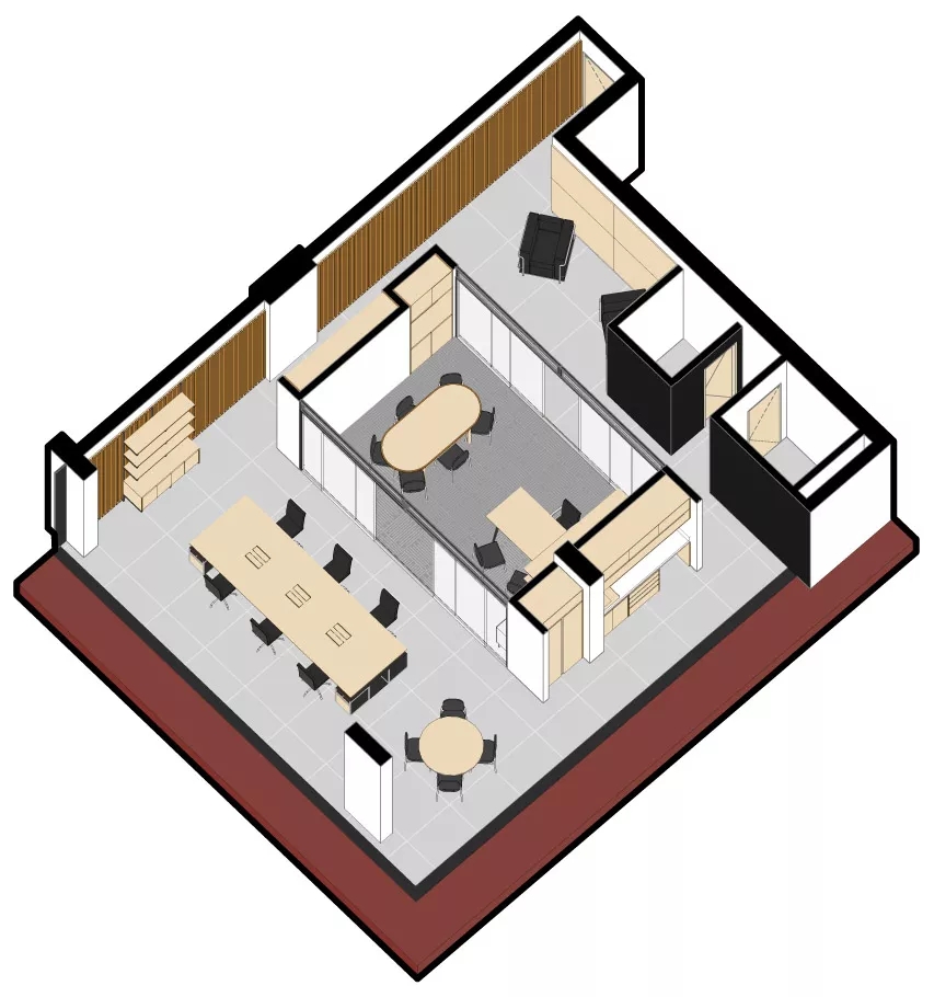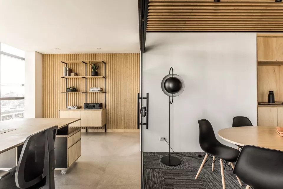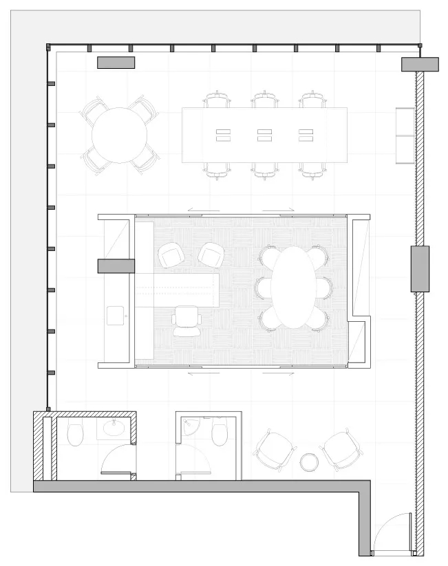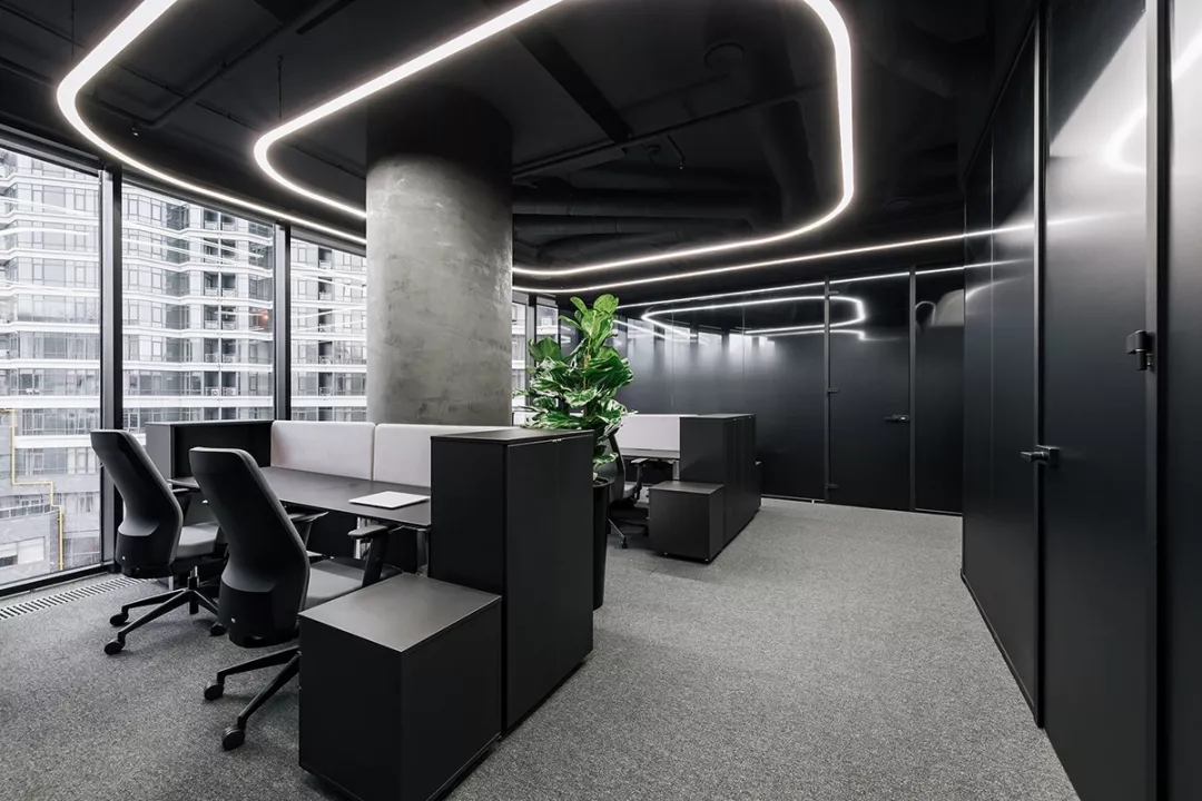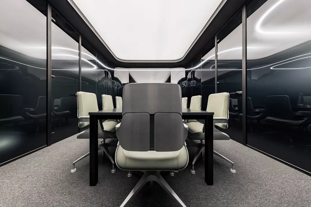 项目最大的挑战是房间中央区域作为支撑中心体量和划分空间组织的中心柱。而余下的挑战是客户需要一间封闭的会议室和一间封闭但同时具备开阔视野的办公空间。解决方案是利用沿周长设定的交通空间串联起整个项目的空间。设计师在现有柱子的位置建造了两堵平行的墙壁,墙中包括储藏空间、档案空间和一个位于中央的既作为办公空间又充当会议空间的玻璃盒子。凭借这种开明的解决方案,项目不仅保留了面朝整个公园的广阔视野,并且还保证了房间内充足的自然光线。