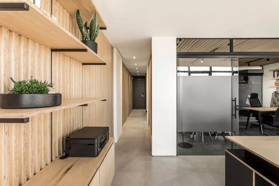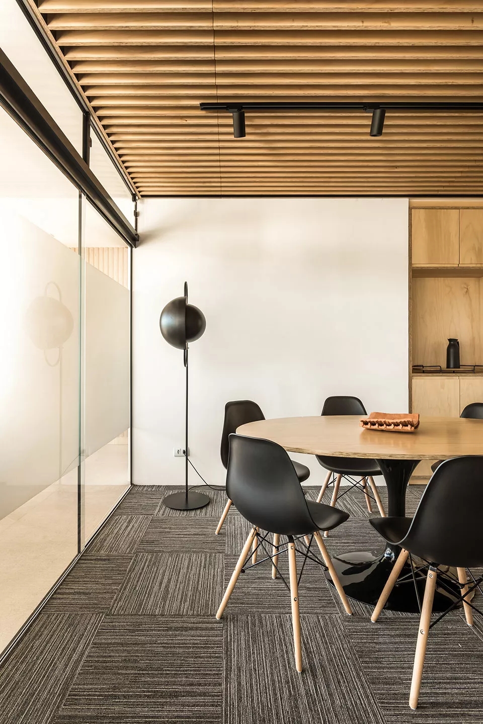中央空间由轻质玻璃隔断围合而成,无论在房间任何地方都能获得较好的视野和充足的光线。该项目作为一个“陈列室”的最大亮点是对胶合板的使用,设计以包括家具、装饰板材以及内饰等不同的形式展示了公司产品的优良品质和灵活性。与天然木材的色调相比,地板采用了黑色、白色和灰色,因而更加凸显了丰富的色彩和纹理。
