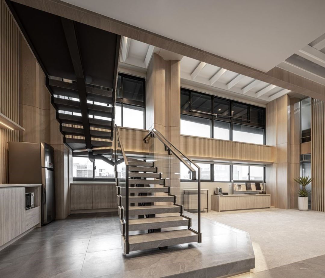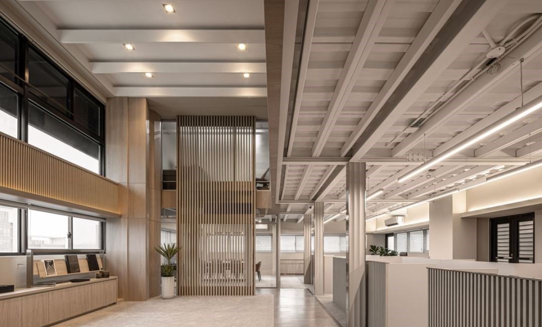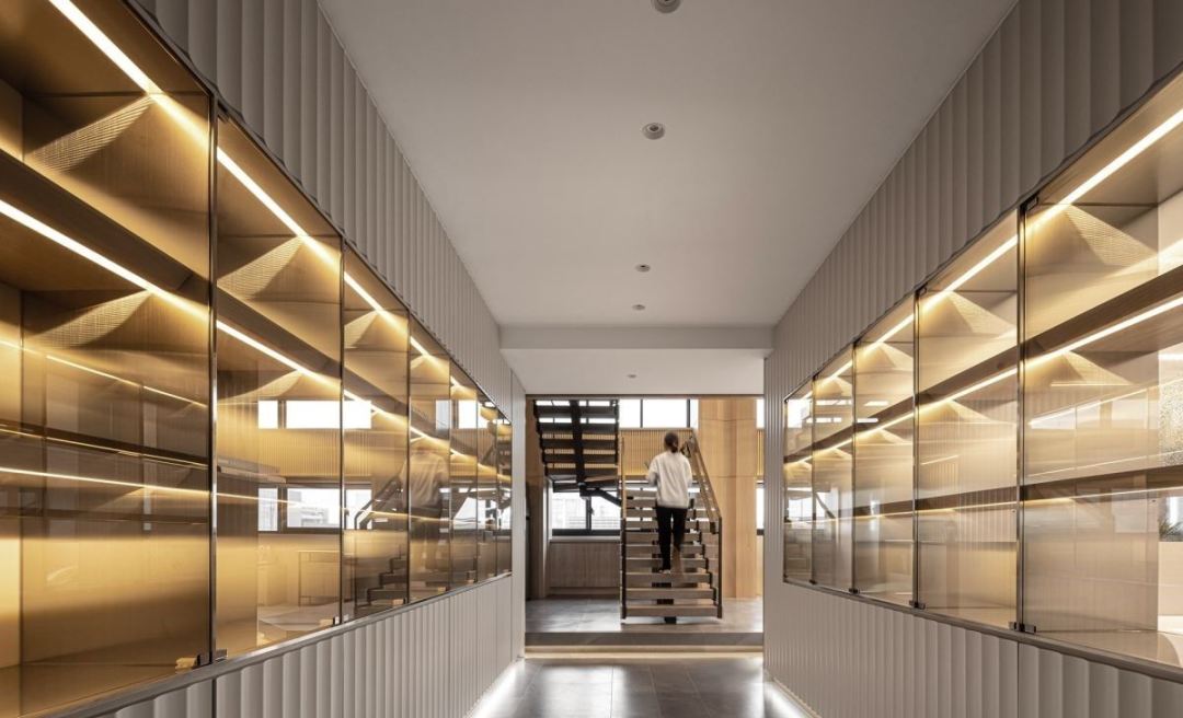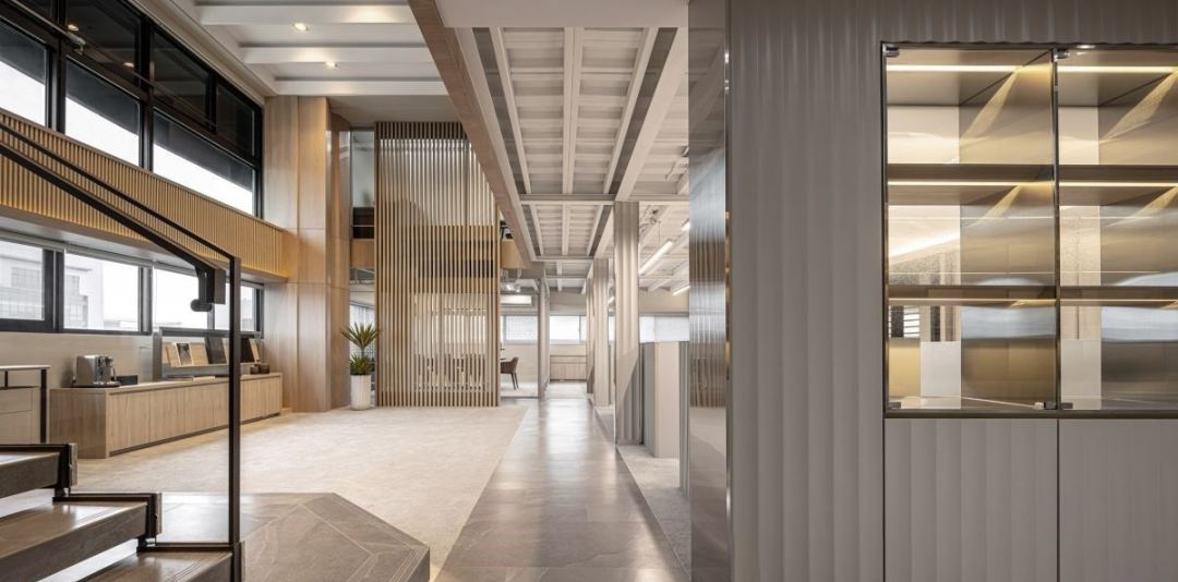长型廊道区连结入口和工作区,将过道的尺度刻意压缩,使挑空的复层式办公区更显放大和明亮,两侧融入展示美学和曲面板的数组效果,型塑简约而利落的科技企业氛围,也富有人文艺术的质感。