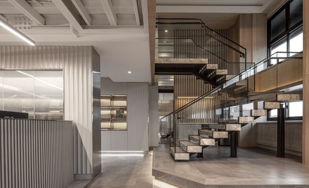 将第一阶特别放大,满足视觉的聚焦以及载体的承托,再结合大理石、金属和玻璃材质,在利落现代的个性气质中,亦展现出轻盈穿透的气势和美感。