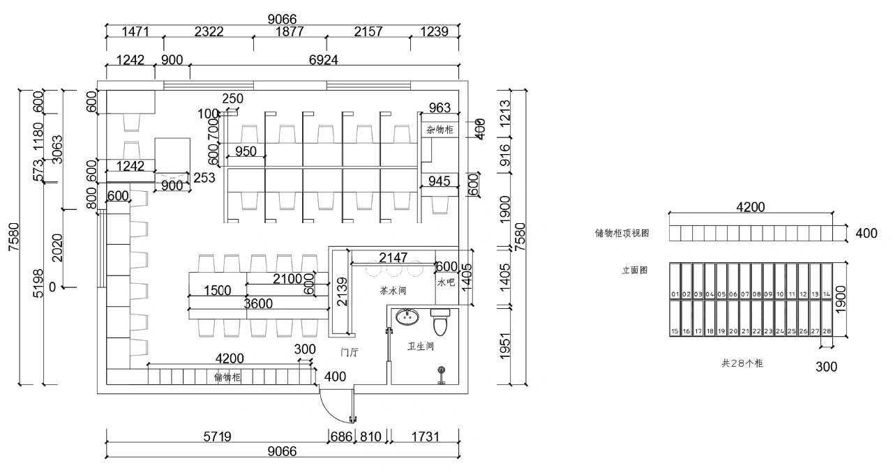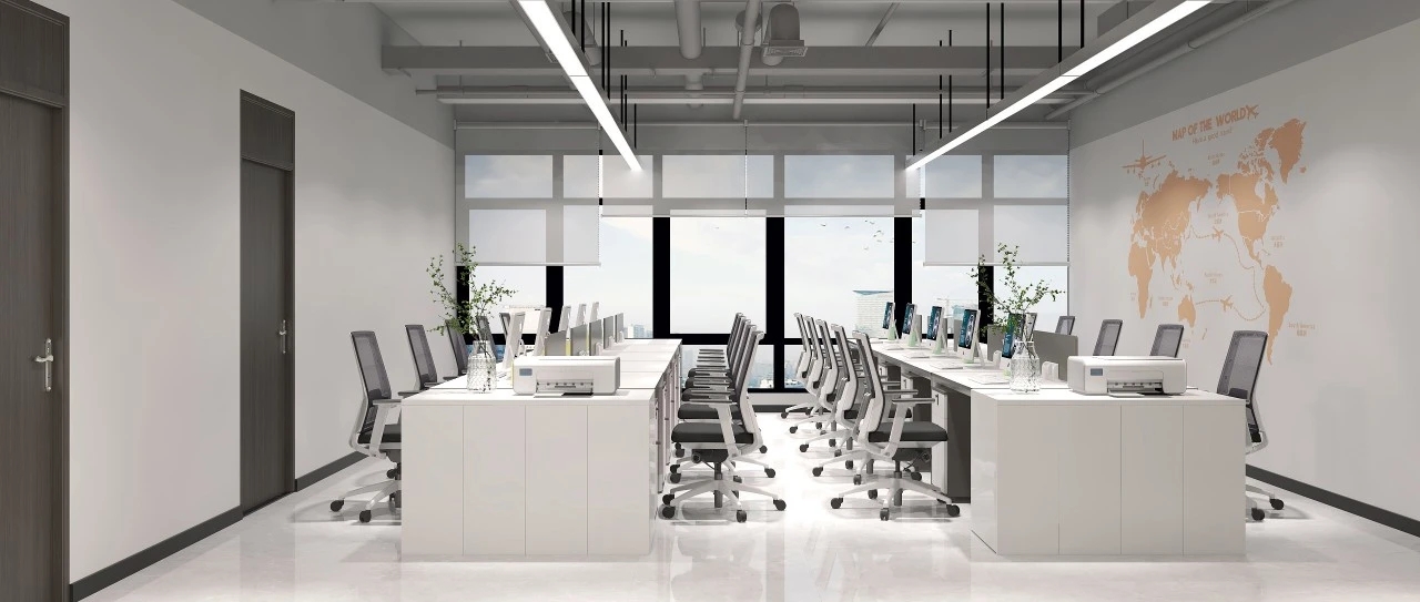 办公区区域采用裸顶喷灰,即扩充了空间感,又有利于采光。