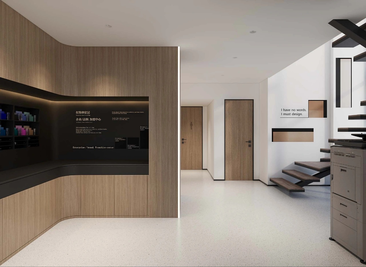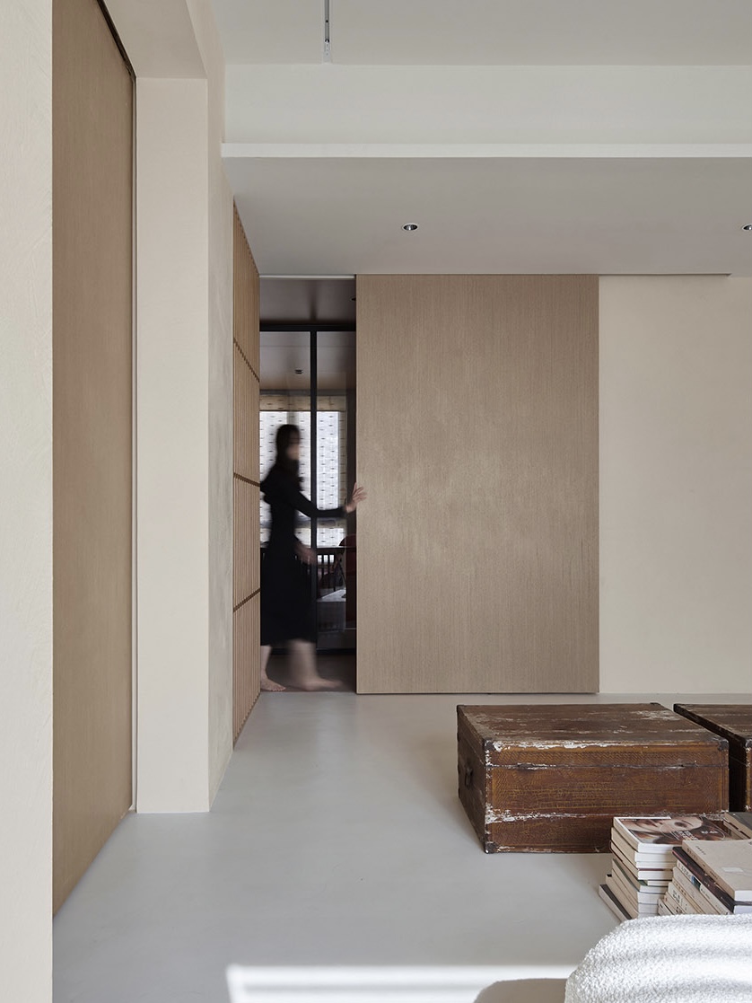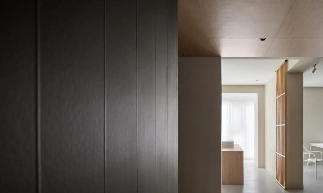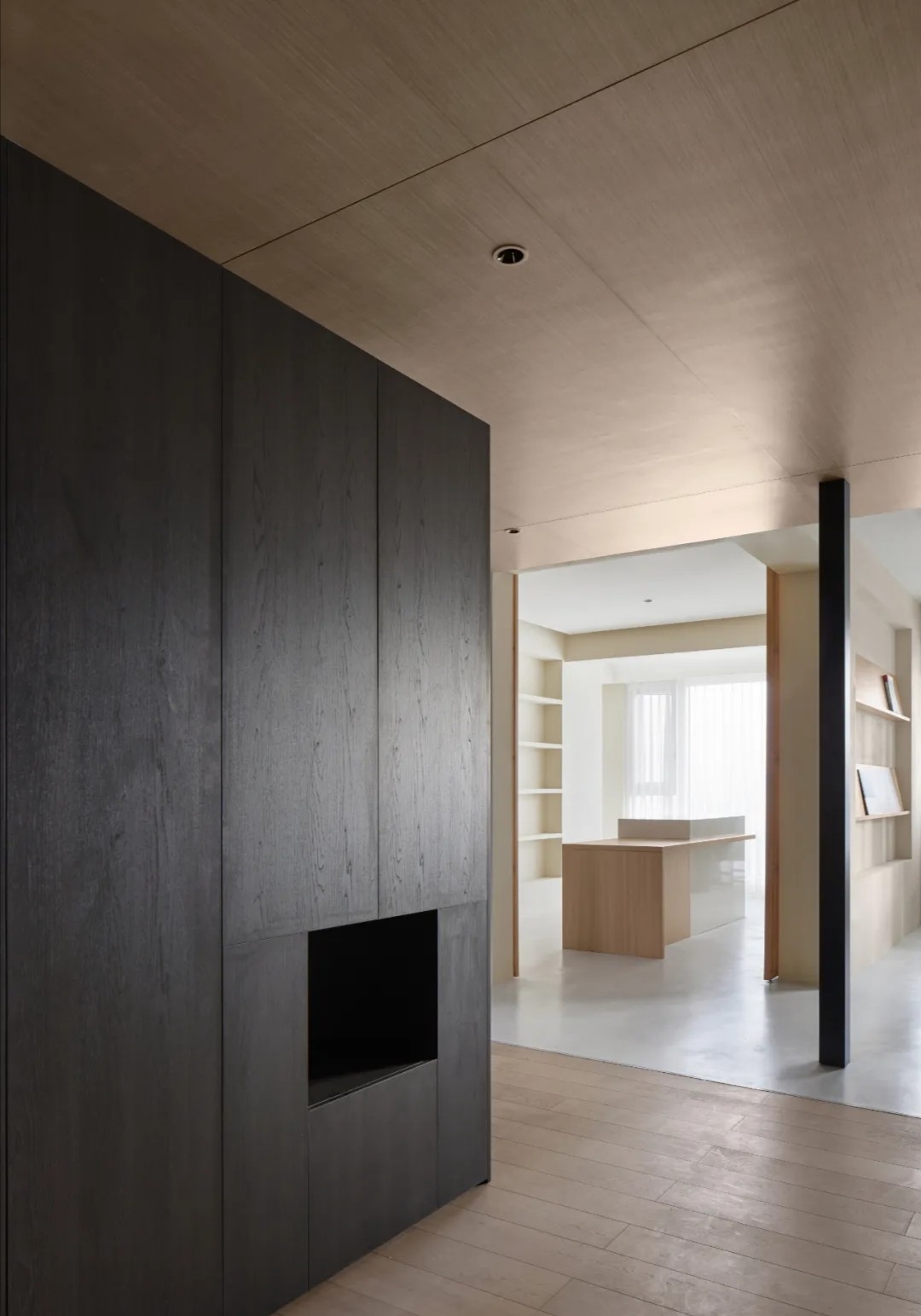 用木质和艺术涂料构建了一个独立的单色空间,希望完全区分开功能分区。而被服务区可以营造一种温暖,轻松,有序的氛围空间。
